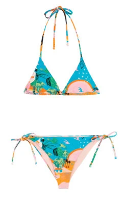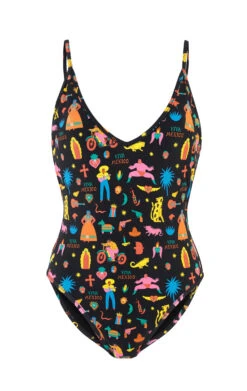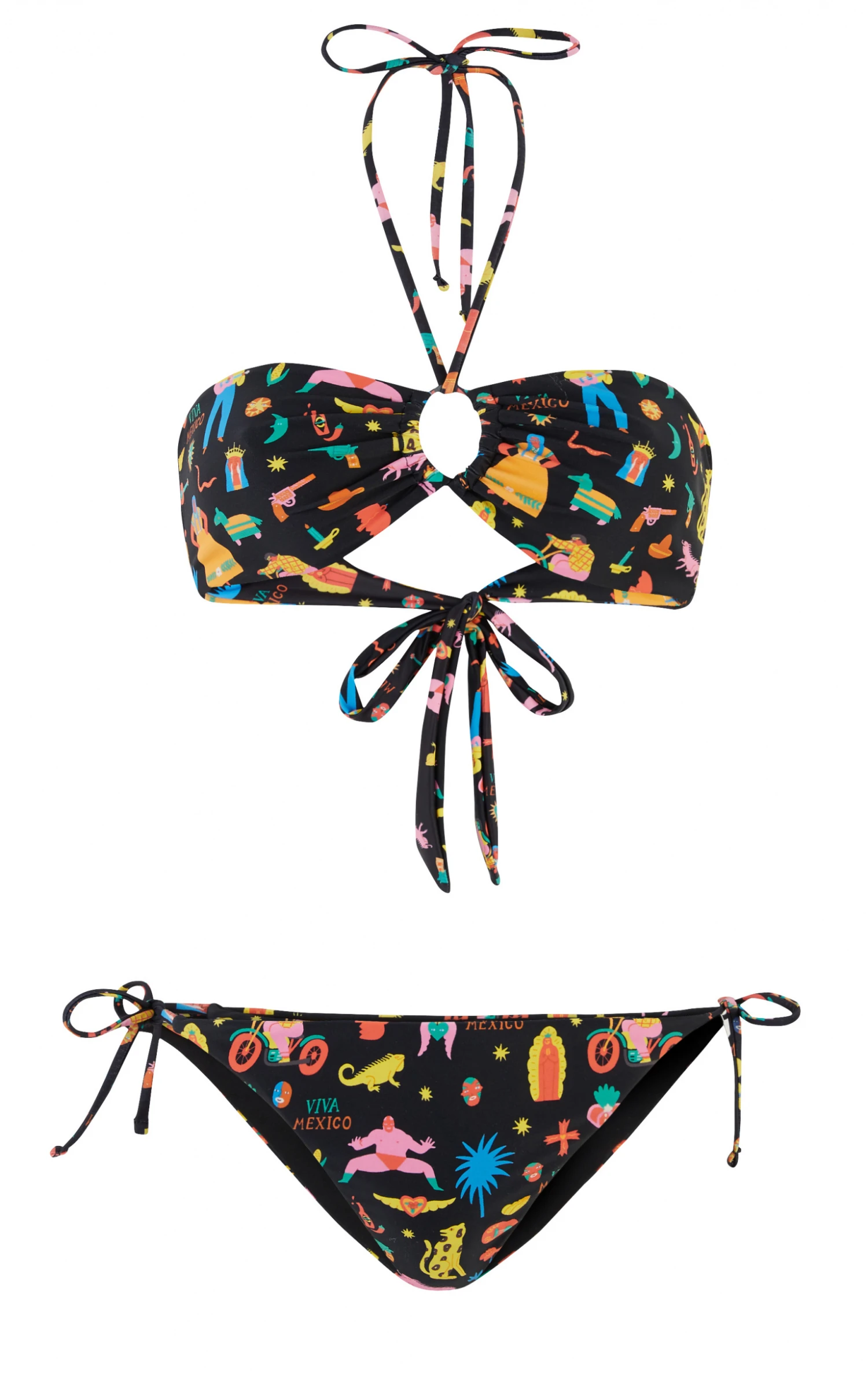 Coup de cœur pour ce maillot de bain deux pièces, avec un haut de forme bandeau. Le laçage démarre sur le devant et se noue au niveau de la nuque, deux cordons de part et d’autre ont la spécificité de bien s’adapter à la taille et de convenir ainsi à toutes les morphologies. On adore son imprimé all-over Mexicain sur fond noir, pour un rendu très décalé chic. Un bikini à associer en total-look avec les autres pièces de la collection imprimé Mexicain, ou avec un jean et sur une chemise ouverte esprit City.