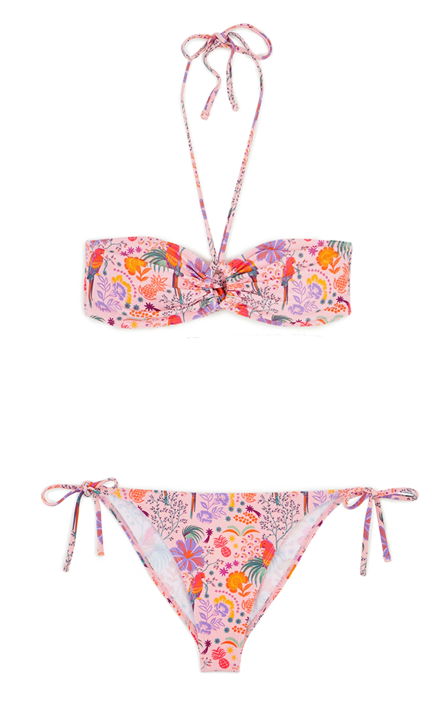 Coup de cœur pour ce maillot de bain deux pièces, avec un haut de forme bandeau. Le laçage démarre sur le devant et se noue au niveau de la nuque, deux cordons de part et d’autre ont la spécificité de bien s’adapter à la taille et de convenir ainsi à toutes les morphologies, assorti à une culotte échancrée pile dans la tendance. On adore son imprimé all-over Babouchka dans sa version rose désaturé vintage. Un bikini à associer en total-look avec les autres pièces de la collection, ou avec un jean et sur une chemise ouverte esprit City.