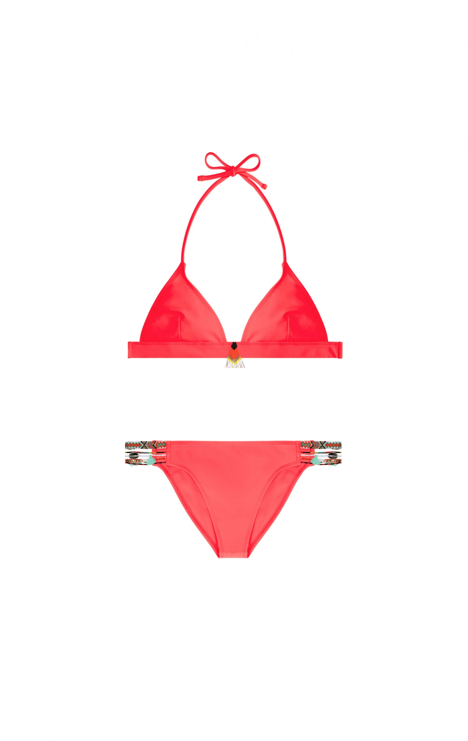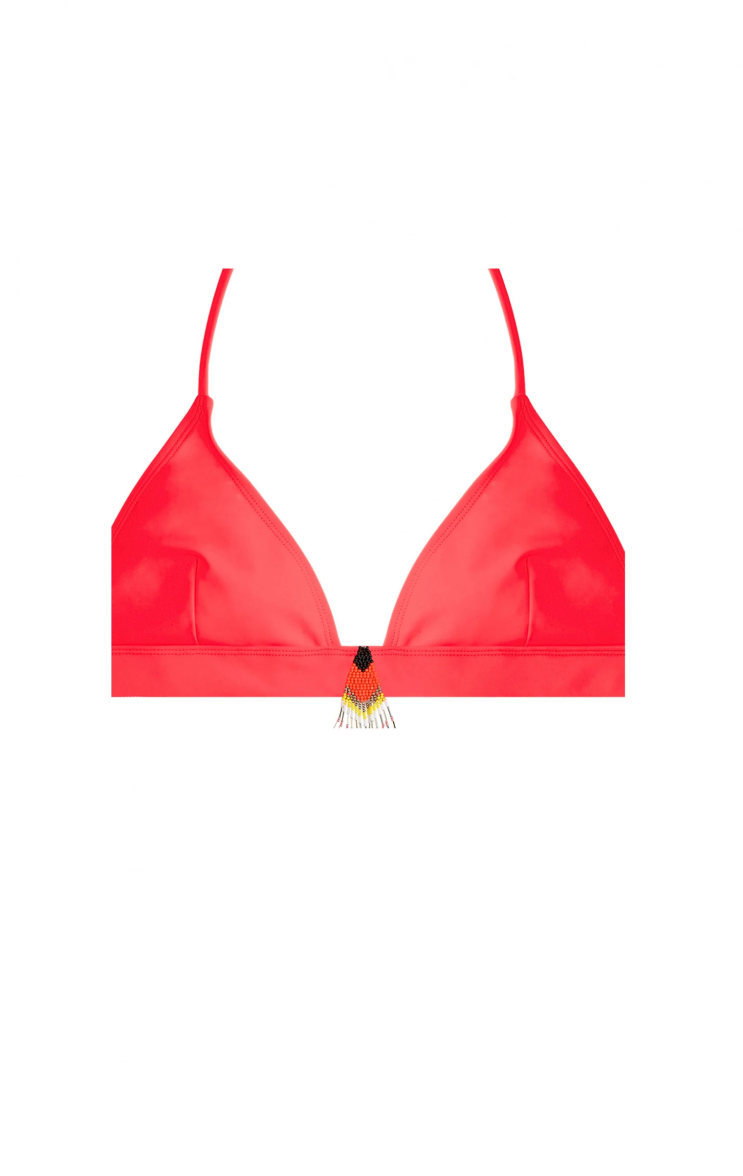Maillot de bain deux pièces forme triangle, de couleur rouge néon.