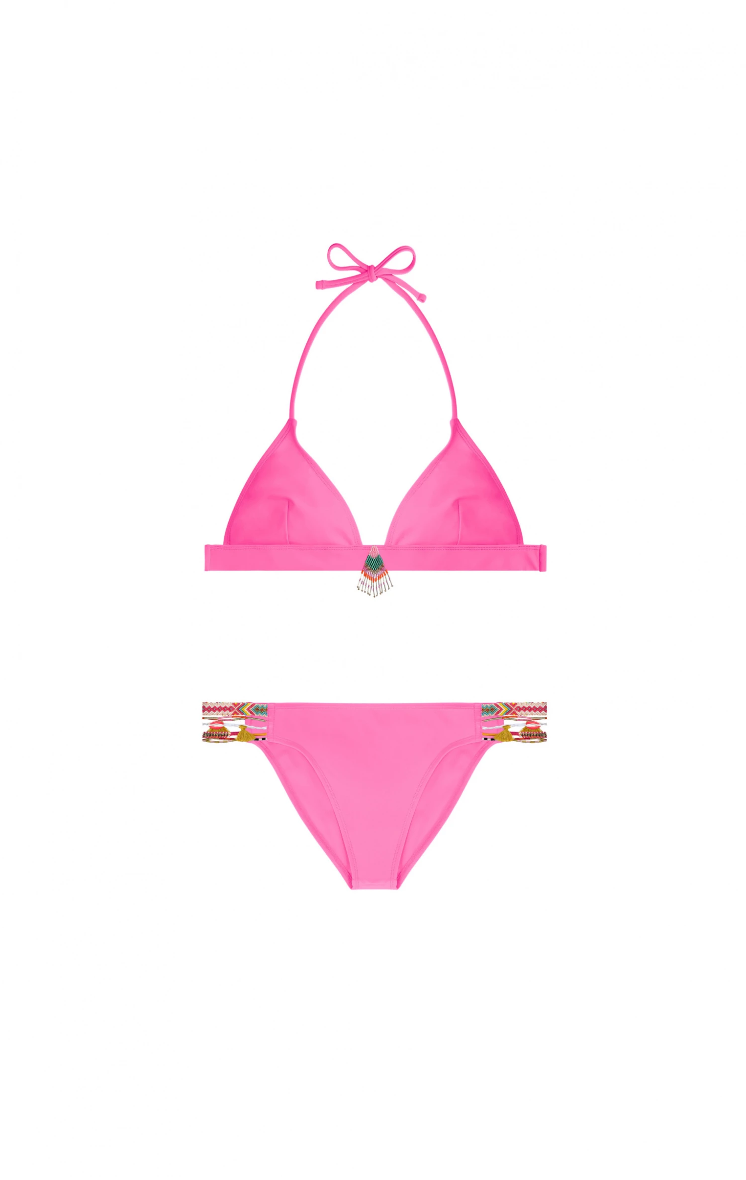 Un maillot de bain deux pièces forme triangle, élégant et sexy pour un été très chaud! Vous craquerez pour sa coupe esprit couture avec le détail raffiné des liens colorés ainsi que des perles, rappelant les bracelets brésiliens. La culotte est sexy et échancrée sur les fesses.
