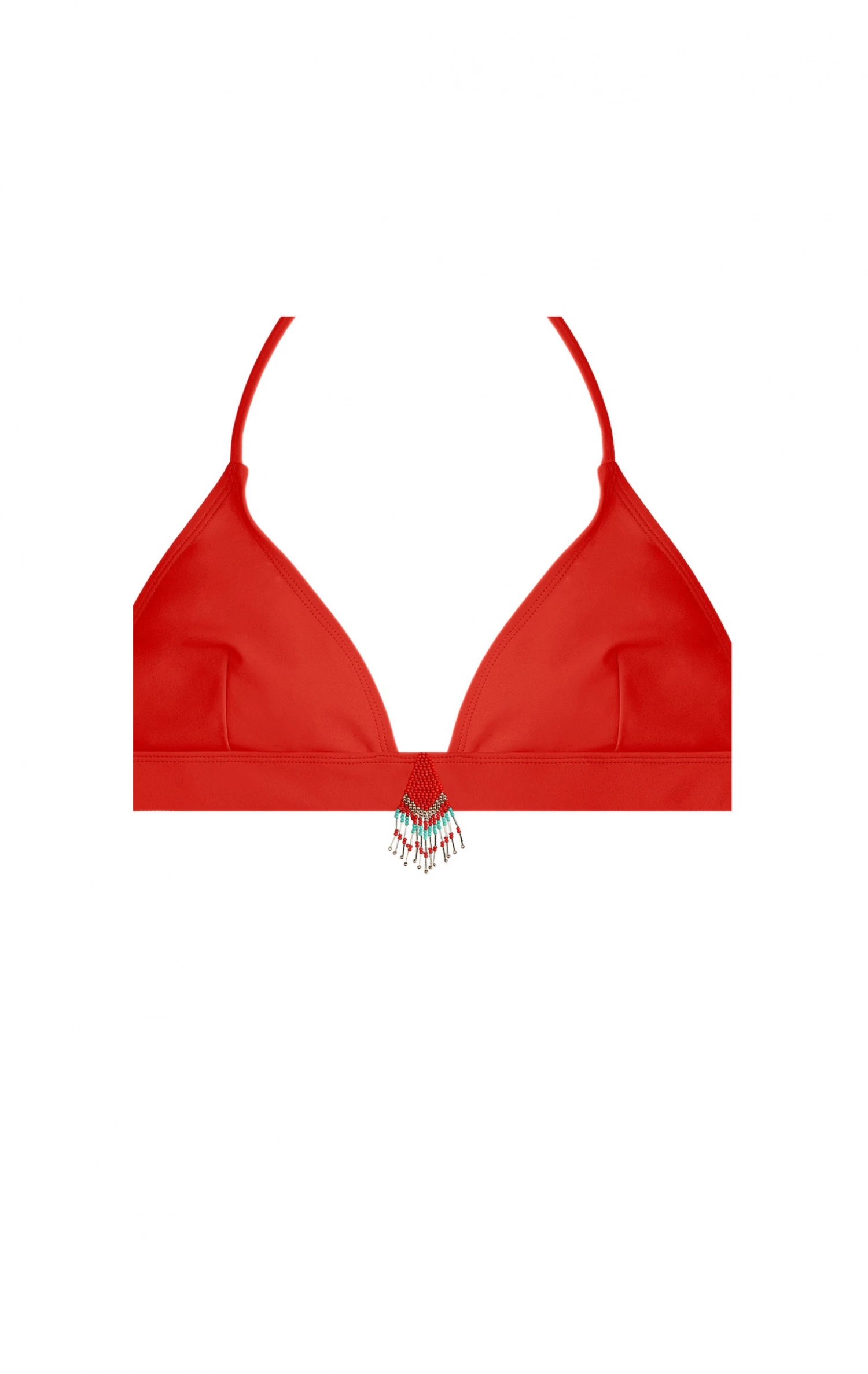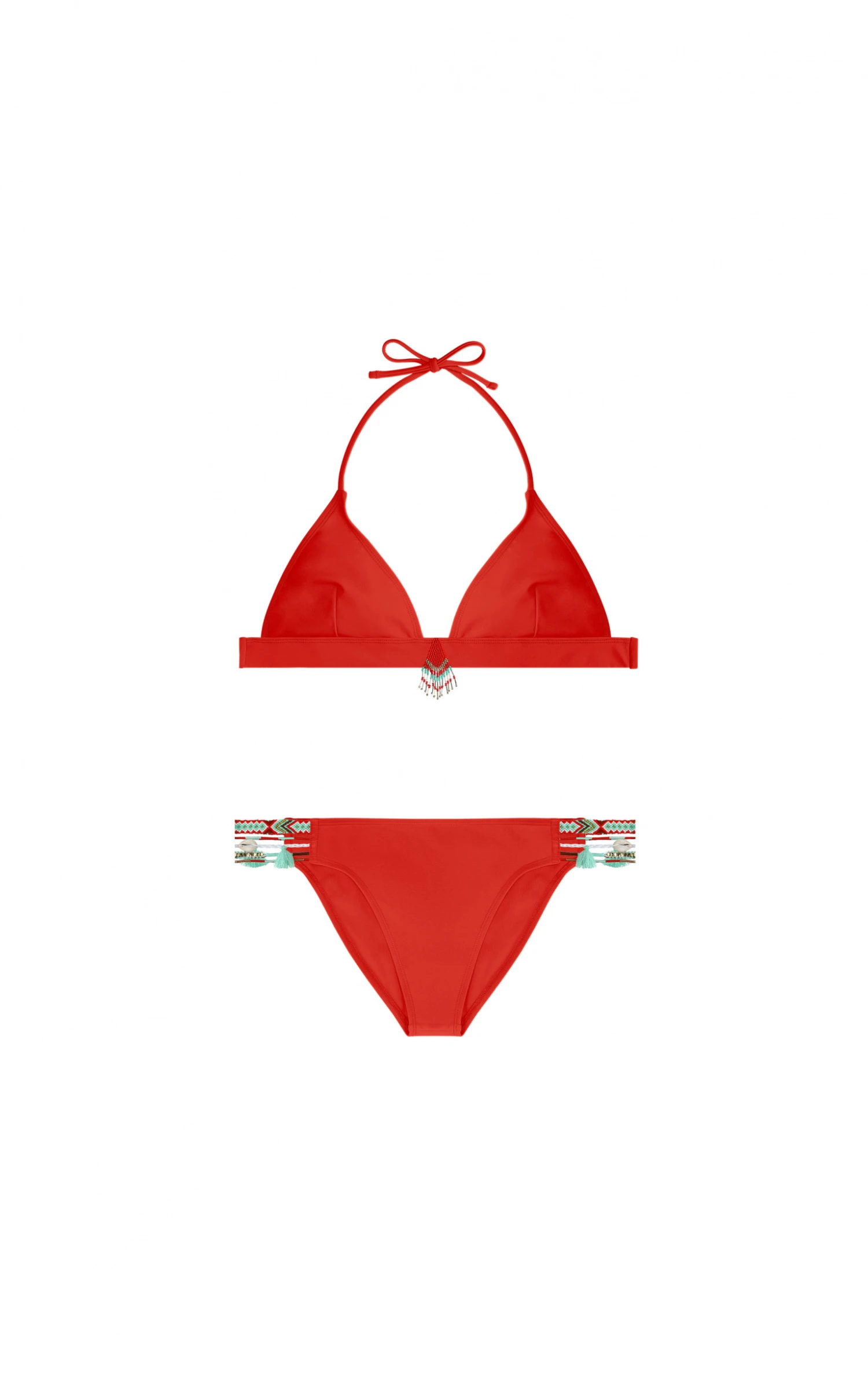 Maillot de bain deux pièces forme triangle, de couleur rouge.