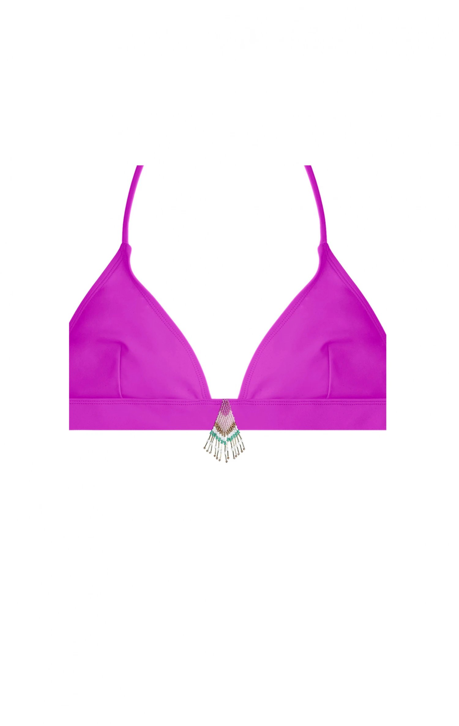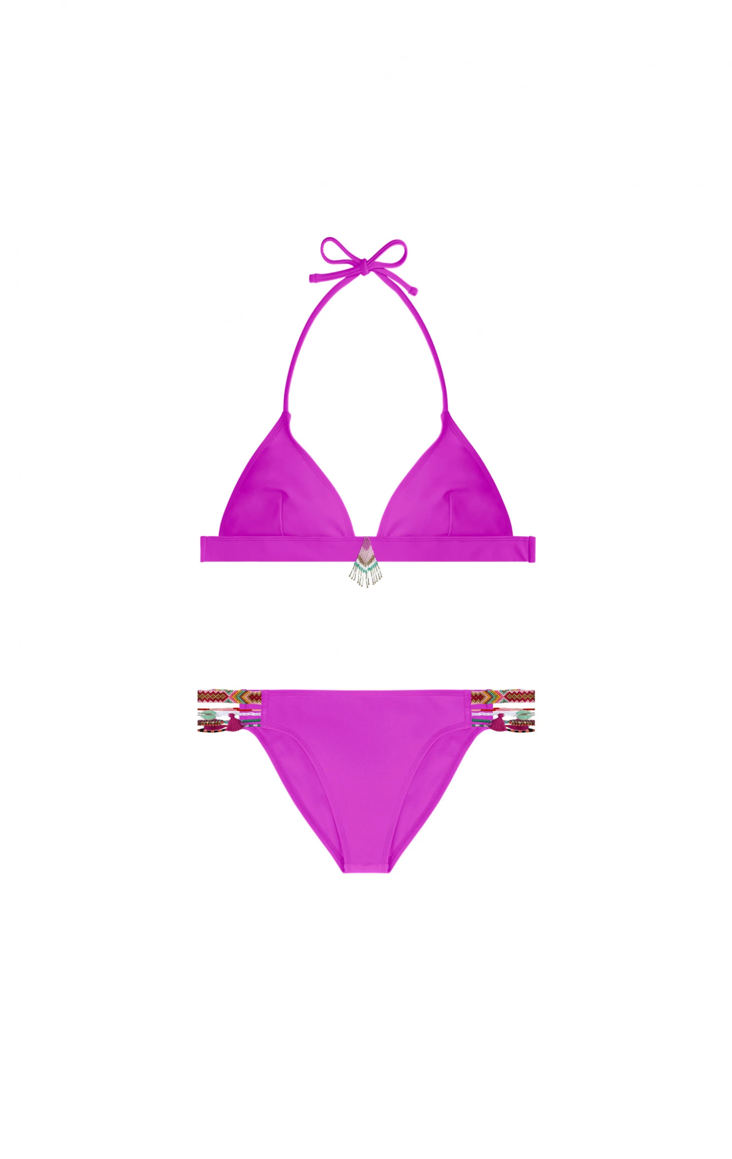 Un maillot de bain deux pièces forme triangle, élégant et sexy pour un été très chaud! Vous craquerez pour sa coupe esprit couture avec le détail raffiné des liens colorés ainsi que des perles, rappelant les bracelets brésiliens. La culotte est sexy et échancrée sur les fesses.