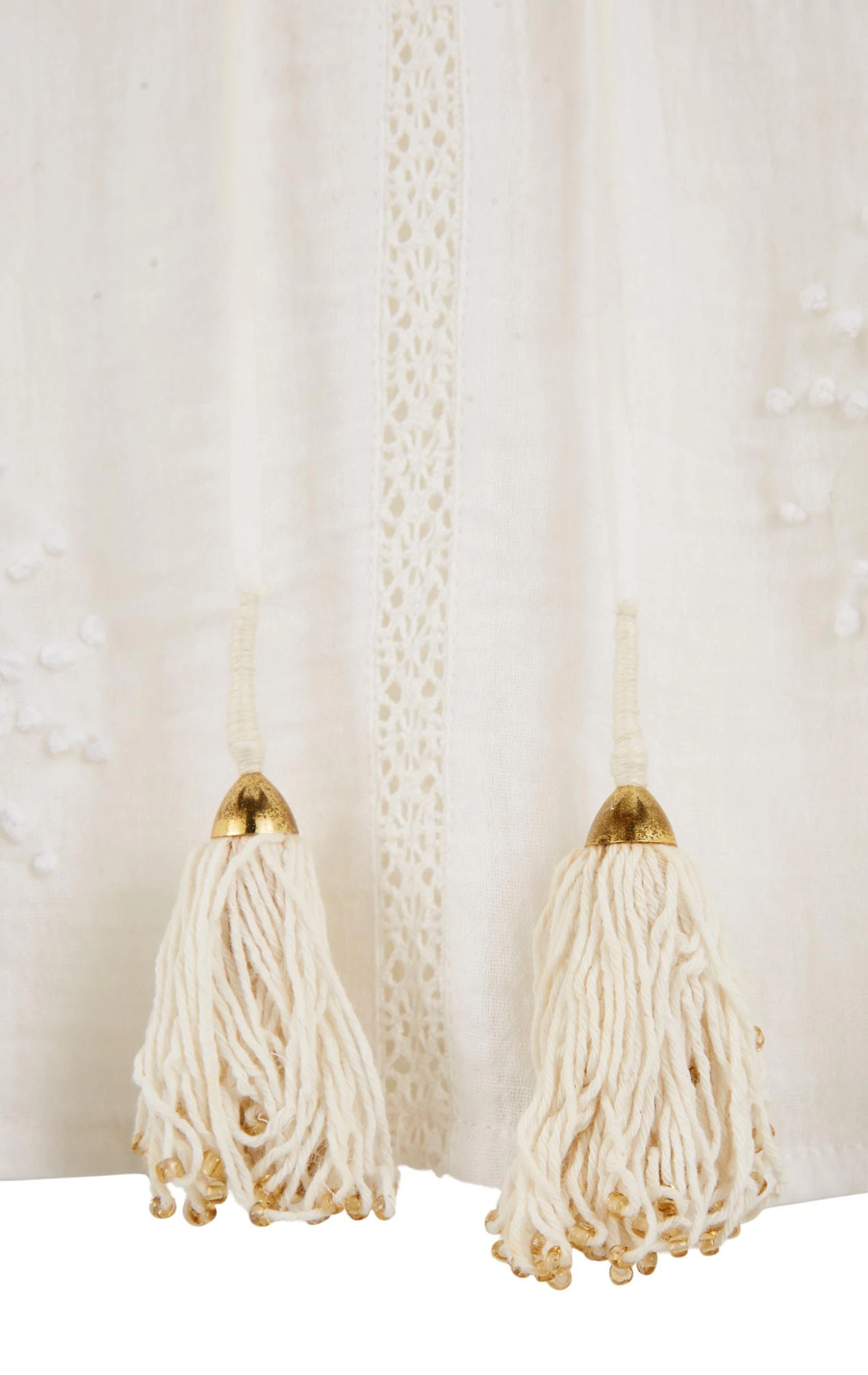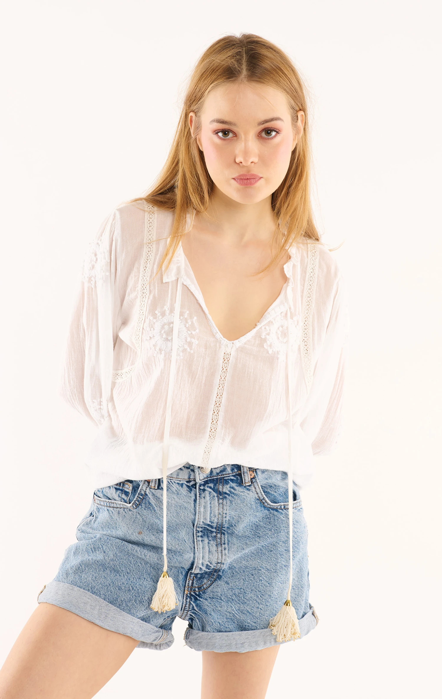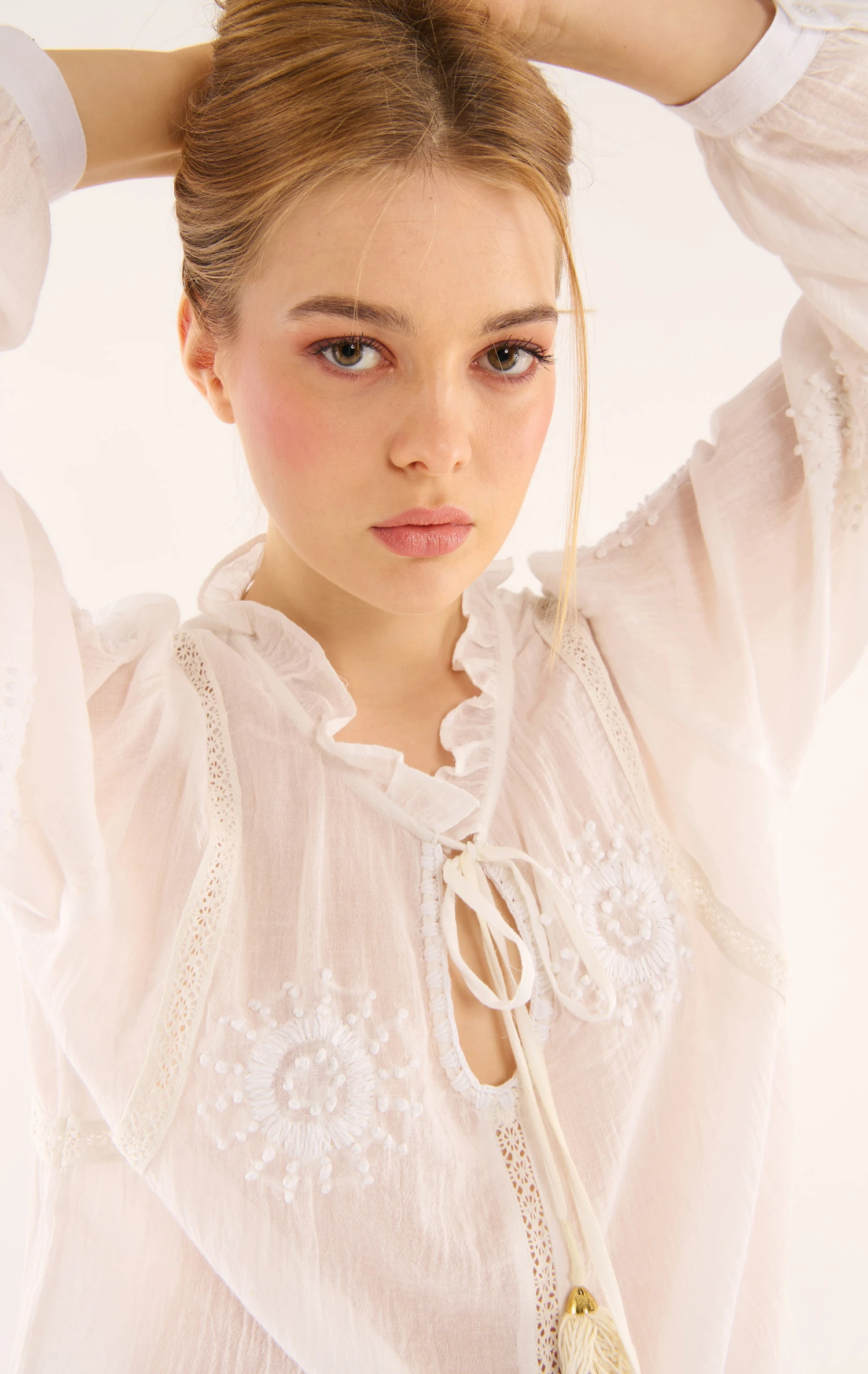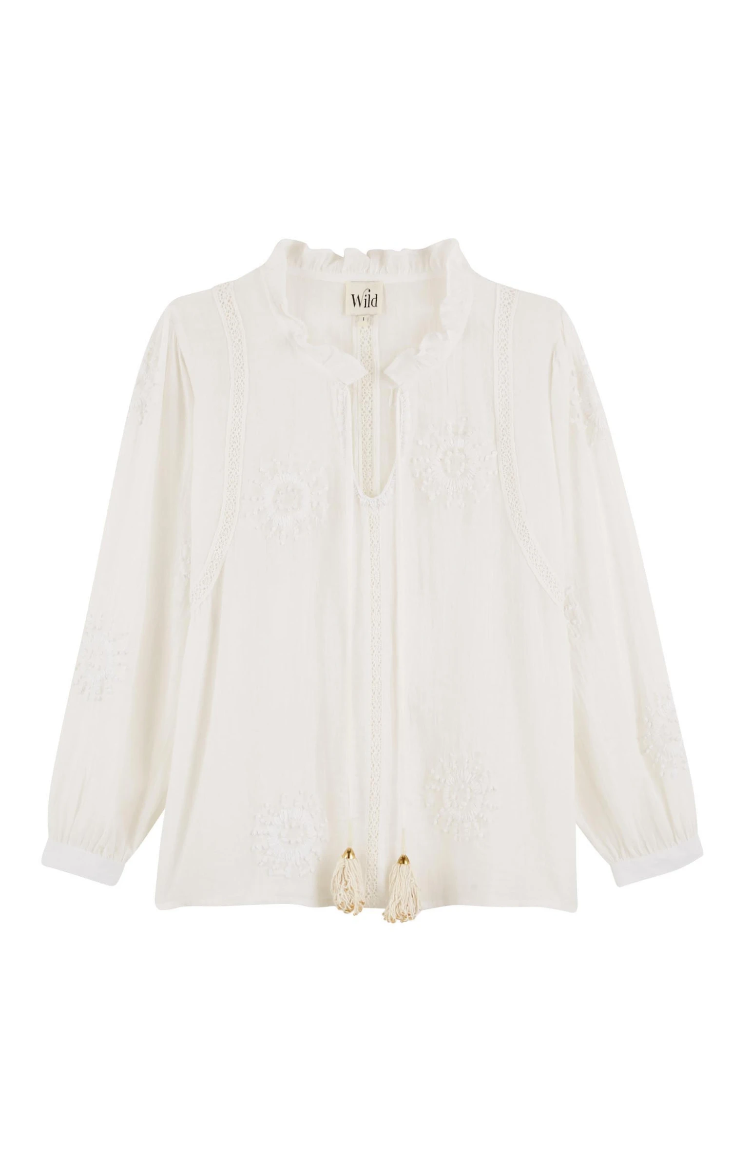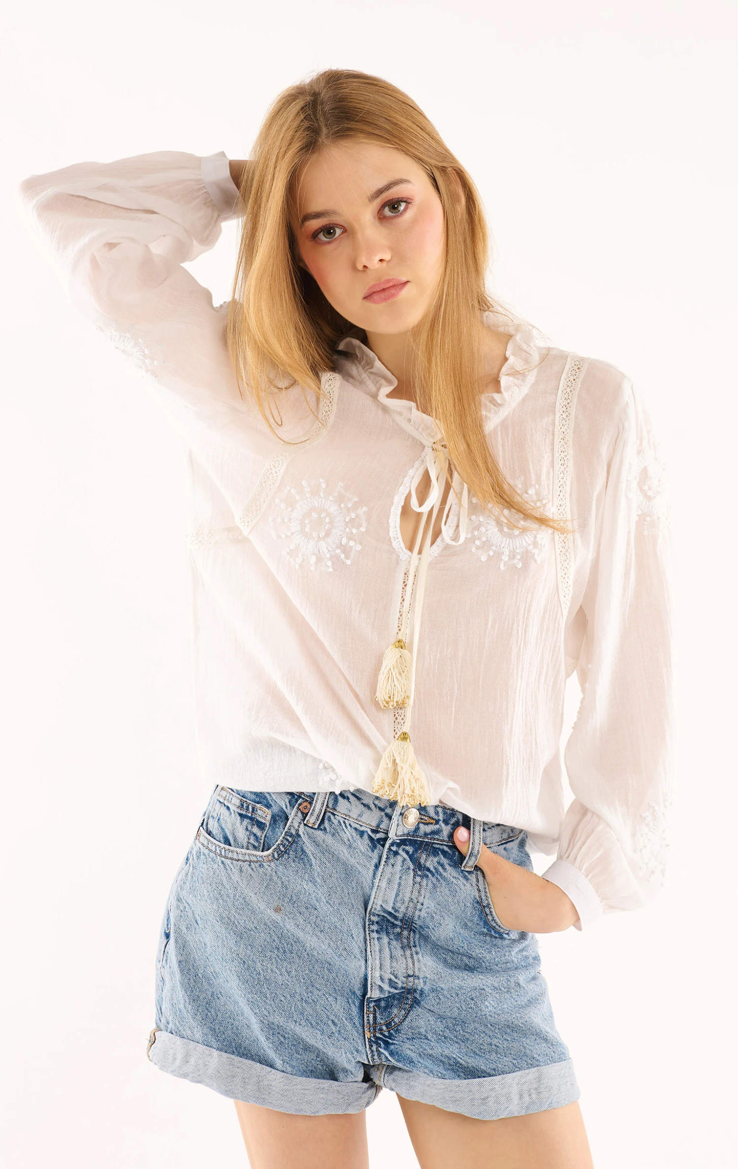 On adore ses manches ballon délicatement resserrées sur le poignet et la forme goutte du décolleté qui se ferme par un cordon d’où se balancent des pompons en perles de rocaille. Les adorables petits volants du col et les ravissants rubans crochet en application sur toute la blouse accentuent le côté romantique de la blouse Gladys qu’on porte fièrement pour une silhouette à la douceur chic et féminine.
