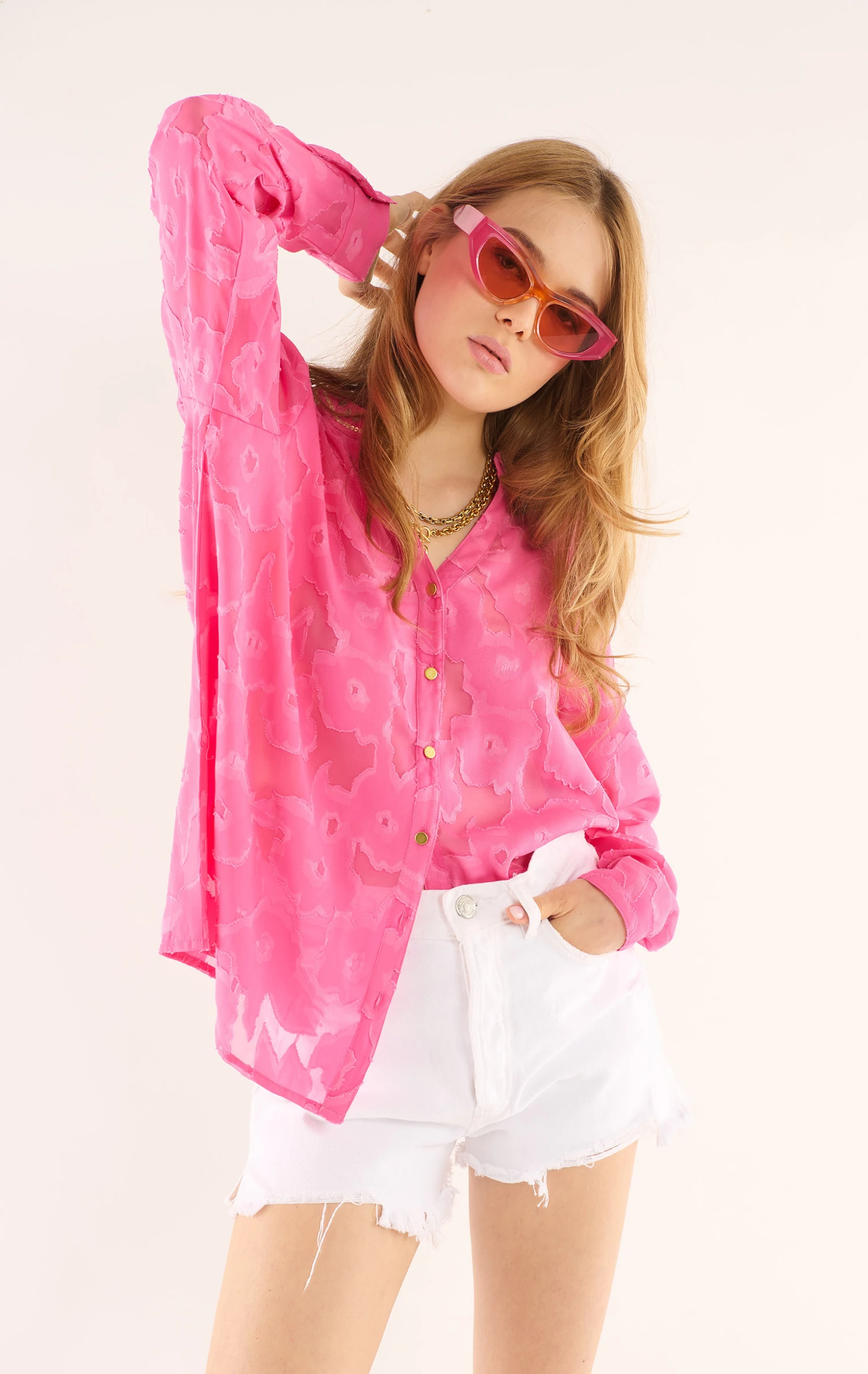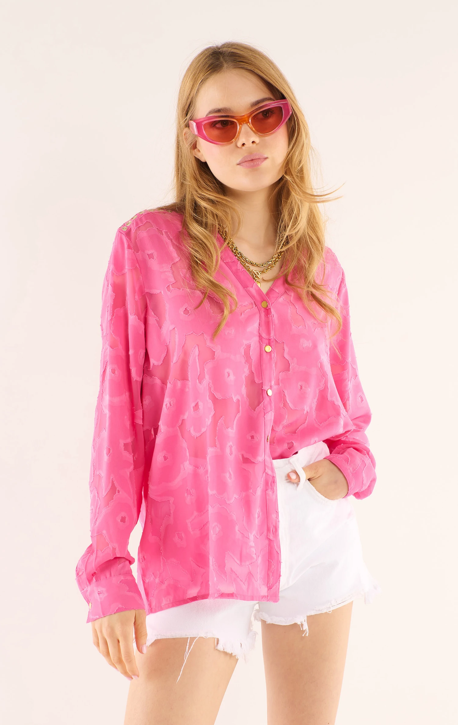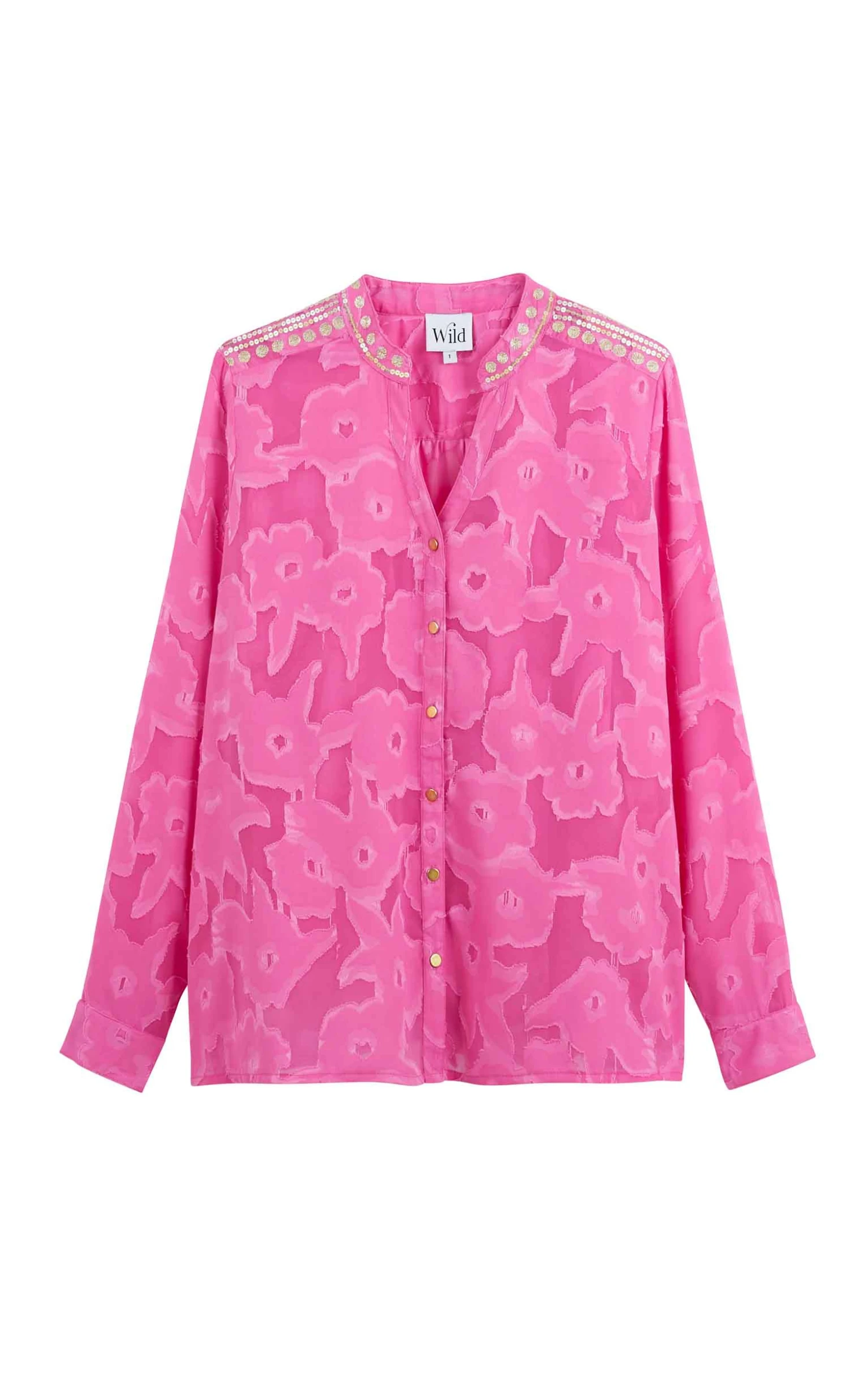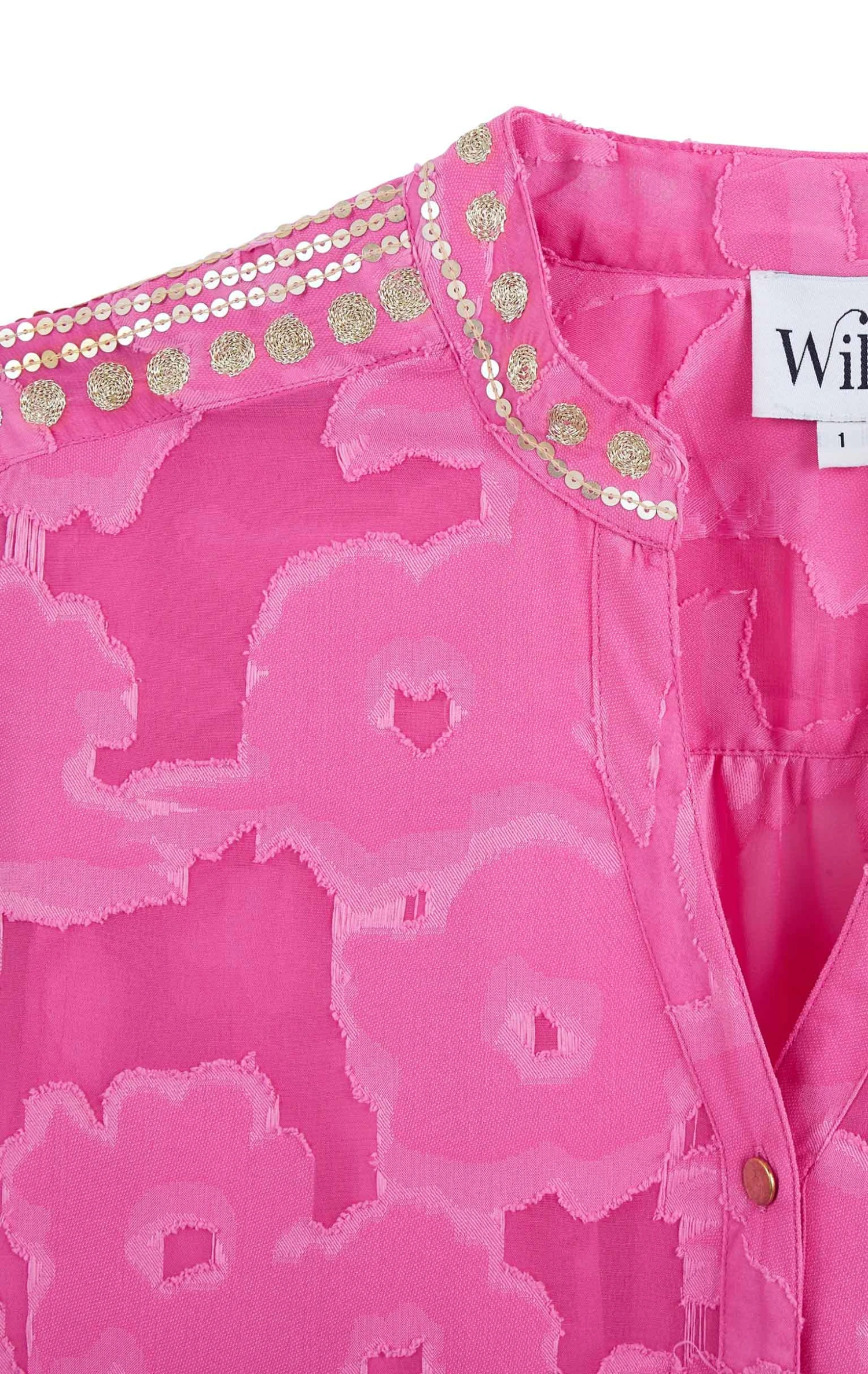 La blouse Virgil fait partie d’un trio de pièces confectionnées dans un jacquard en voile léger rose vif sur lequel sont brodées des anémones stylisées.