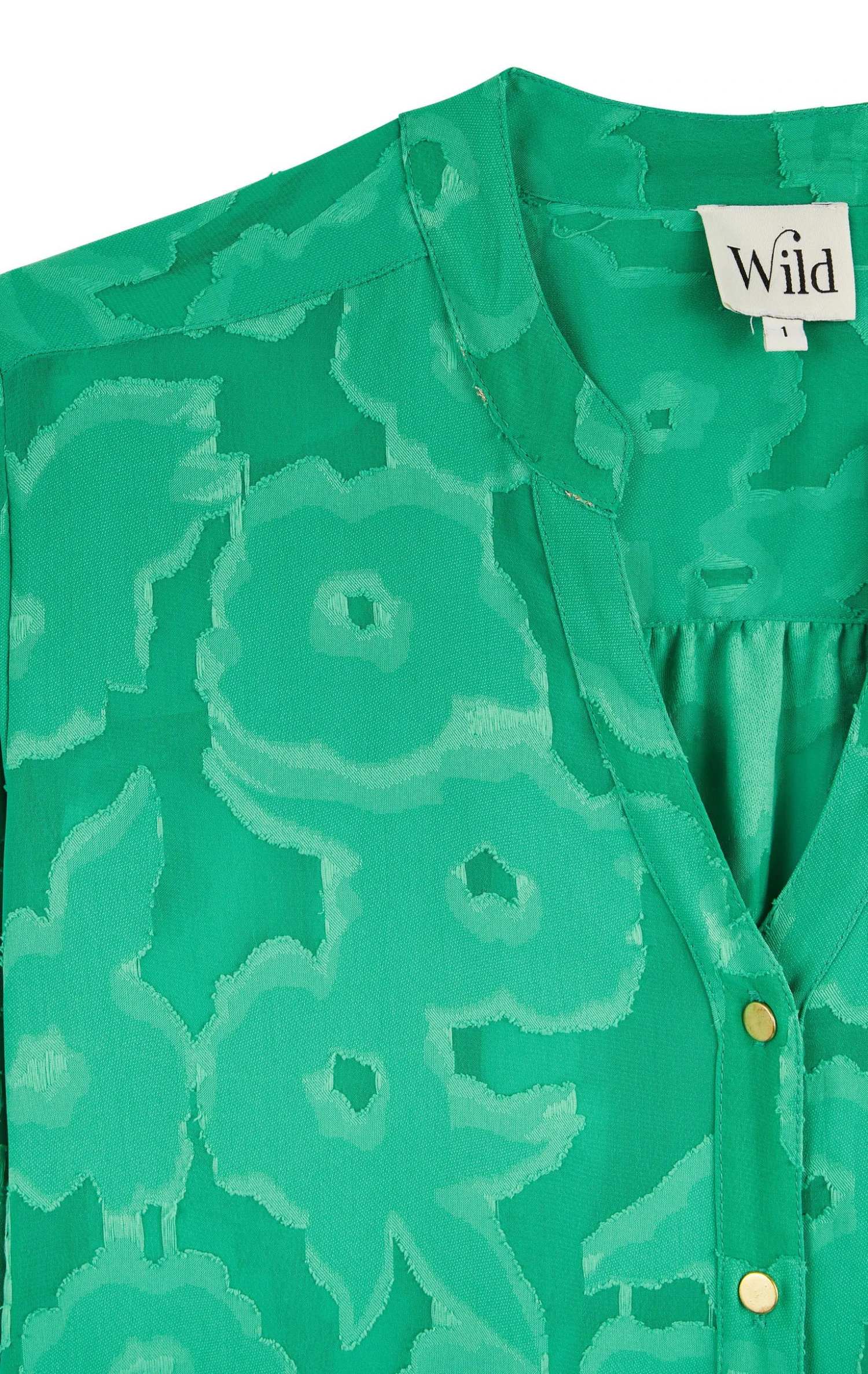 La blouse Virgil fait partie d’un trio de pièces confectionnées dans un jacquard en voile léger vert prairie sur lequel sont brodées de fils dorés des anémones stylisées.