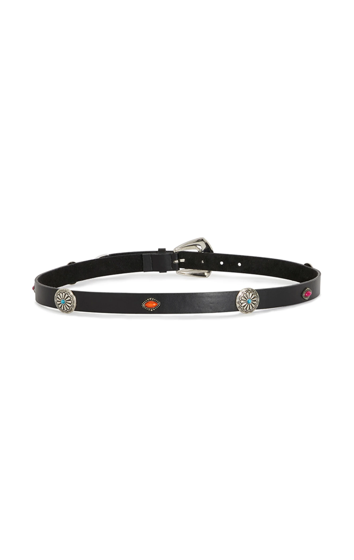 La ceinture pour faire blouser vos robes sexy, ou ajuster vos shorts minis! D’inspiration amérindienne, adoptez notre ceinture noire avec une boucle travaillée très Navajo, ornée d’une fausse turquoise en résine sur le dessus. Ponctuée de clous métalliques parés d’une pierre centrale tour à tour orange, rouge, turquoise, elle nous assure un look revisité très vintage.