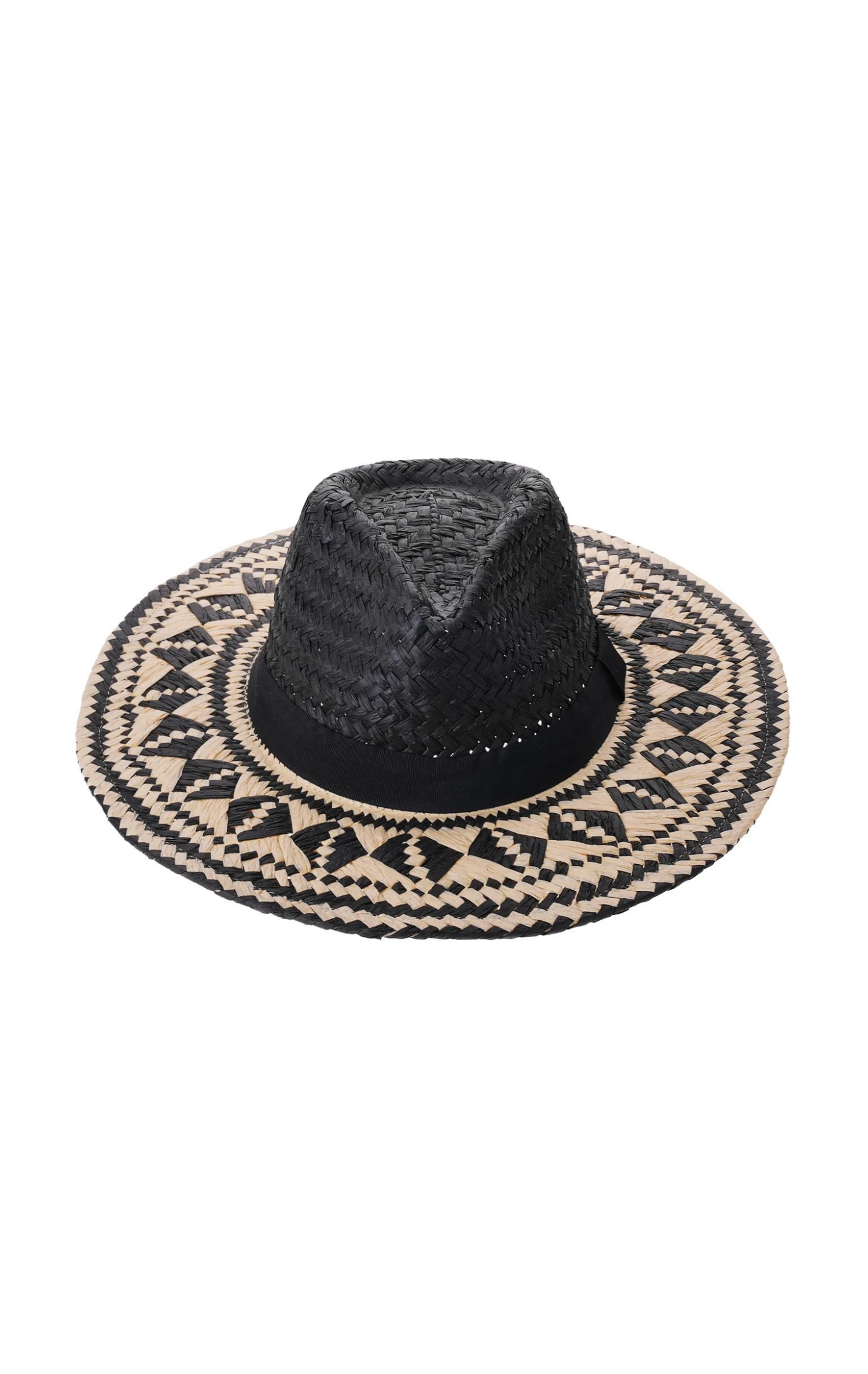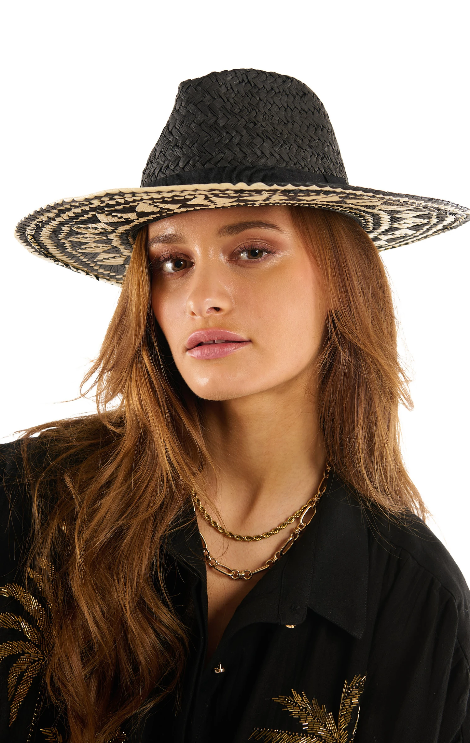 Avec Eva, on revisite le chapeau de paille en le restructurant de grands bords plats, en l’agrémentant d’un ruban noir et en le parant de magnifiques motifs graphiques noirs qui se découpent sur ce fond couleur paille.
