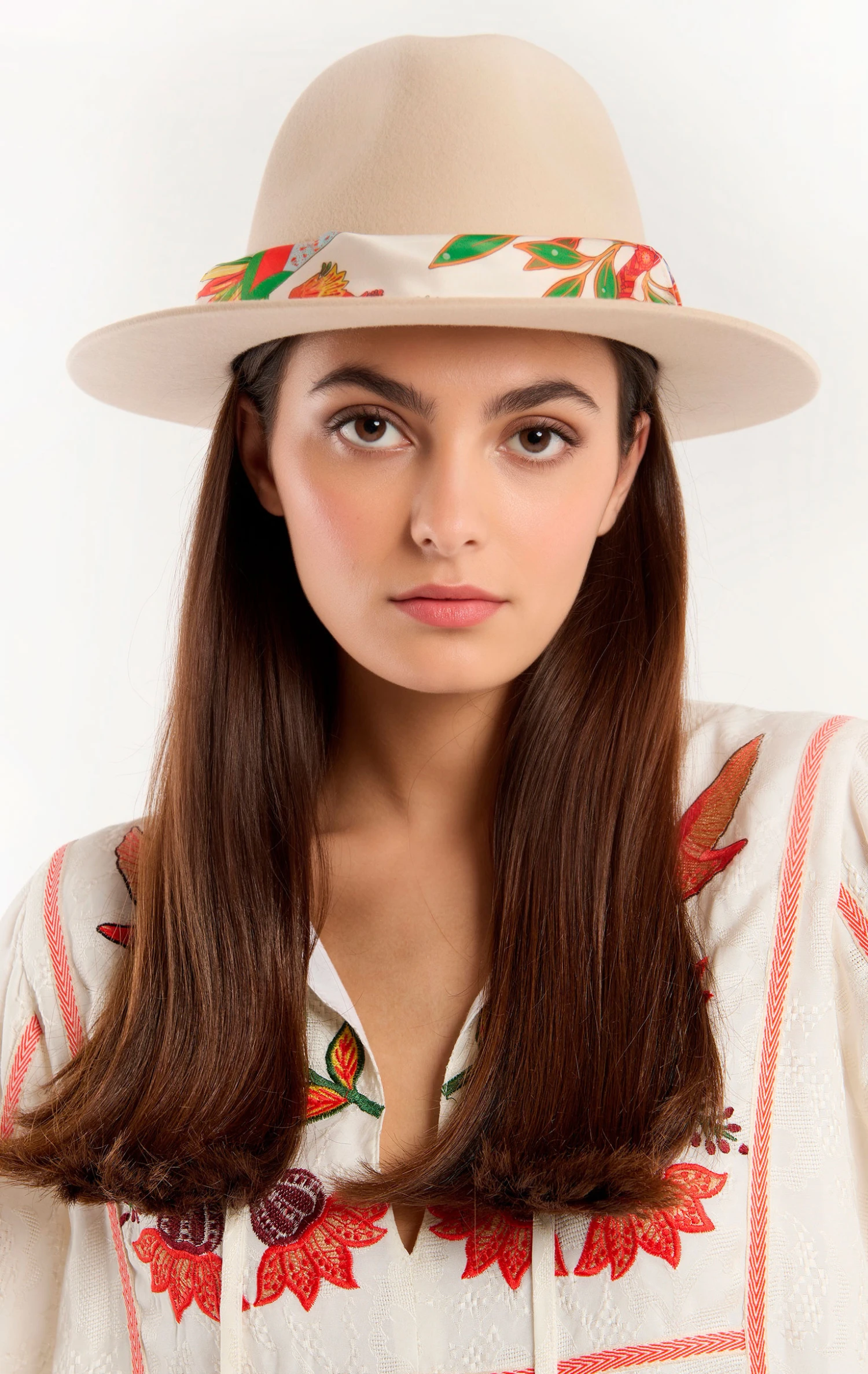 Neo, l’accessoire incontournable de la saison hivernale, se présente dans une teinte nude et s’agrémente avec une grâce remarquable de notre foulard imprimé Amber Palace aux tons roses et kaki. Ajustable de l’intérieur, il se pose avec raffinement sur toutes les têtes, garantissant une tenue impeccable.