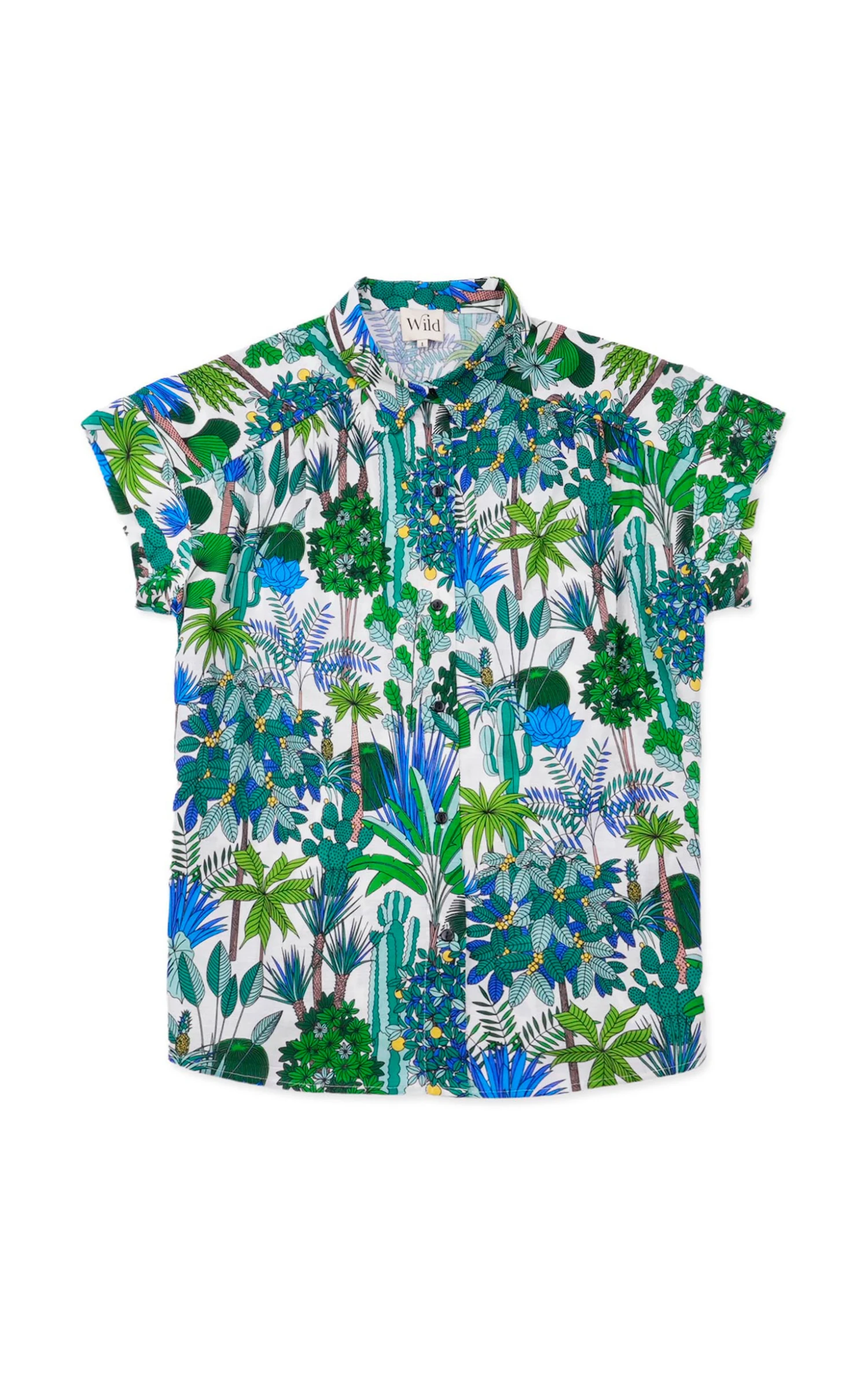 Coupe courte oversize et manches amples qui soulignent l’épaule, la chemise Balthazar est confectionnée dans une matière très douce et très agréable en lin rayonne. Elle se pare de l’imprimé du thème où les couleurs vert prairie, vert pâle et kaki viennent dessiner, sur une base beige, des motifs de feuilles de palmes, de cactus et de palmiers, réhaussés d’un bleu cobalt électrique et des agrumes jaune vif qui font écho à notre thème Sicily.