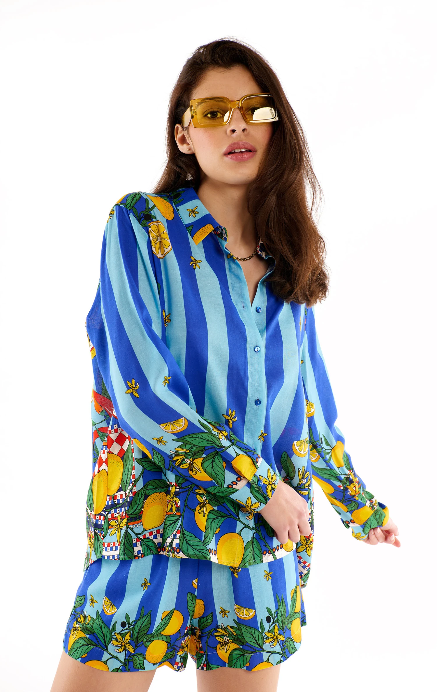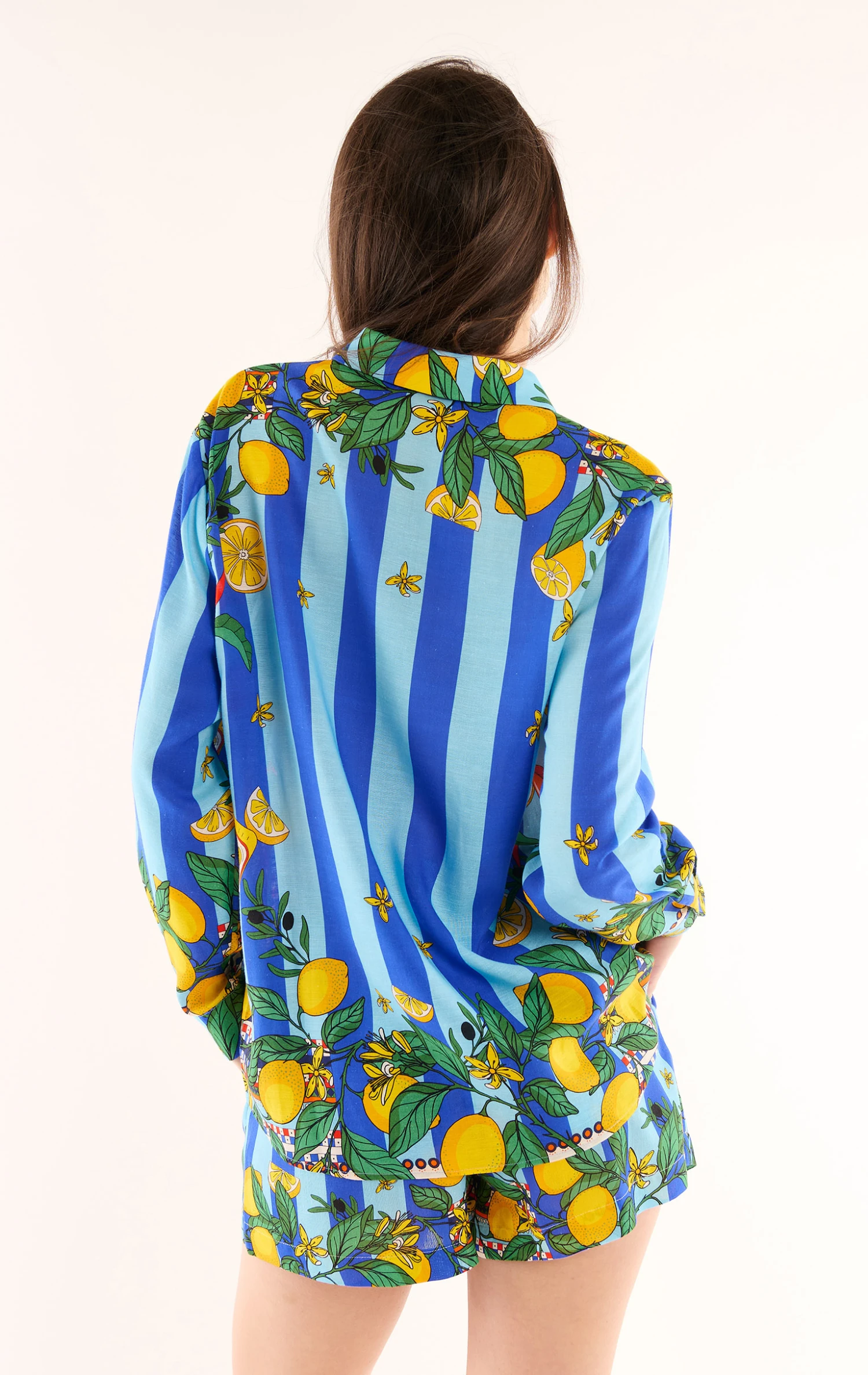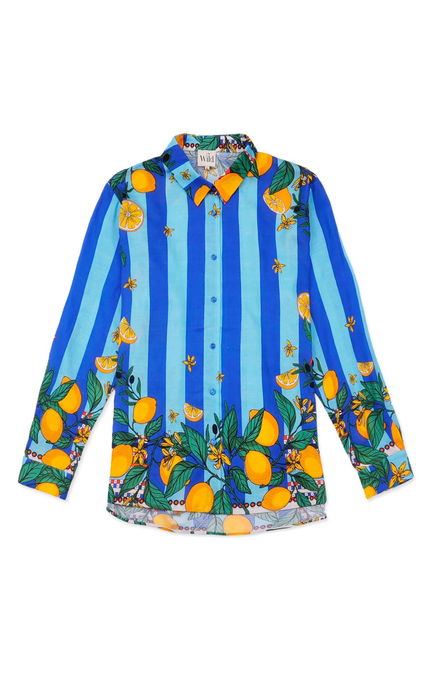 Vous allez adorer cette chemise en Tencel effet lin douce et légère, entièrement imprimée des motifs exceptionnels de notre foulard Sicily: crée par et pour WILD, cet imprimé revisite les codes emblématiques de l’Italie du Sud et les accorde dans une composition joyeuse et délicieusement solaire. Citrons siciliens jaunes éclatants, boîtes de sardines, piments rouge vif et feuilles d’olivier s’harmonisent, en un imprimé placé, sur un fond bleu ciel aux larges rayures bleu Klein. On s’en délecte tout l’été !