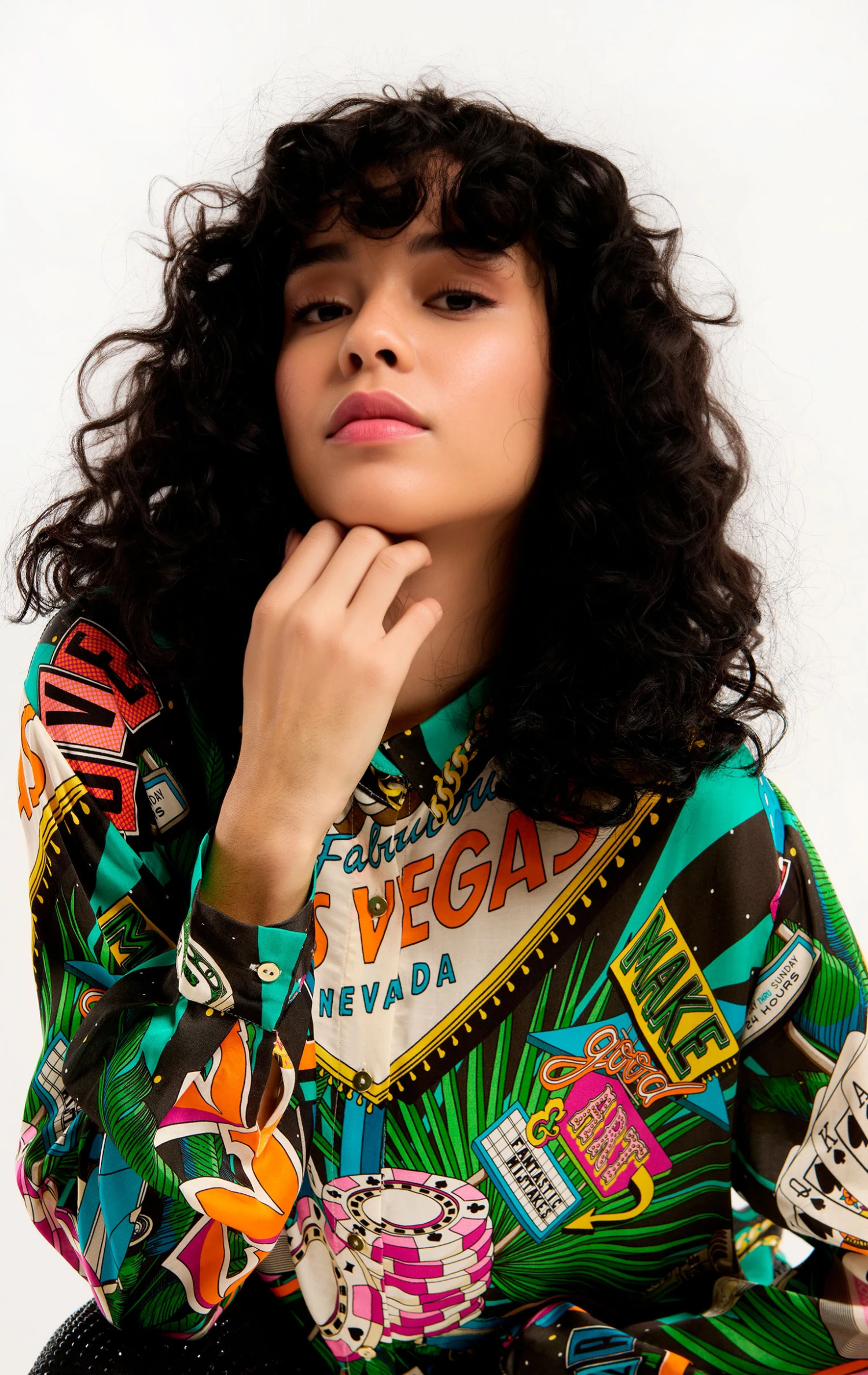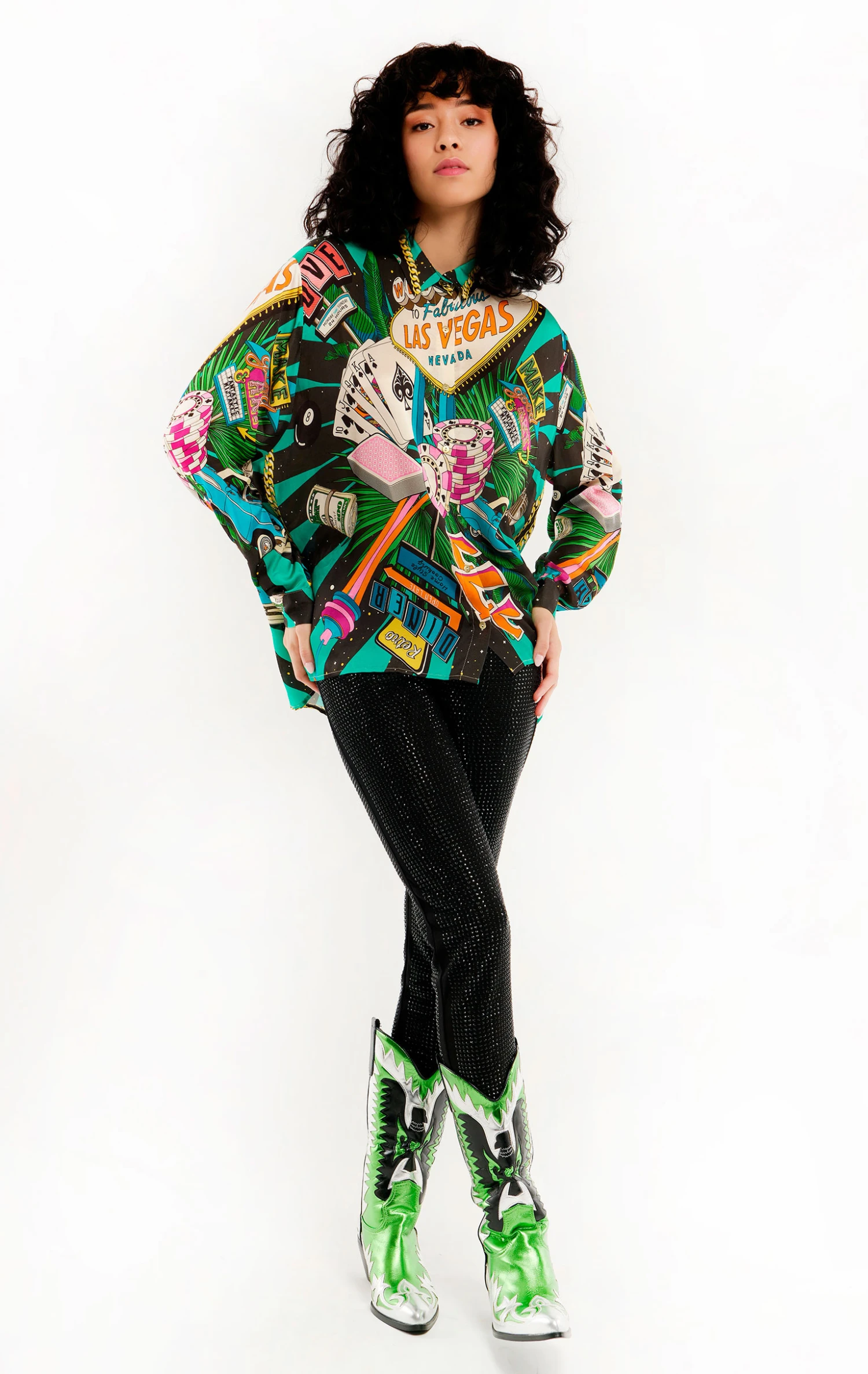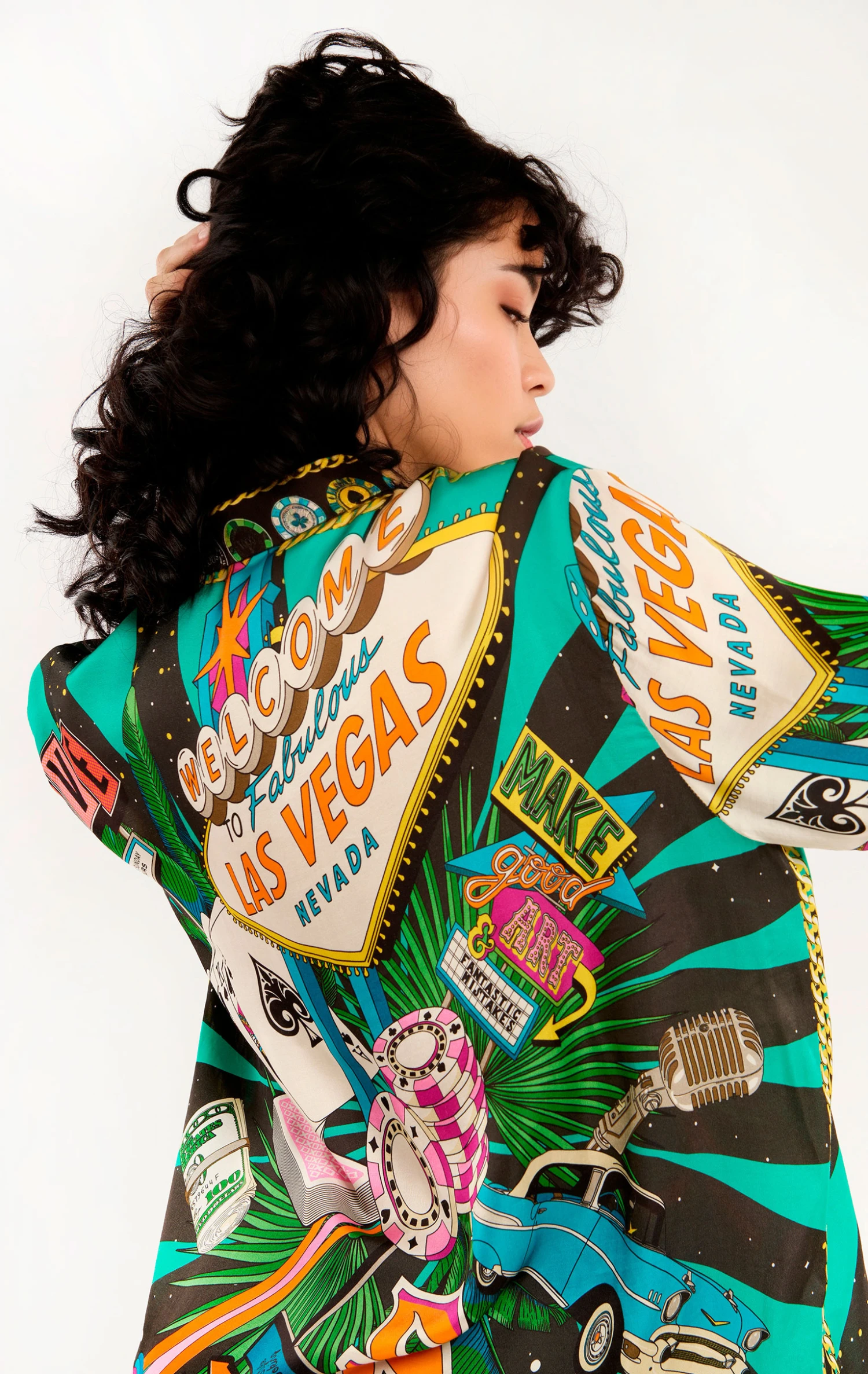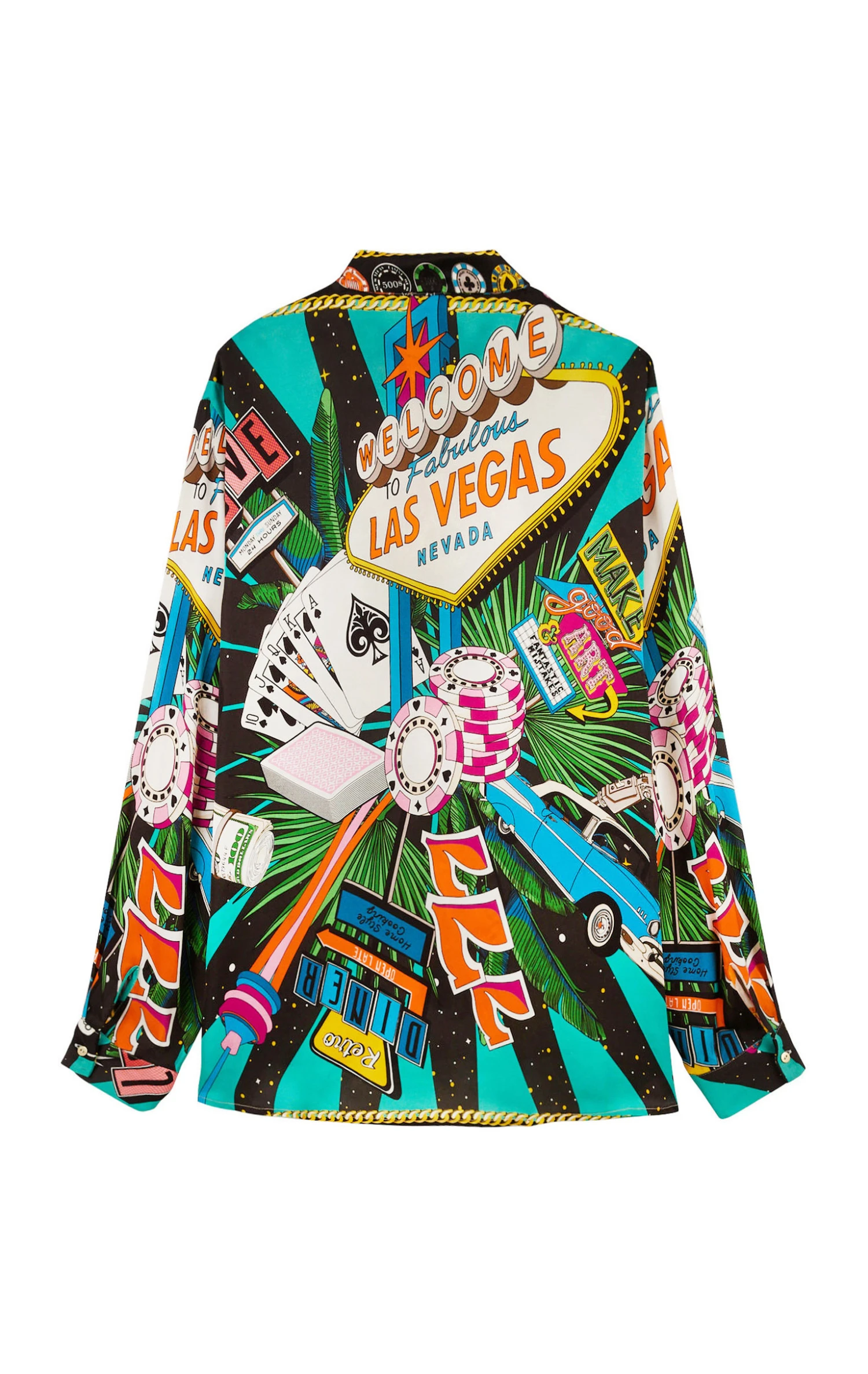 Vous allez adorer cette chemise en viscose douce et légère qui est entièrement imprimée des motifs de notre foulard Vegas: L’imprimé évoque l’excitation et l’éclat de Las Vegas ainsi que ses symboles emblématiques tels que les dés et les célèbres enseignes lumineuses, dans un style vibrant et détonant. Présentée ici en version noire, elle mixe avec brio les couleurs noire, rouge, vert et bleu. La chemise Bonaventure Vegas se décline en 2 couleurs.