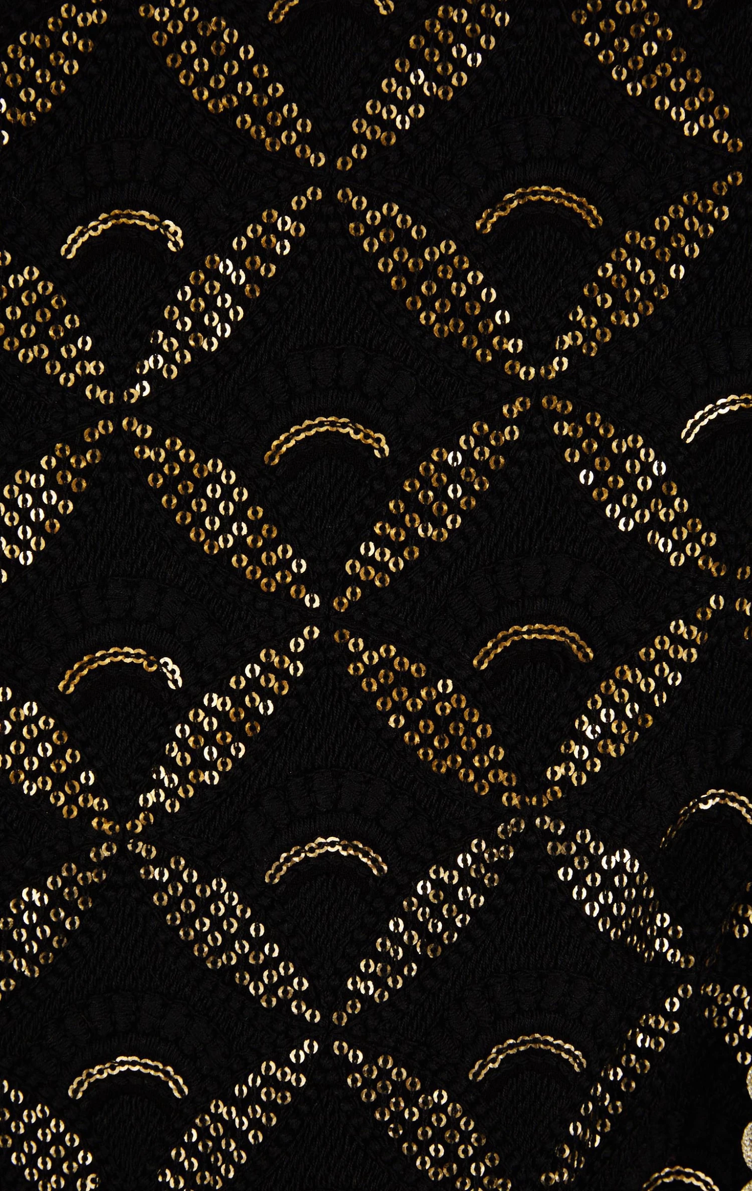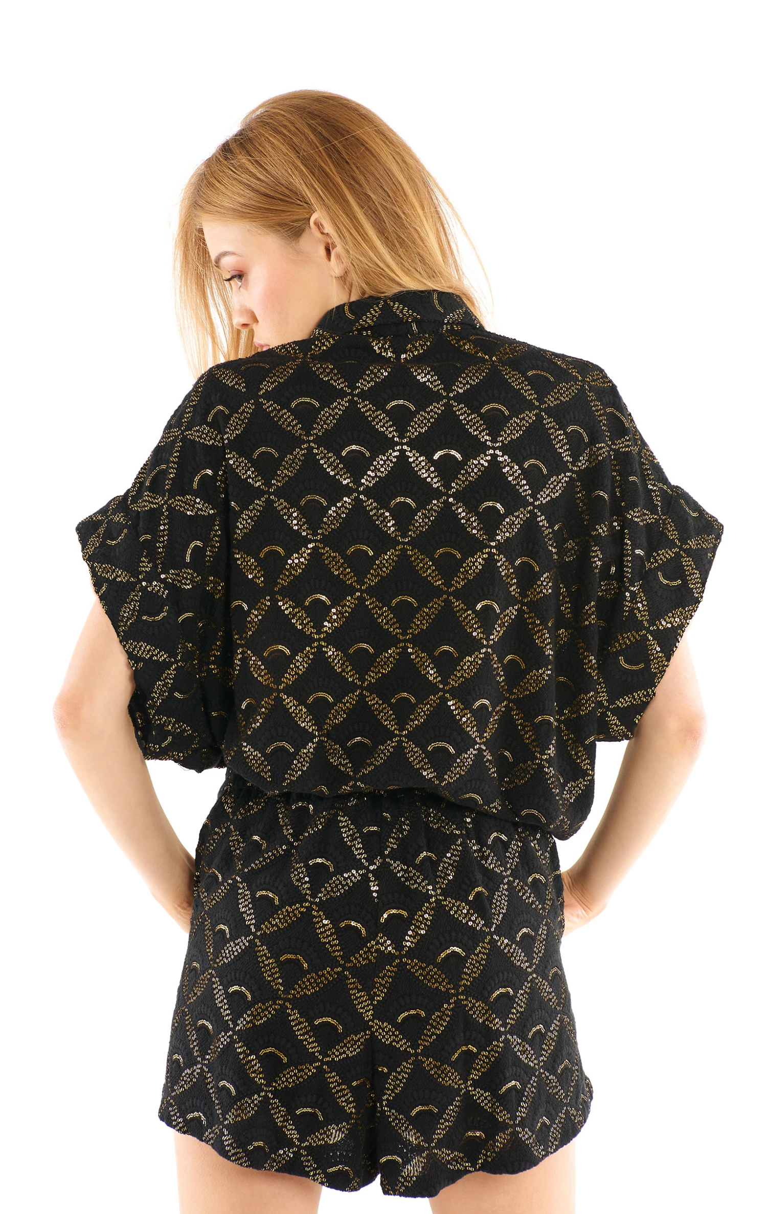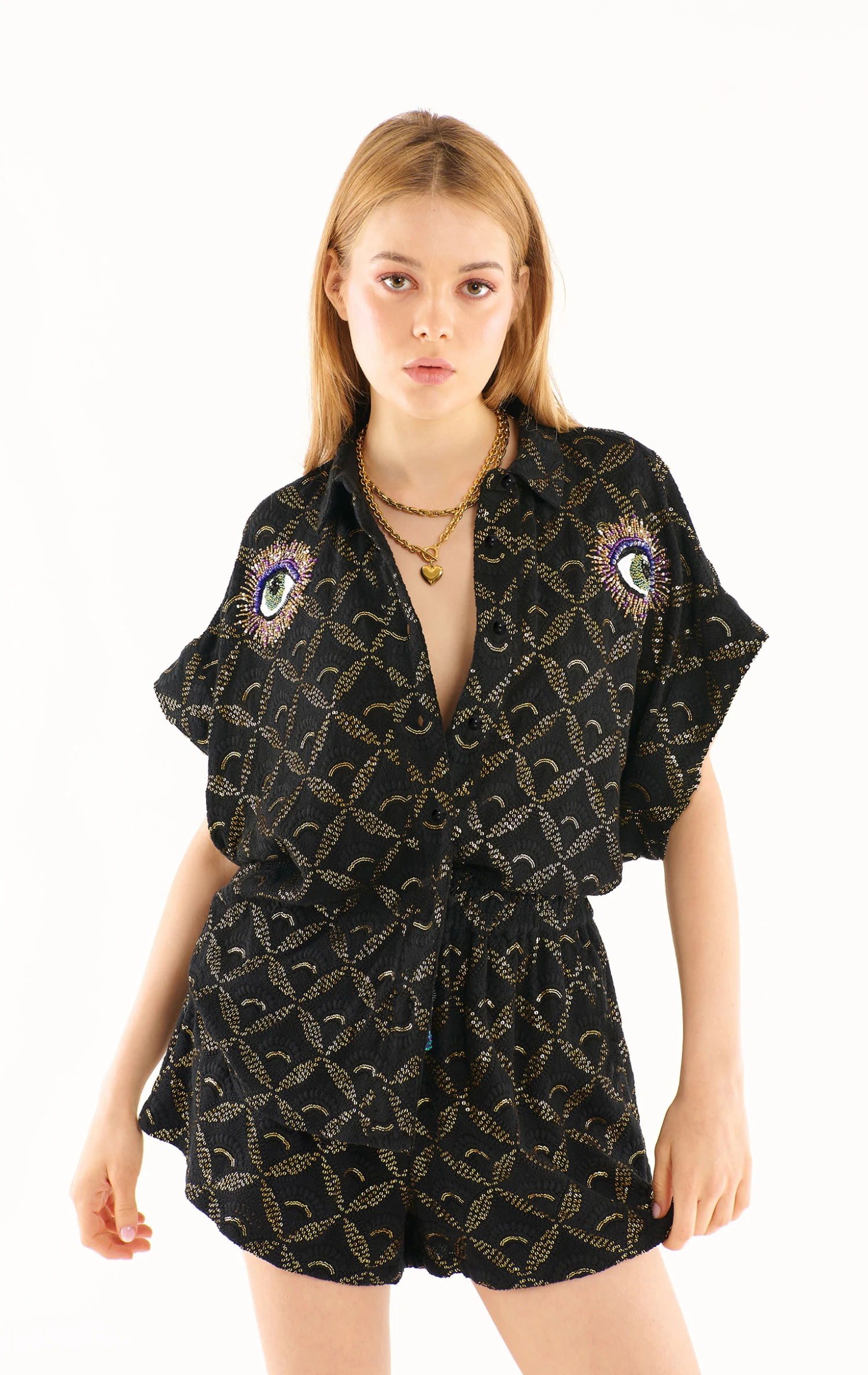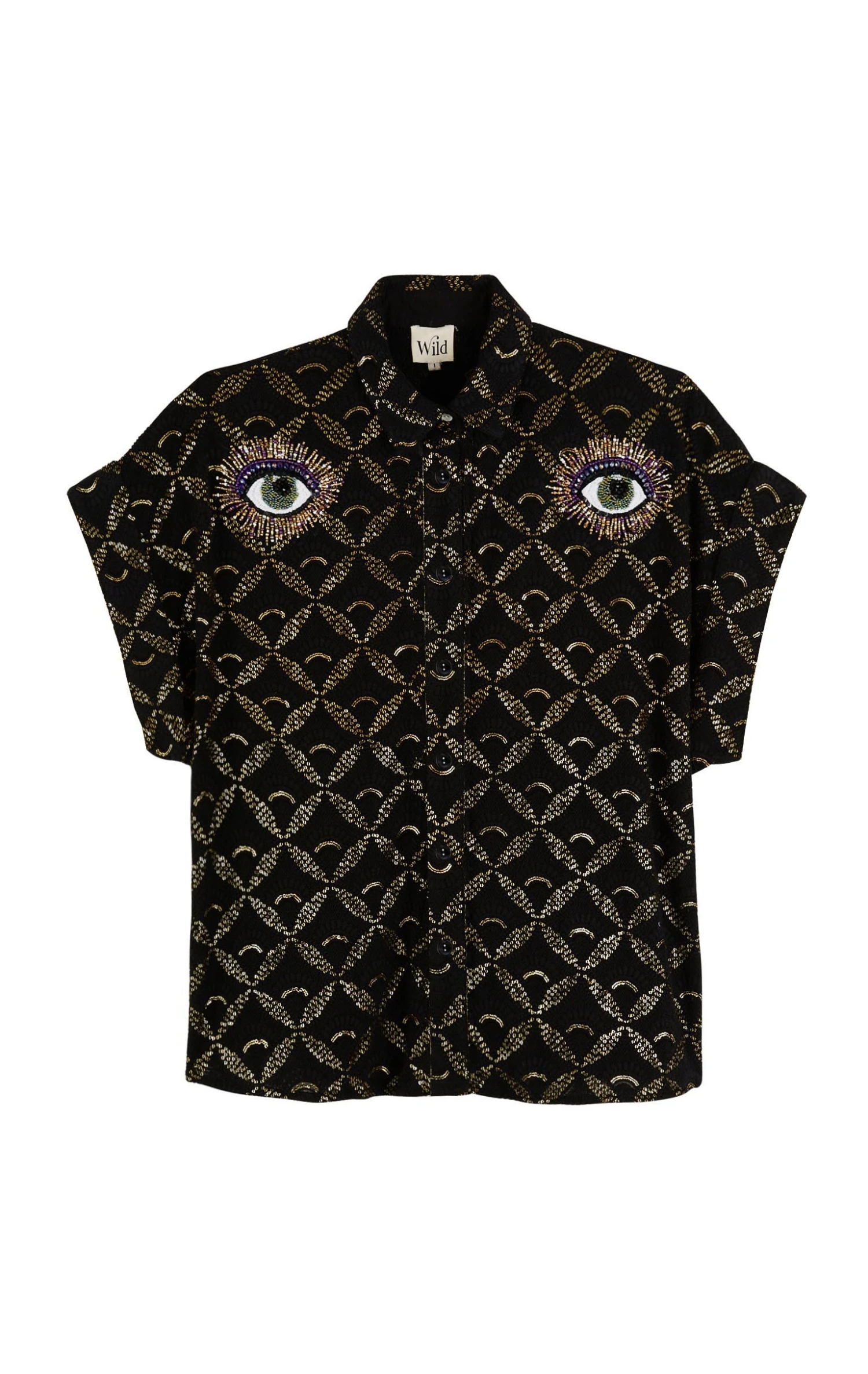 Cette chemise à la coupe courte et oversize et aux manches amples, soulignées par un croquet doré, est confectionnée dans une viscose de coton entièrement rebrodée de formes florales graphiques et de sequins. Une broderie extravagante faite de perles violettes, noires et vertes dessine deux yeux protecteurs posés au niveau des épaules. Déclinée en trois couleurs, blanc cassé, noir et bleu, elle s’assortit avec le short Céline pour un ensemble twin-set parfait!