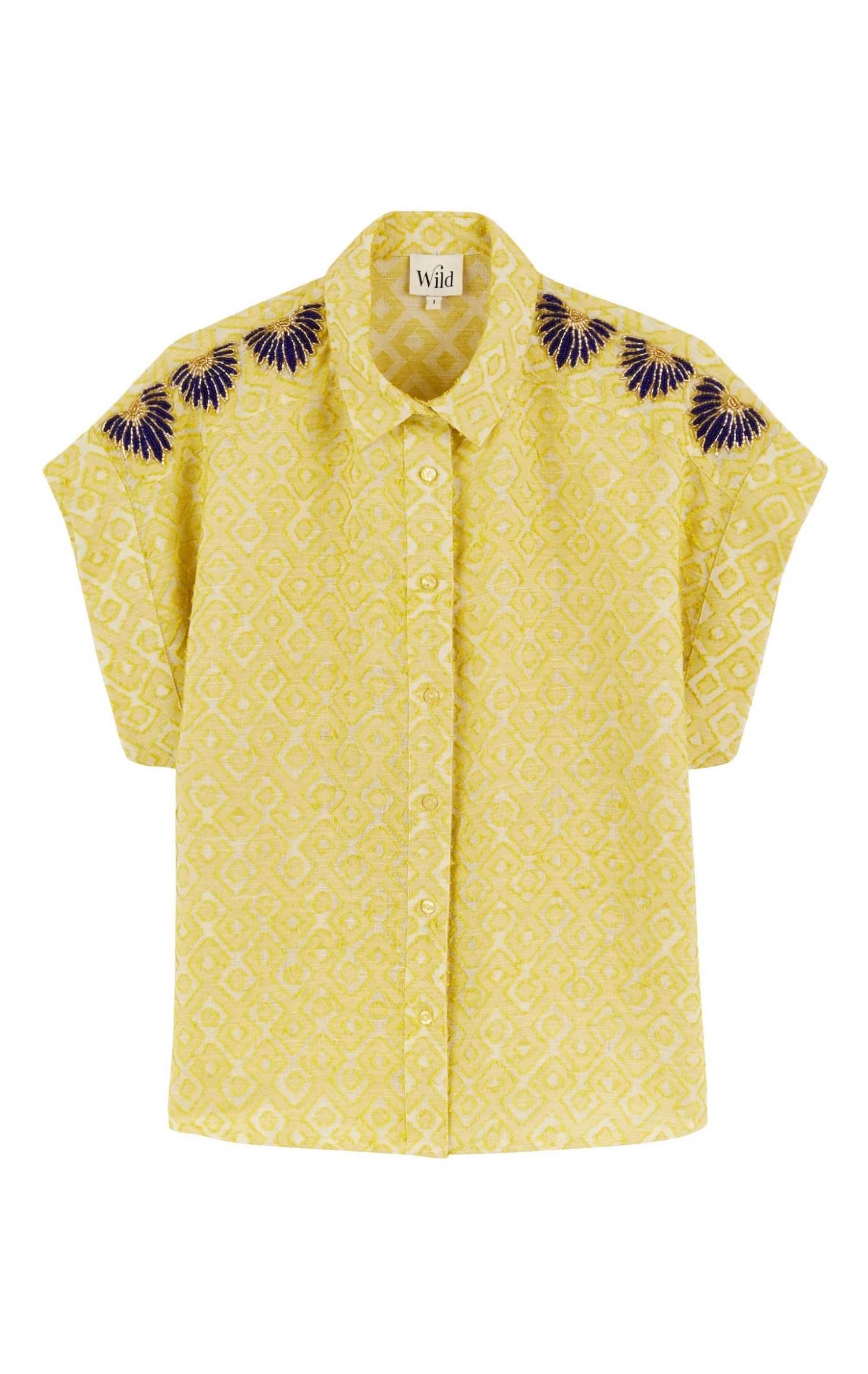Courte et oversize, la chemise Lionel se distingue par ses manches américaines et son col italien, lui offrant une esthétique décontractée et contemporaine. Elle se distingue par sa texture en jacquard rasé vert anis, ornée de motifs graphiques et vintage en forme de losanges.