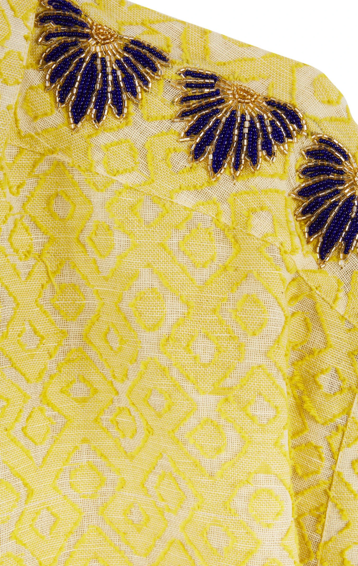 Six palmes brodées en perles de rocaille violettes et argentées se répartissent de part et d’autre des épaules et lui donnent une folle allure de pièce bijou.