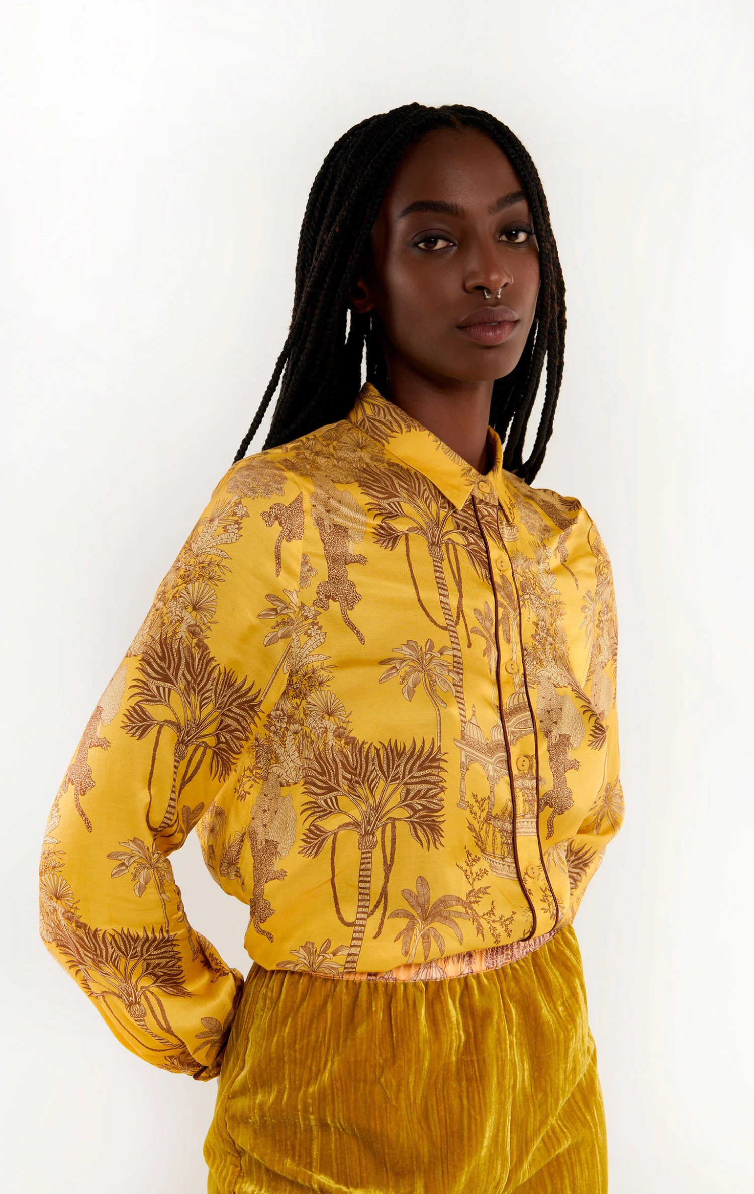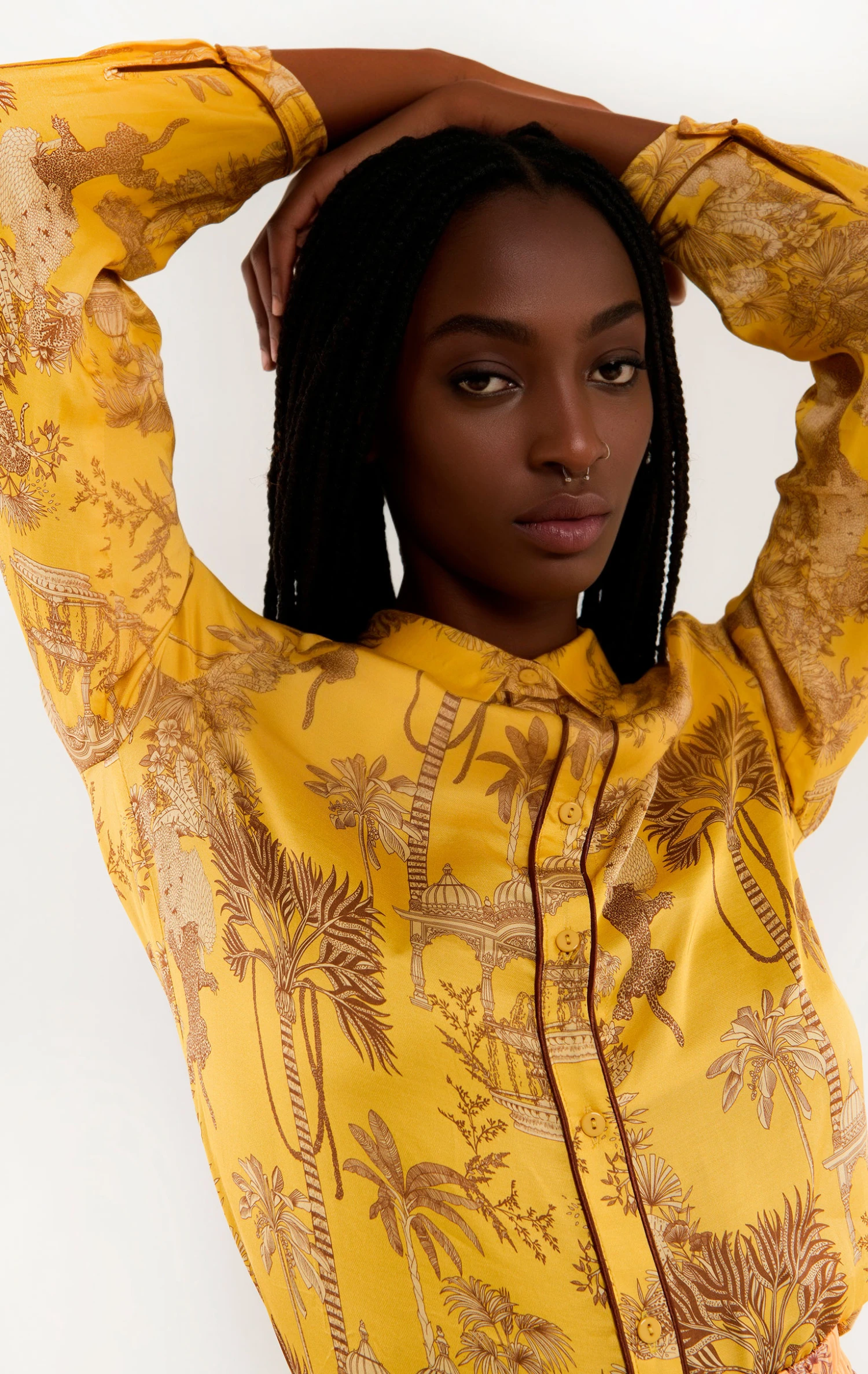 Son imprimé Jaipur jaune ocre aux motifs vanille et café se déploie en all over, avec élégance, sur un tissu délicieusement satiné. Sa forme ajustée et le piping qui descend de part et d’autre de la patte de boutonnage la structure avec élégance. En total look, portée avec le pantalon Rohan, ou dépareillée avec le pantalon Koffi ou la veste Kim, elle apportera un chic incroyable et unique à vos tenues. Declinée en 5 couleurs, on la retrouve ici dans un jaune ocre aux motifs vanille et cacao.