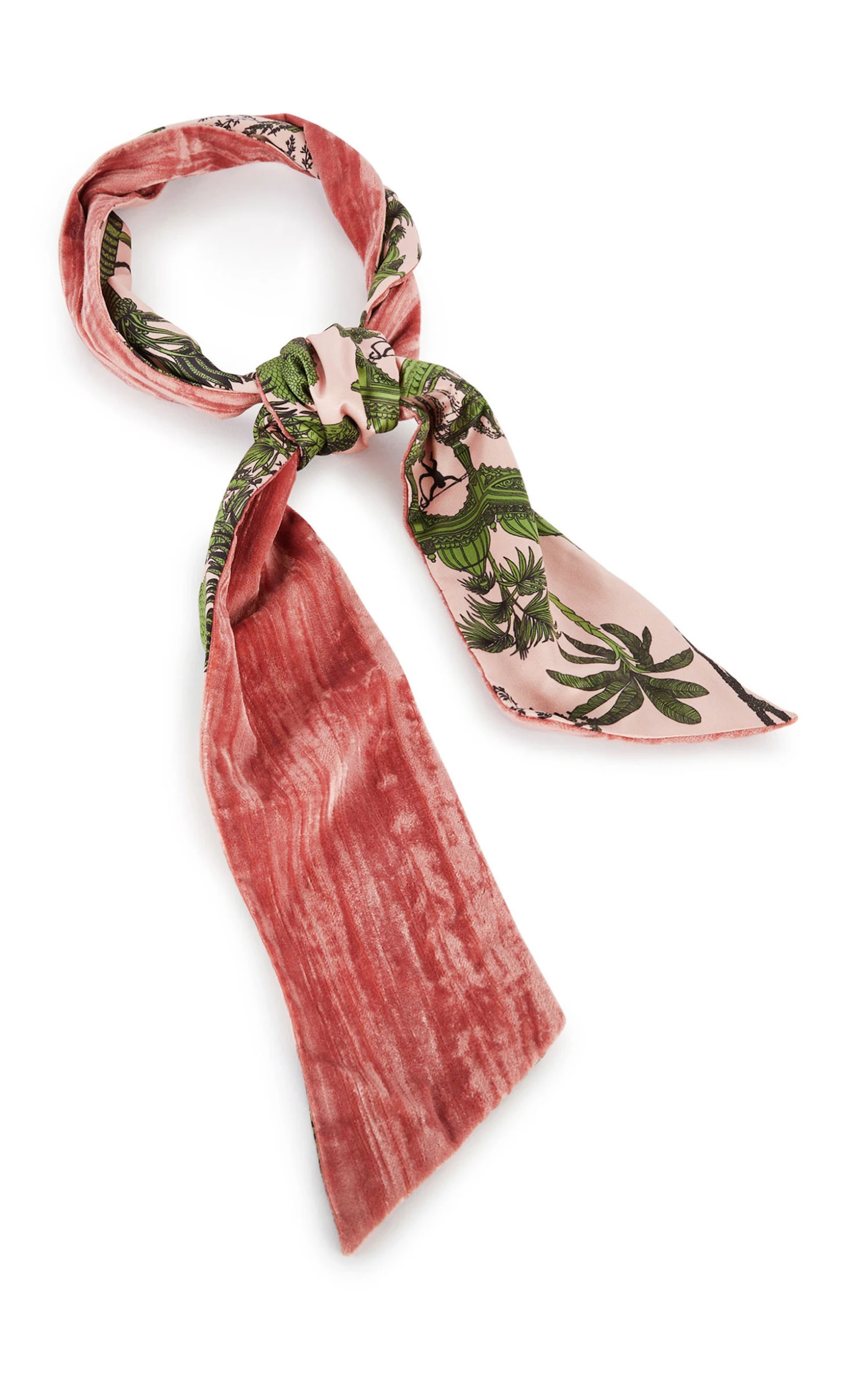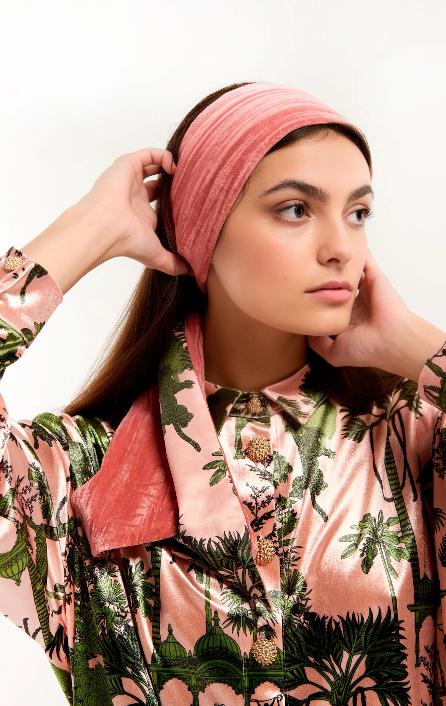 Fabriquée à partir d’un double tissu, velours ras d’un côté et imprimé Amber Palace de l’autre, Gaston se noue négligemment autour du cou, s’attache dans les cheveux ou se glisse dans les passants d’un pantalon… On l’adore et on la porte avec tout ! Elle existe en 5 couleurs, elle est ici couleur vieux rose pour le velours et le fond de l’imprimé et des motifs aux nuances noires et kaki.