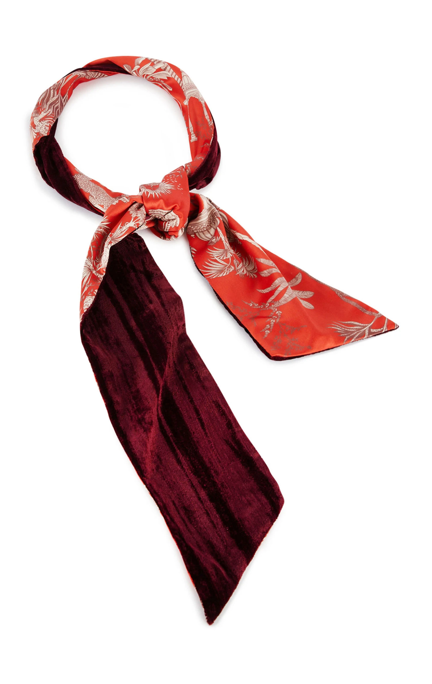 Fabriquée à partir d’un double tissu, velours ras d’un côté et imprimé Amber Palace de l’autre, Gaston se noue négligemment autour du cou, s’attache dans les cheveux ou se glisse dans les passants d’un pantalon… On l’adore et on la porte avec tout ! Elle existe en 5 couleurs, elle est ici couleur rouge carmin pour le velours et le fond de l’imprimé et des motifs aux nuances vanille et cacao.