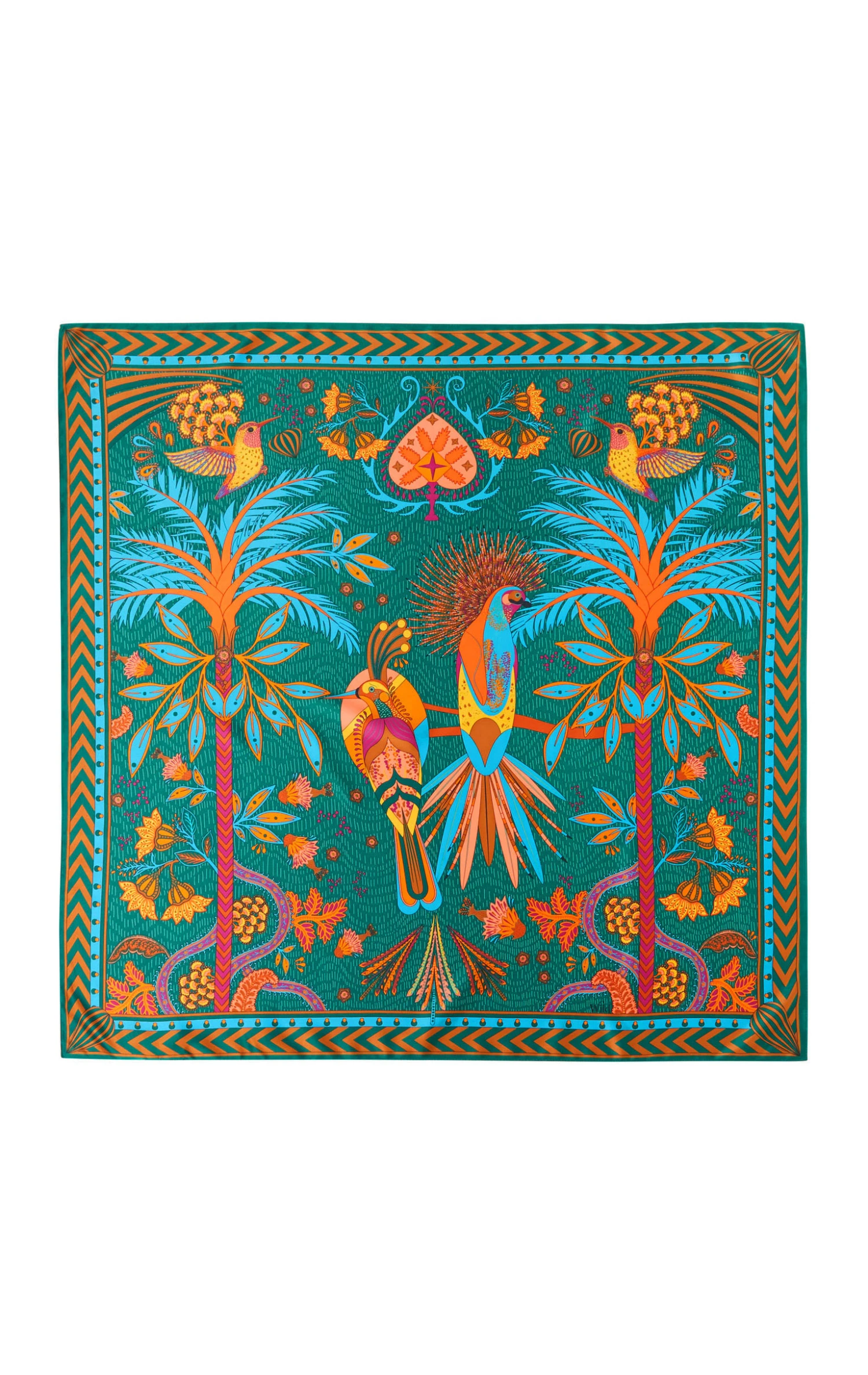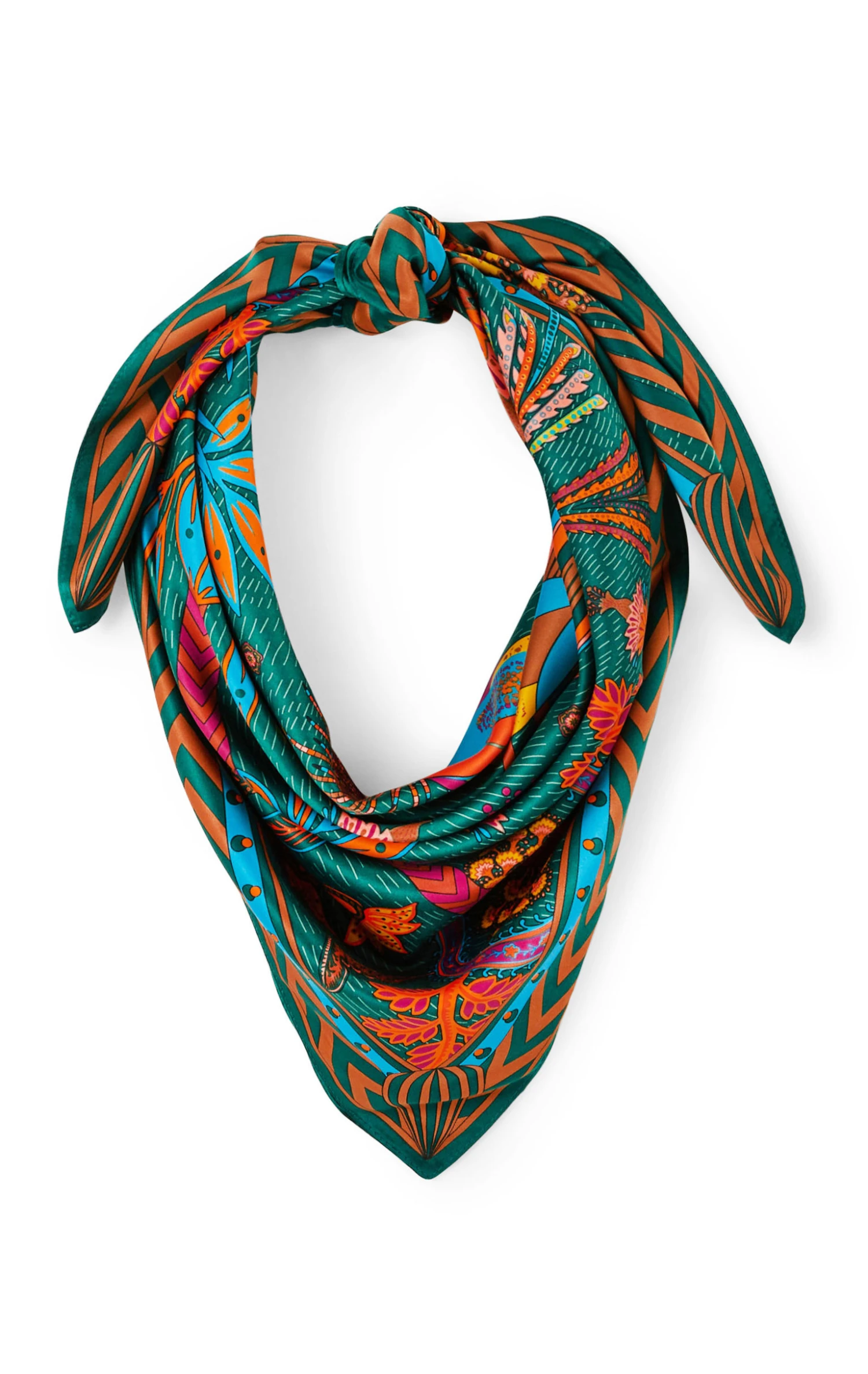 Vous est présenté ici le foulard Magic India, pièce maîtresse de la collection puisque son imprimé est aussi décliné sur tout un vestiaire de notre collection de prêt à porter. Il se décline en 5 coloris: ici dans sa version verte avec un fond vert bouteille et sa combinaison de couleurs turquoises, saumon, orange, et fuchsia. L’essence principale du thème MAGIC INDIA évoque un pays enchanteur, où une faune et une flore opulentes se déploient, parmi lesquelles émergent notre palmier adoré, des oiseaux de paradis et des plantes somptueuses. Peut se porter en foulard ou paréo selon le format, ou encore autour du cou, autour de la taille, en turban, ou encore autour de votre sac.