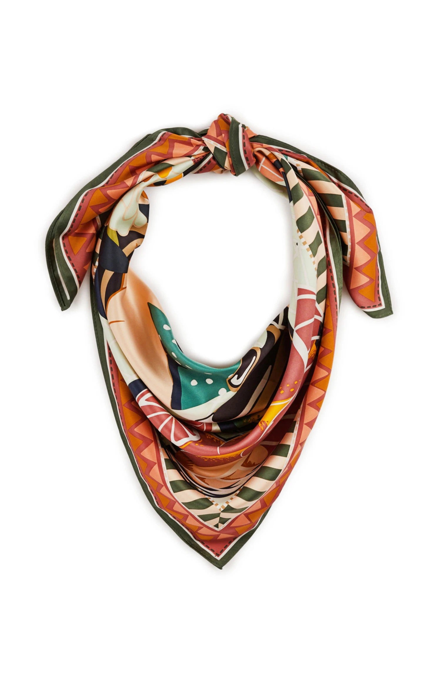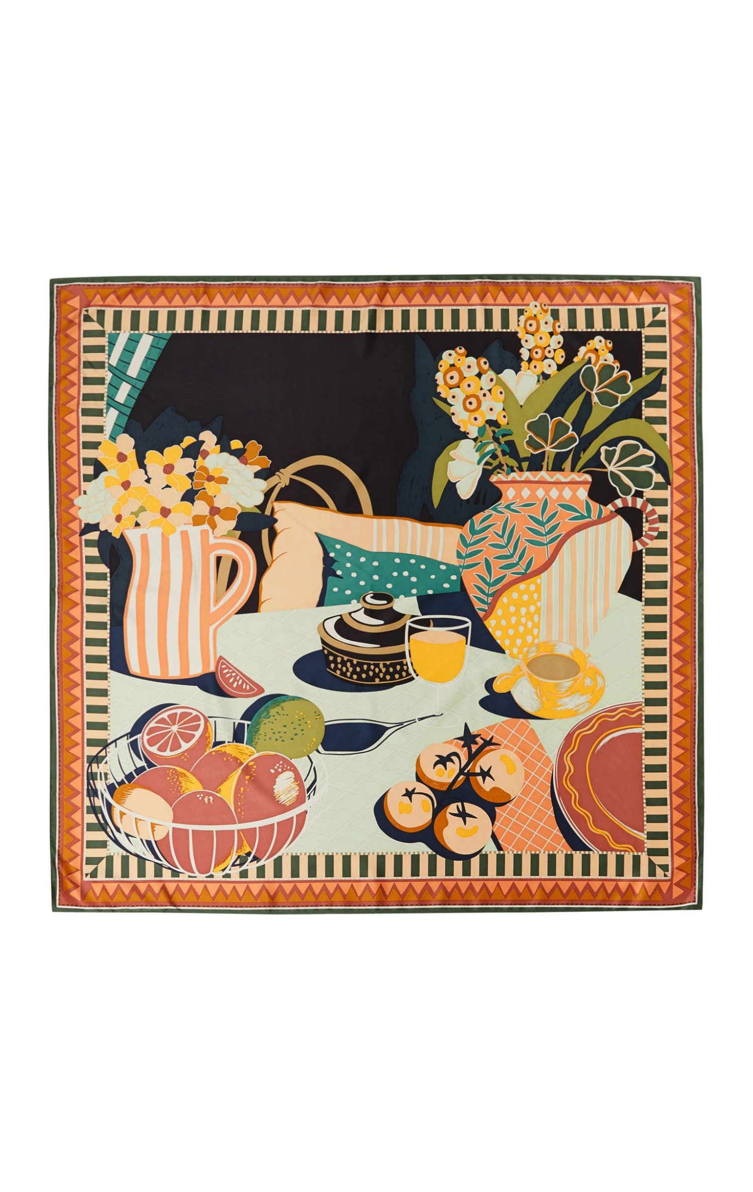 Vous est présenté ici le foulard Simone qui se décline en deux couleurs. Cet imprimé évoque une nature morte où des formes distinctes, presque découpées, se mêlent dans un style inspiré par Matisse, avec une touche impressionniste revisitée par WILD, encadrée par des motifs graphiques de lignes et de pois.