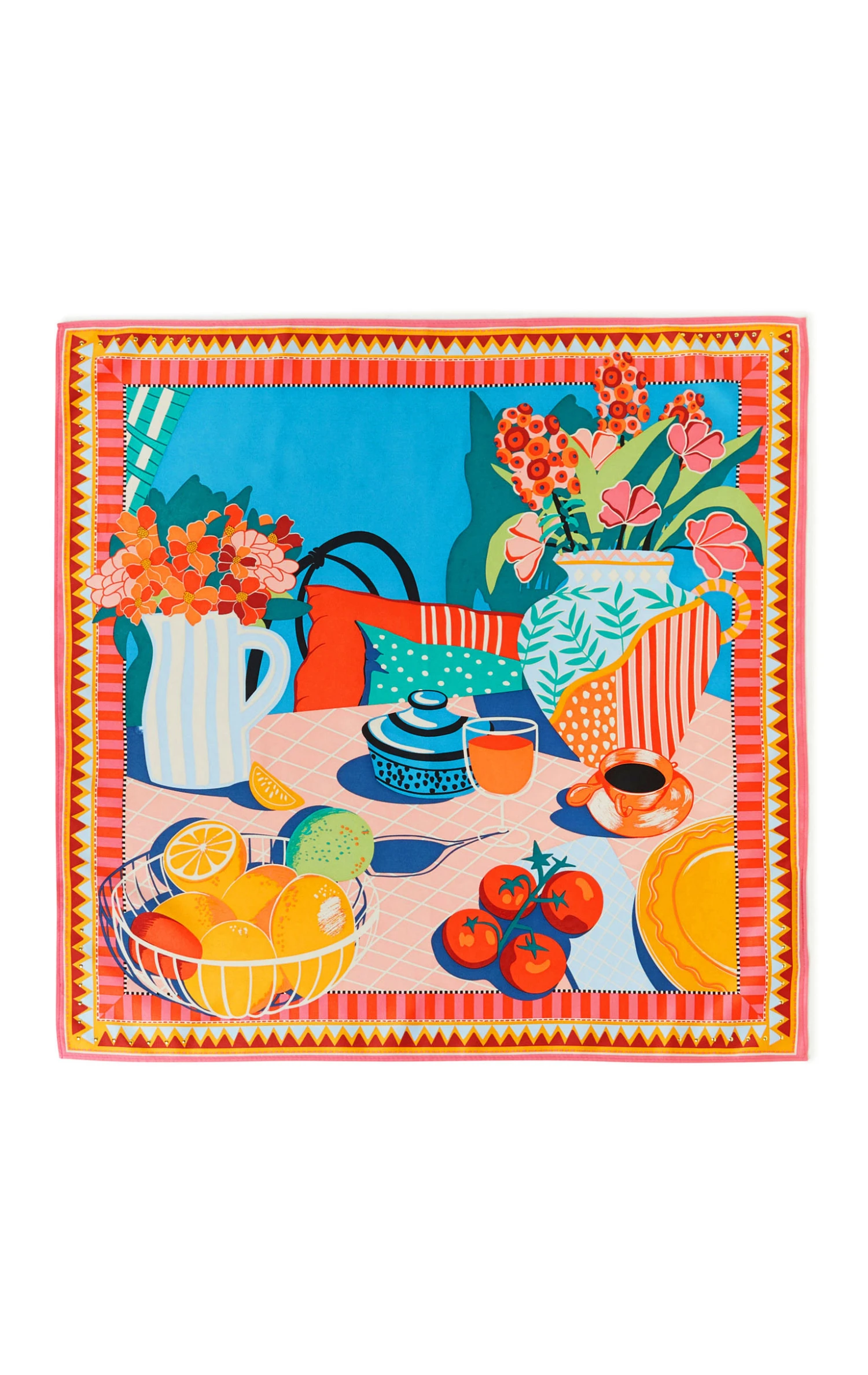 Vous est présenté ici le foulard Simone qui se décline en deux couleurs. Cet imprimé évoque une nature morte où des formes distinctes, presque découpées, se mêlent dans un style inspiré par Matisse, avec une touche impressionniste revisitée par WILD, encadrée par des motifs graphiques de lignes et de pois. Présenté ici en rose, il dévoile une palette de couleurs multicolores, allant du rouge au rose, du vert à l’orange, tempérées par des touches pastel. Il peut être porté en tant qu’écharpe, paréo en fonction du format, ou même autour du cou, à la taille, en turban, ou encore attaché à votre sac.