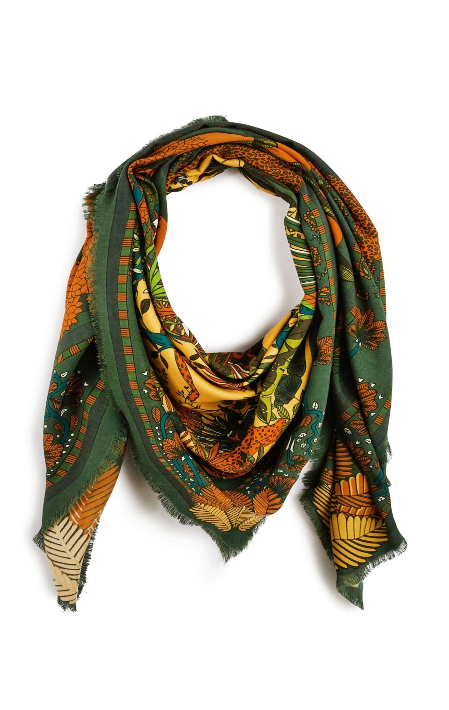 Il vous est présenté ici l’imprimé Amber Palace, qui se décline en 3 coloris: une version vert kaki sur fond bleu cyan et une combinaison de couleurs vert, ocre, kaki, bordeaux et noir. L’essence principale du thème Amber Palace se reflète dans les symboles emblématiques de la terre et de la culture indiennes : les domes délicatement ouvragés rappelant de la dentelle et une végétation luxuriante, notamment des palmiers somptueux, chers à la marque. Peut se porter en foulard ou paréo selon le format, ou encore autour du cou, autour de la taille, en turban, ou encore autour de votre sac.