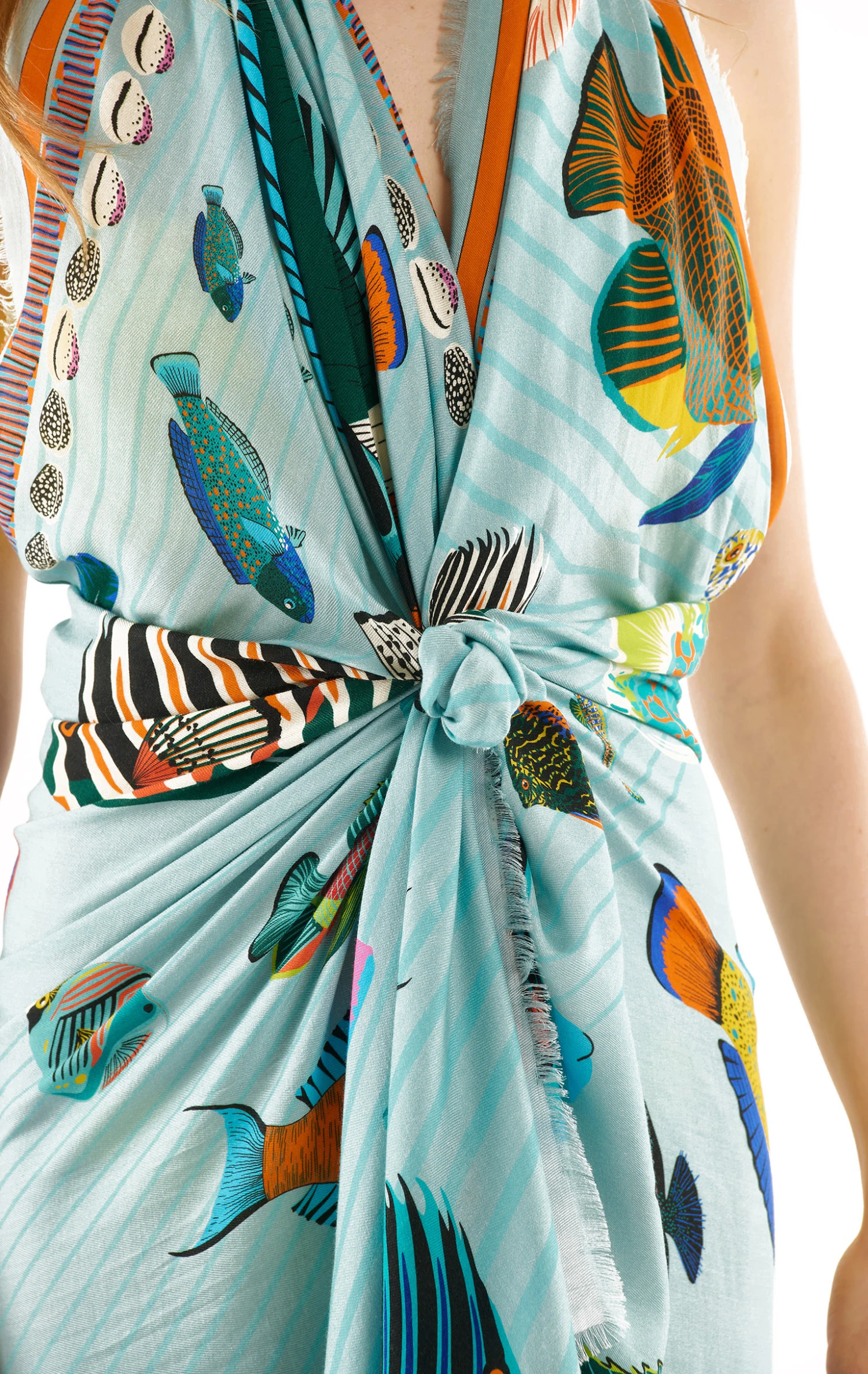 Vous est présenté ici l’imprimé Ocean Drive, qui se décline en trois coloris et nous plonge dans l’univers aquatique et ultra estival où poissons colorés, aux nuances de bleu et de vert doucement désaturées ondulent sur un fond bleu ciel, ponctué de touches oranges et noires.
