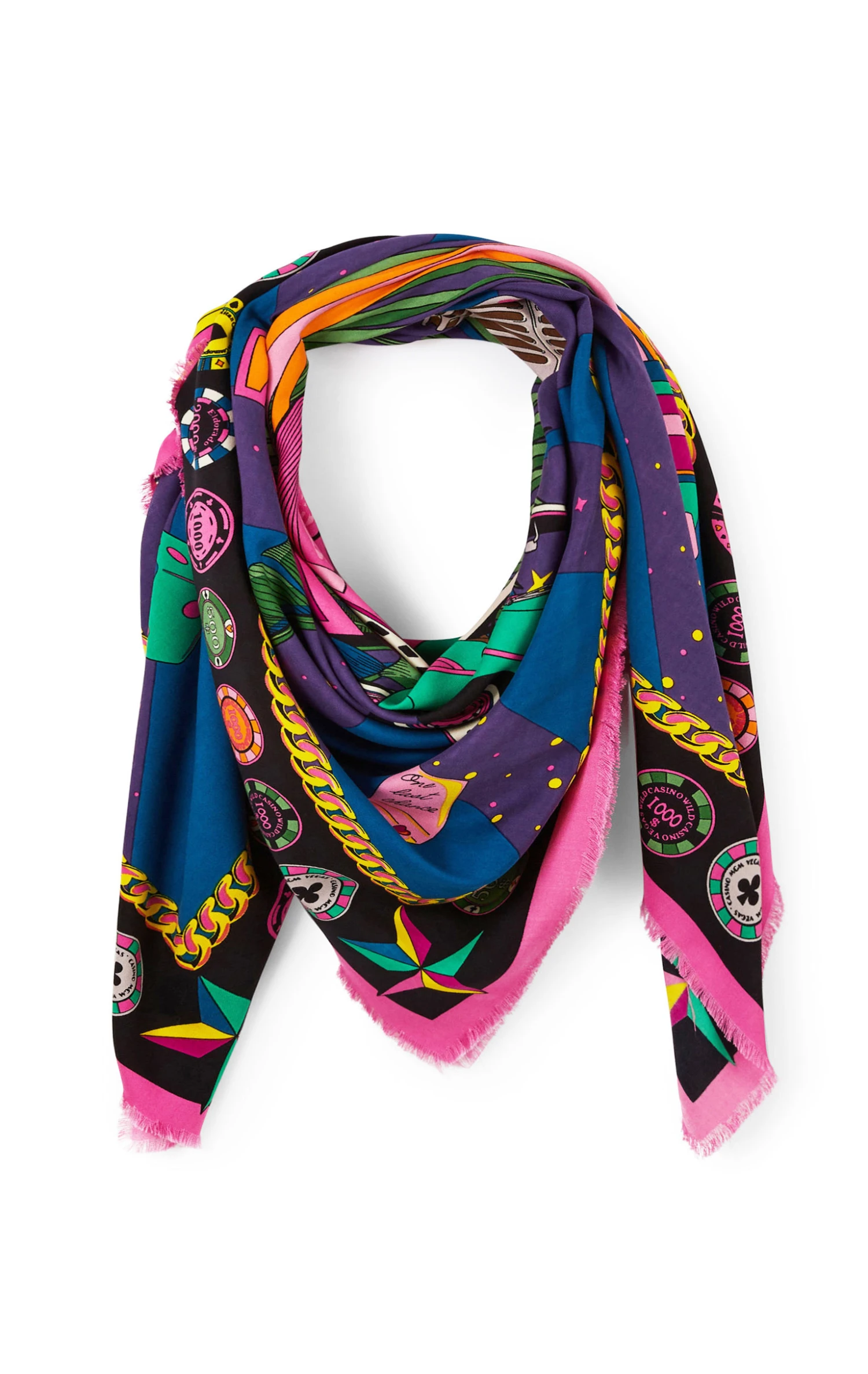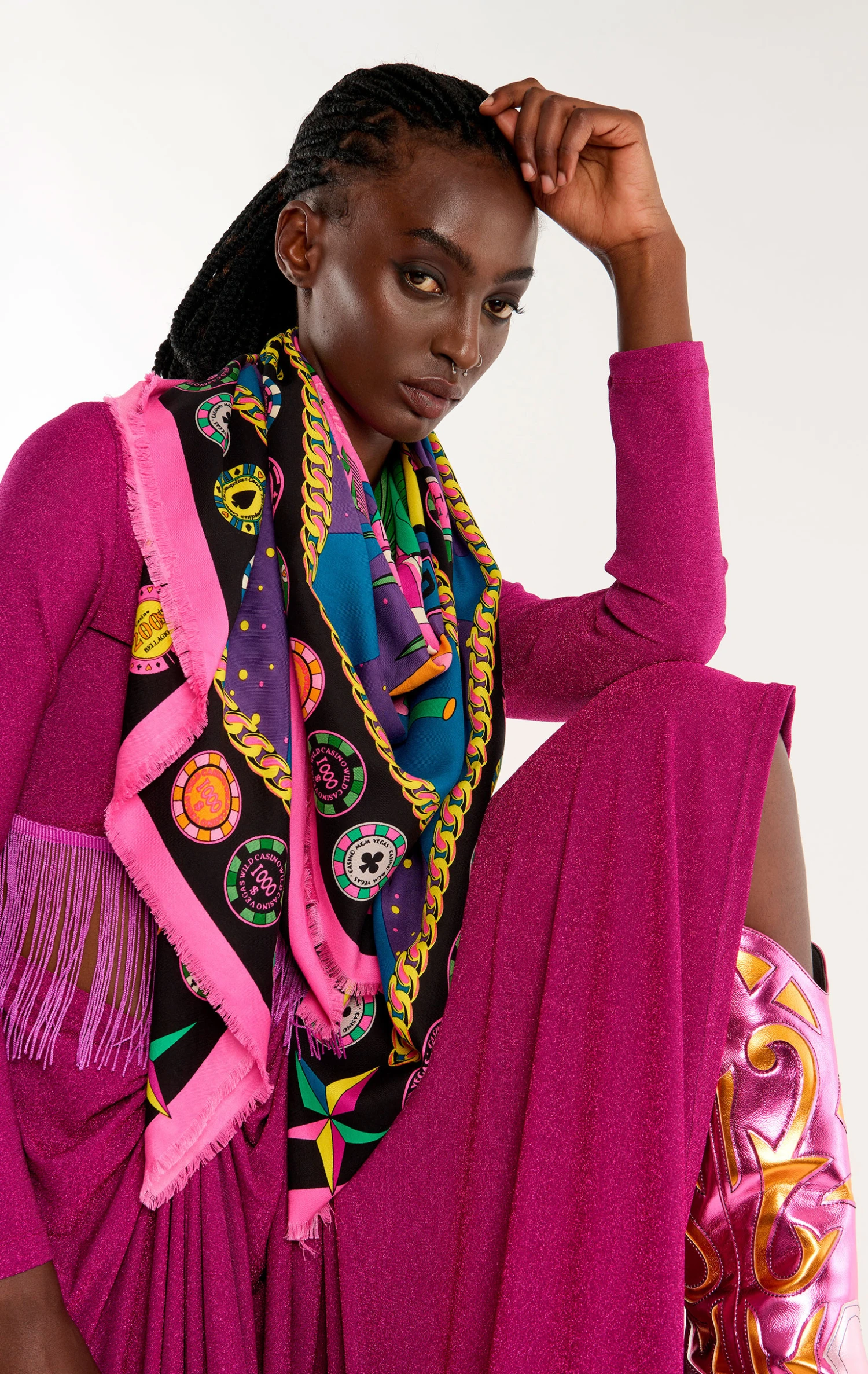 Vous est présenté ici le foulard Vegas qui se décline en trois couleurs. L’imprimé évoque l’excitation et l’éclat de Las Vegas ainsi que ses symboles emblématiques tels que les dés et les célèbres enseignes lumineuses, dans un style vibrant et détonant. Présenté ici en version rose, il mixe avec brio les couleurs violettes, fuchsia, vert olive et orange. Peut se porter en foulard ou paréo selon le format, ou encore autour du cou, autour de la taille, en turban, ou encore autour de votre sac.