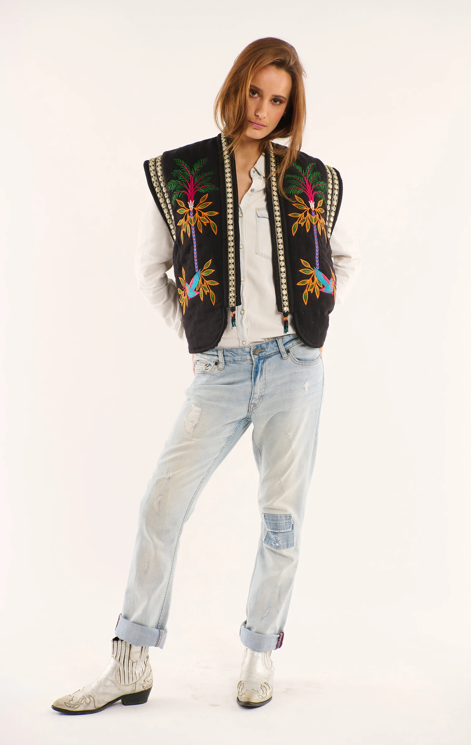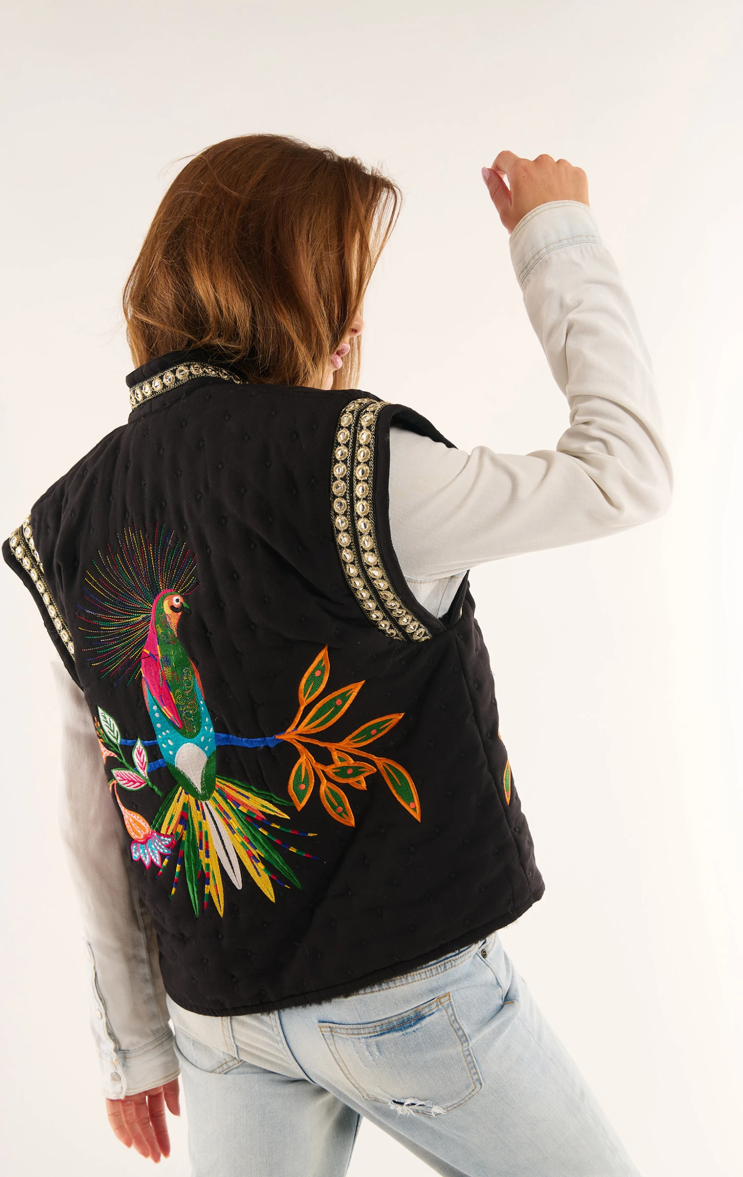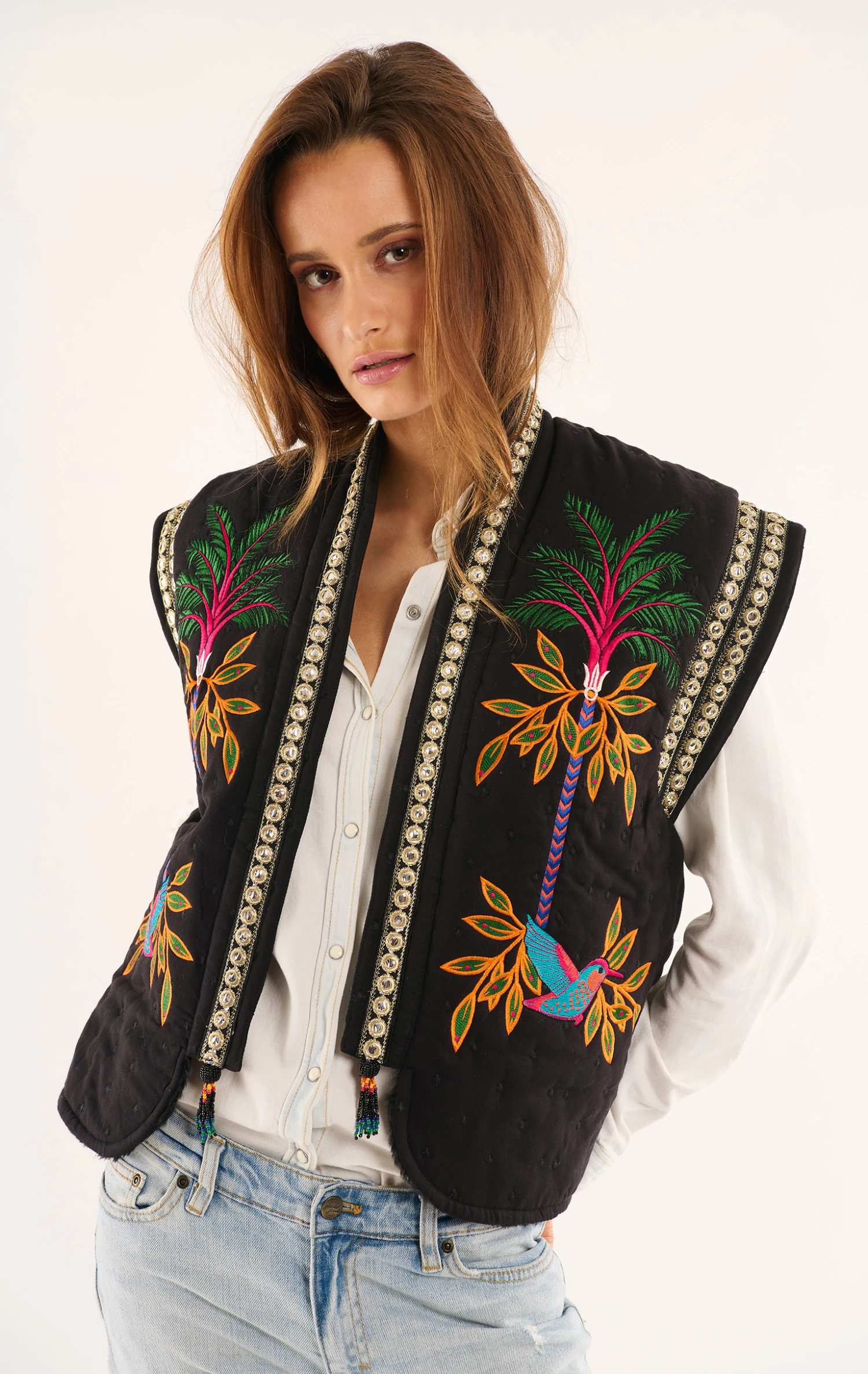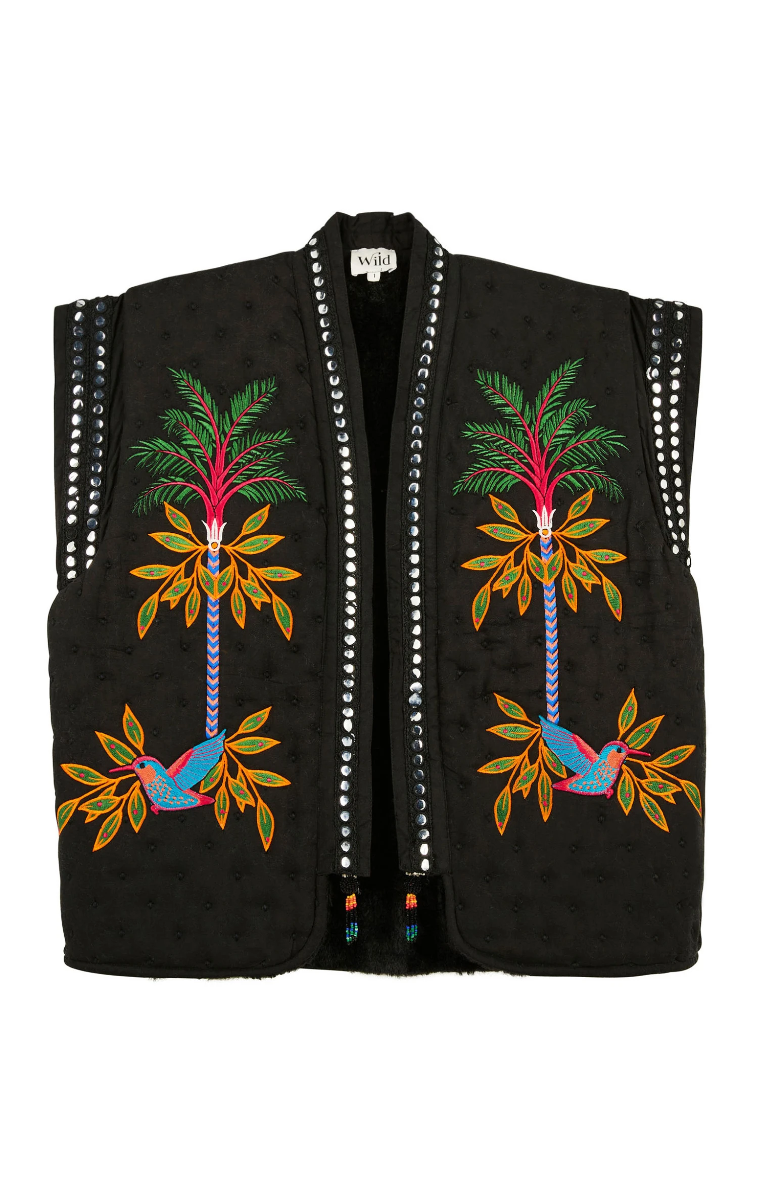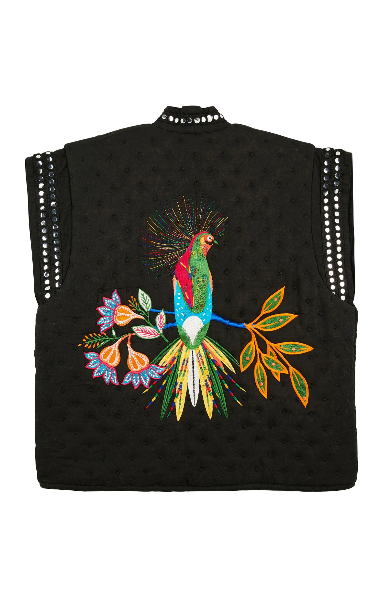 Ce gilet sans manches se pare avec ostentation de l’imprimé emblématique de notre thème, Magic India, en arborant fièrement un oiseau de Paradis dans le dos et deux palmiers XXL brodés de part et d’autre de son encolure, elle-même soulignée par un ruban brodé de petites pièces miroir, très 70’s. Confectionné dans un twill très doux, Bay et sa coupe légèrement oversize associent à la perfection une tenue très confortable et un look fashion et contemporain. Décliné en deux couleurs, il est ici dans sa version noire arborant des motifs brodés aux riches nuances de vert, fuchsia, orange, turquoise, jaune et bleu Klein. Il se porte avec absolument tout et ne vous quittera pas de l’hiver !