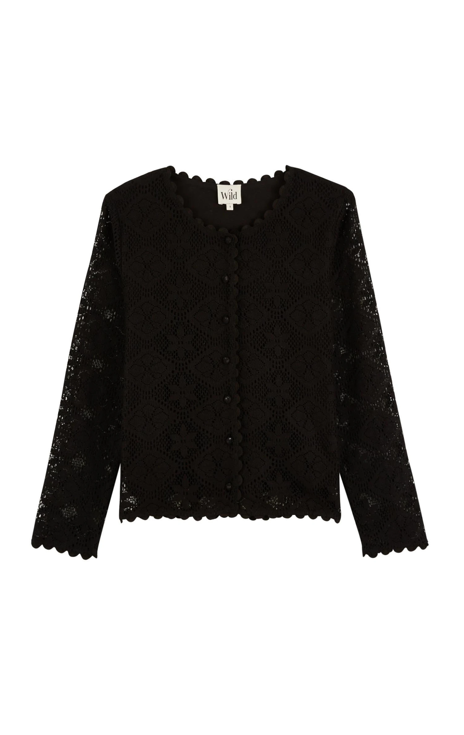 Confectionné en un léger crochet dentelle avec une touche d’élasthanne pour un confort optimal, il est entièrement doublé en matière jersey sur le devant et peut ainsi se porter sans rien en dessous. Son col rond, assez haut sur le buste, souligne élégamment la nuque et le port de tête et pour parfaire son caractère très féminin, un adorable croquet court sur le bas de vêtement et le bas de manche, ainsi que sur l’encolure et de part et d’autre de la patte de boutonnage. Court et légèrement cintré, on le porte avec un jean pour un look un peu décalé ou assorti ou pantalon Kayle pour un total look 70’s en noir, blanc cassé ou vert menthe.
