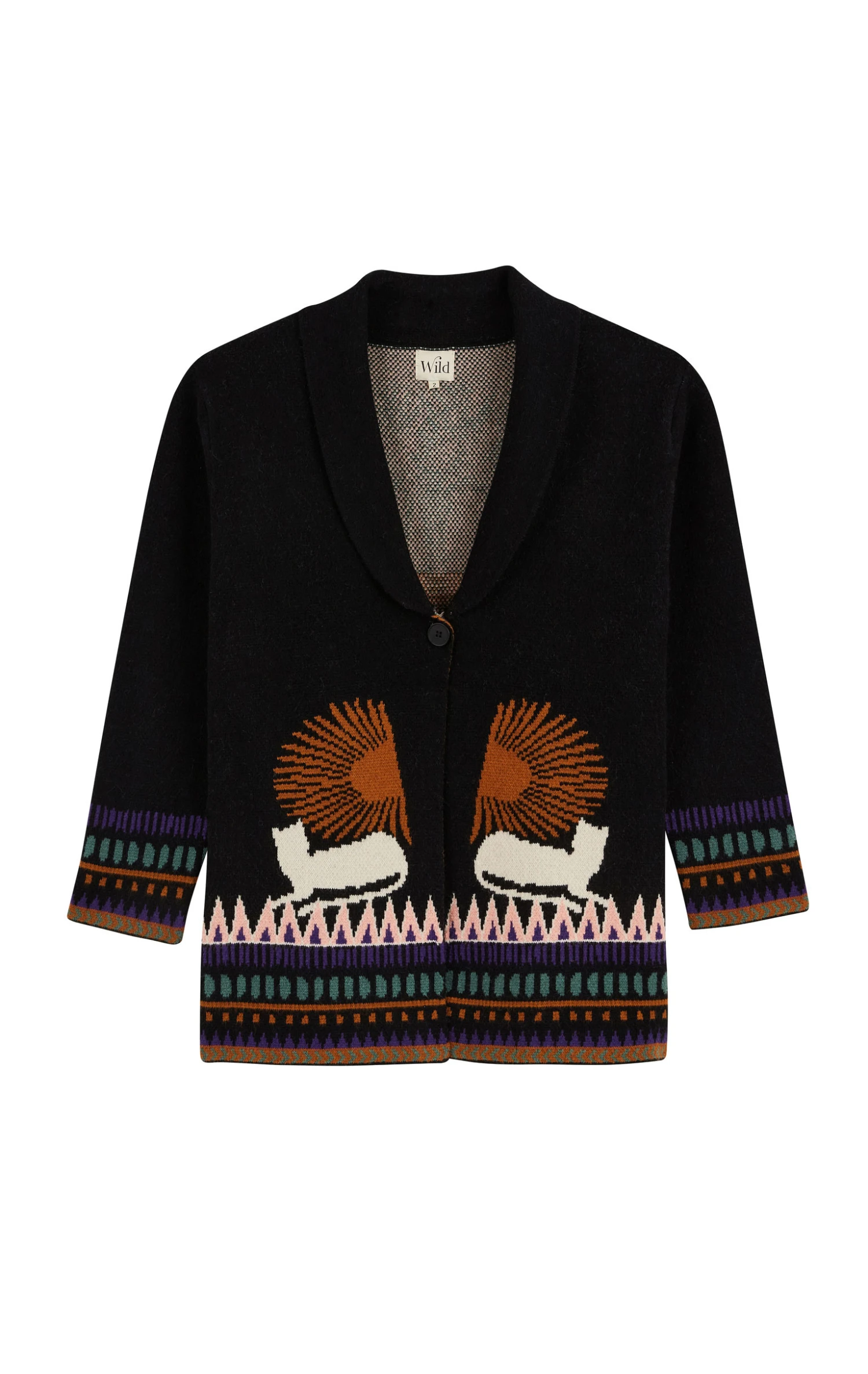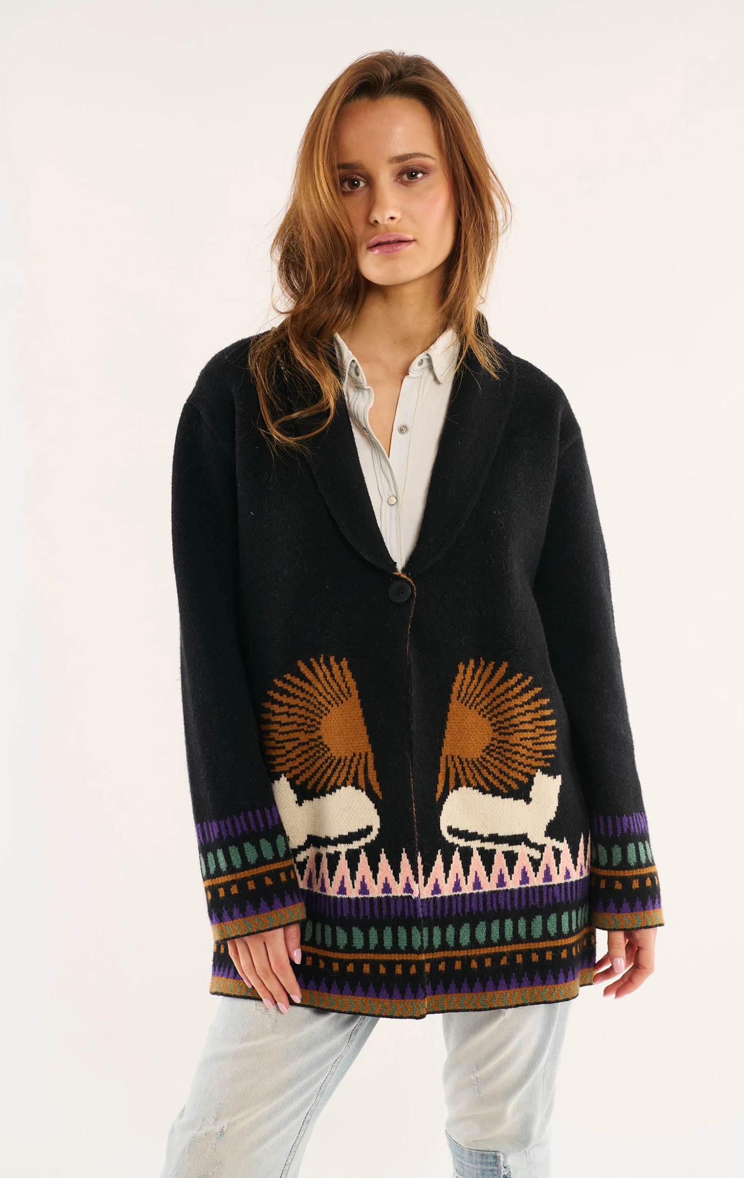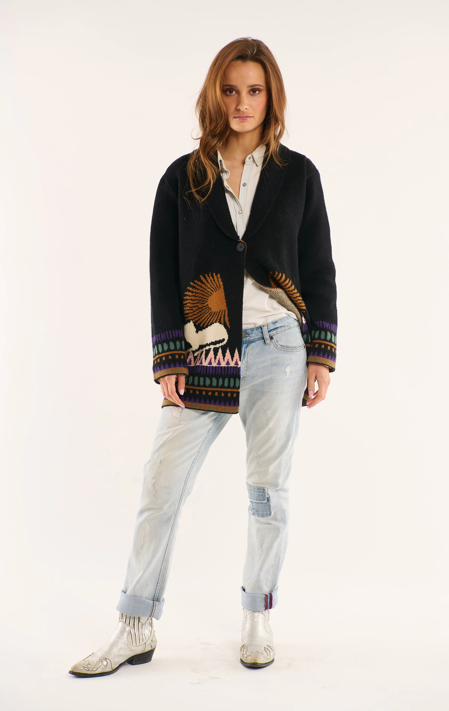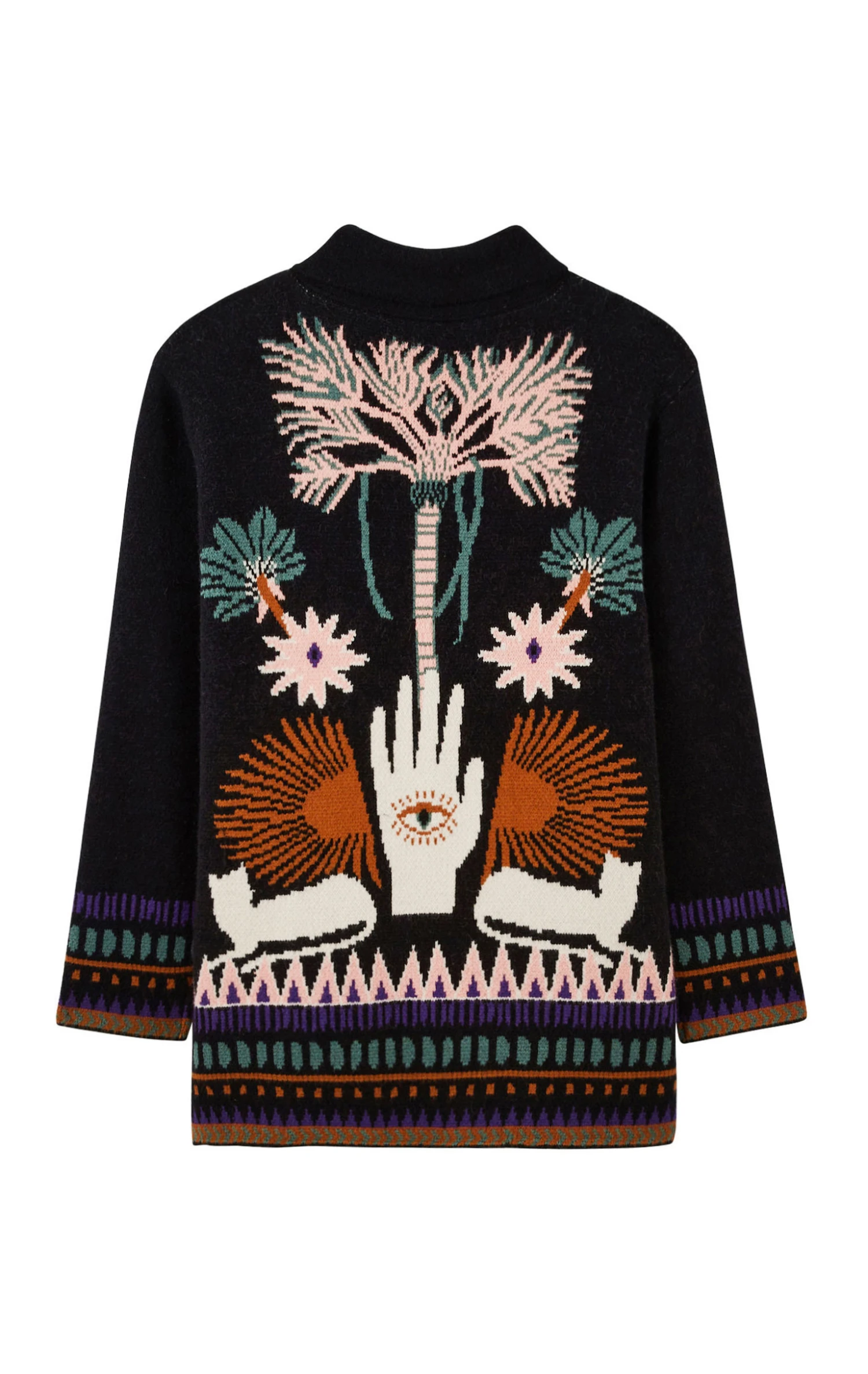 On y retrouve des symboles ésotériques comme la main protectrice mais aussi des palmiers et des lignes graphiques aux allures de predelles, évoquant la structure des bracelets brésiliens. Veste cocoonning par excellence à la fois chaude et légère, elle se porte cintrée et fermée comme un gilet ou en veste ouverte.