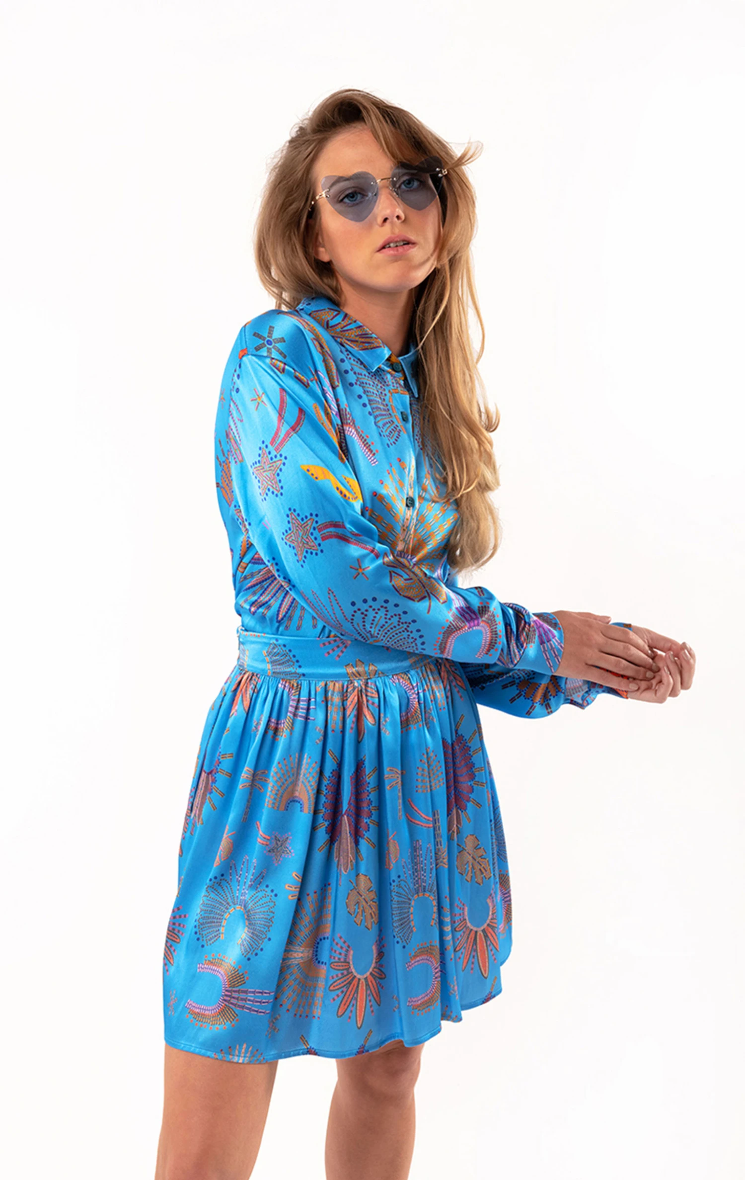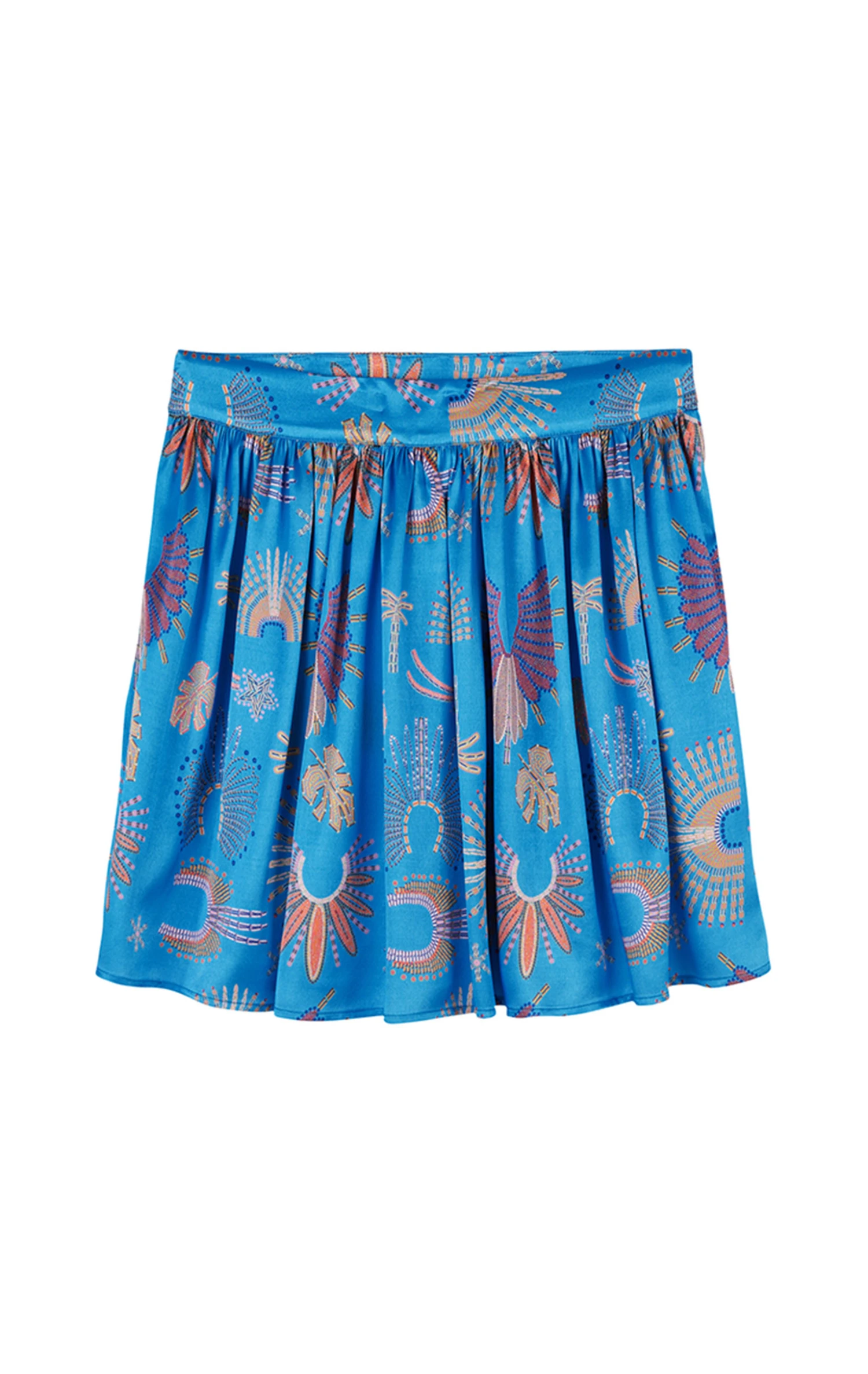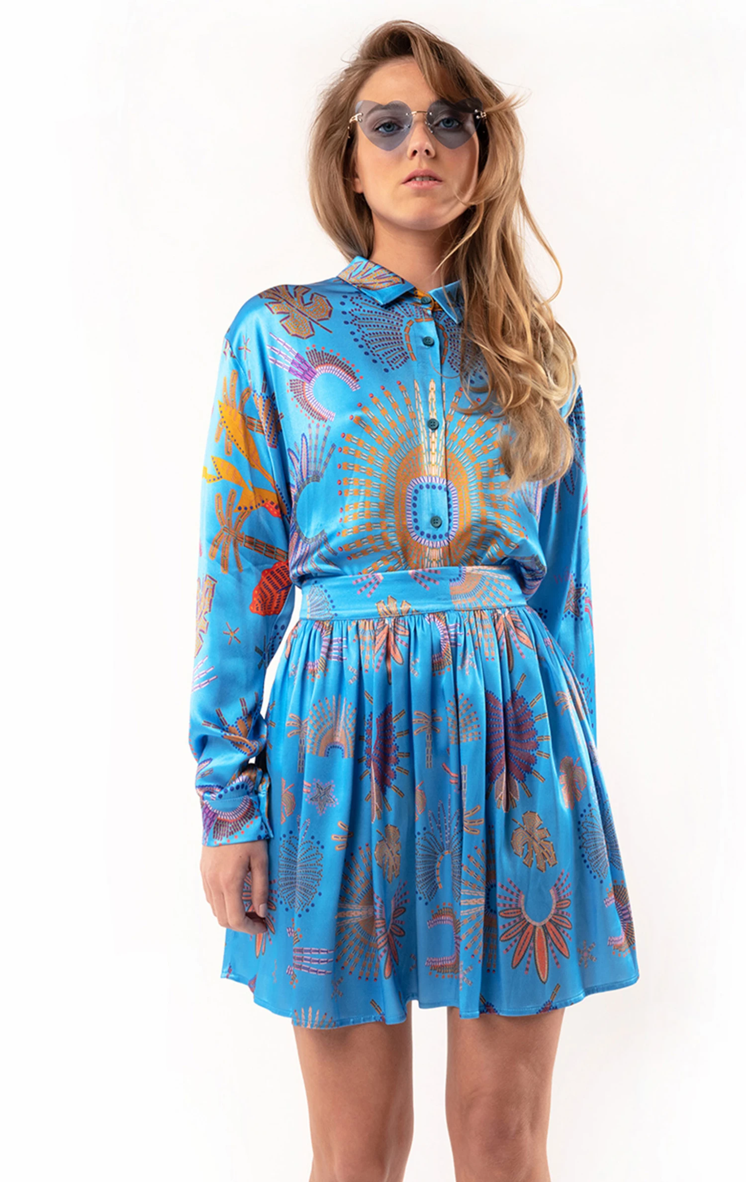 La pièce parfaite pour danser la lambada! Notre jupe courte dans une matière satinée reprend le motif Wakiza, où l’on retrouve ce paysage luxuriant, les couronnes de plumes amazoniennes, les palmiers, les étoiles filantes, façon perles brodées, dans des tons orange, rose, violet, ocre, bleu Klein. Fermée sur le côté avec un zip invisible, elle est serrée à la taille et vous assure un ravissant mouvement. À porter en twin-set avec la chemise Coppelia.