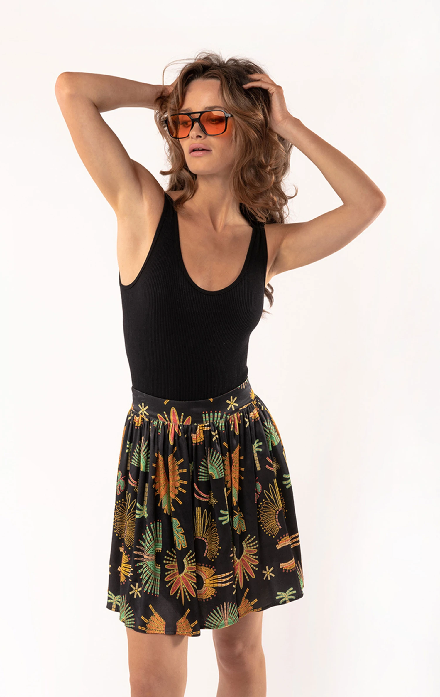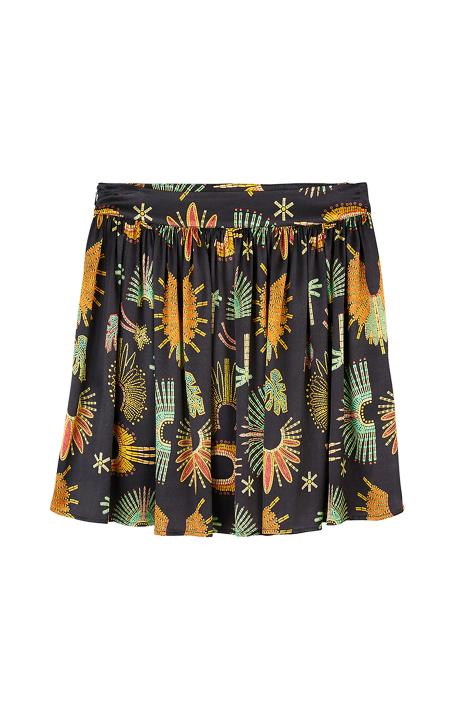 La pièce parfaite pour danser la lambada! Notre jupe courte dans une matière satinée reprend le motif Wakiza, où l’on retrouve ce paysage luxuriant, les couronnes de plumes amazoniennes, les palmiers, les étoiles filantes, façon perles brodées, dans des tons vert, jaune, blanc et rouge. Fermée sur le côté avec un zip invisible, elle est serrée à la taille et vous assure un ravissant mouvement. À porter en twin-set avec la chemise Coppelia.