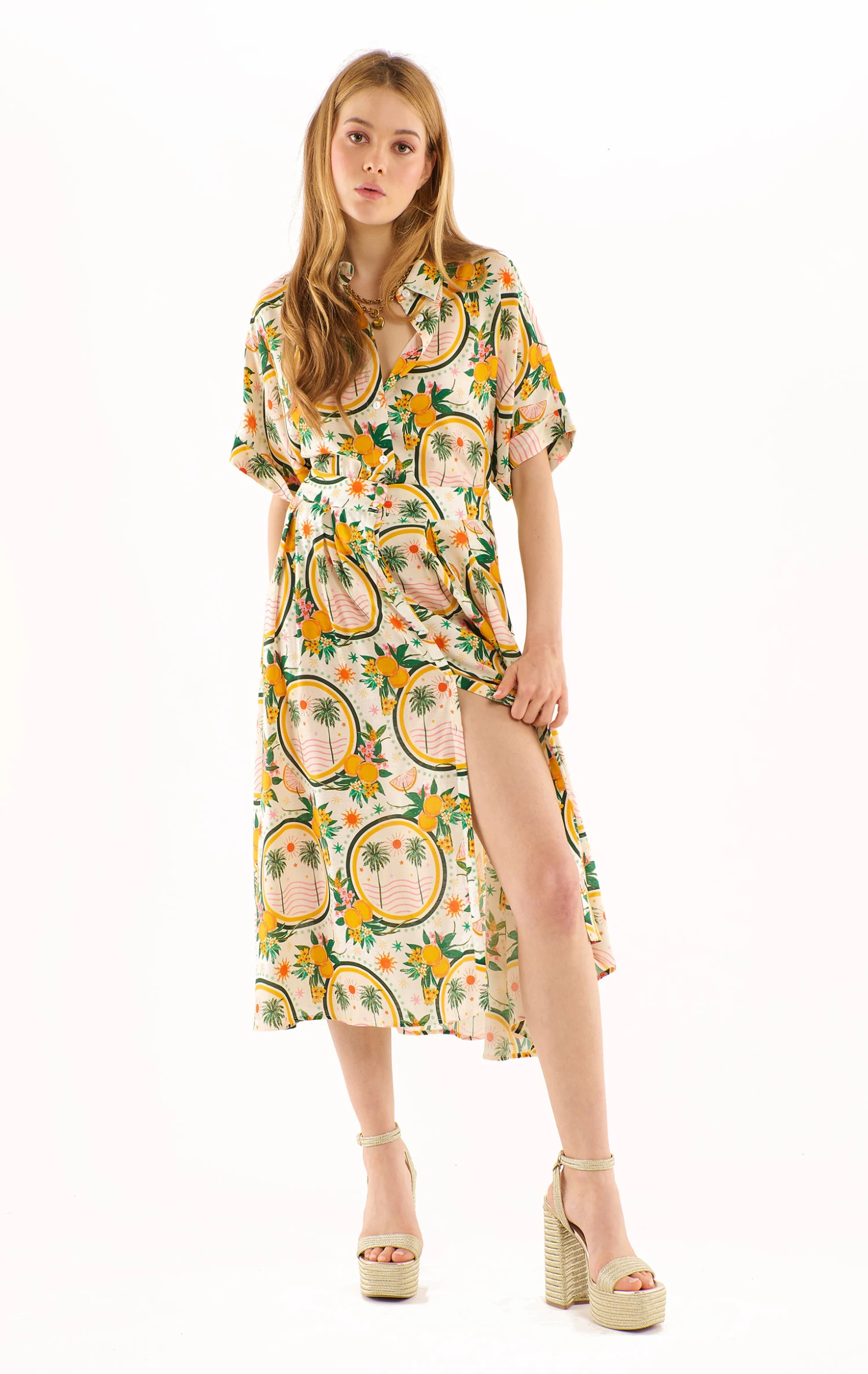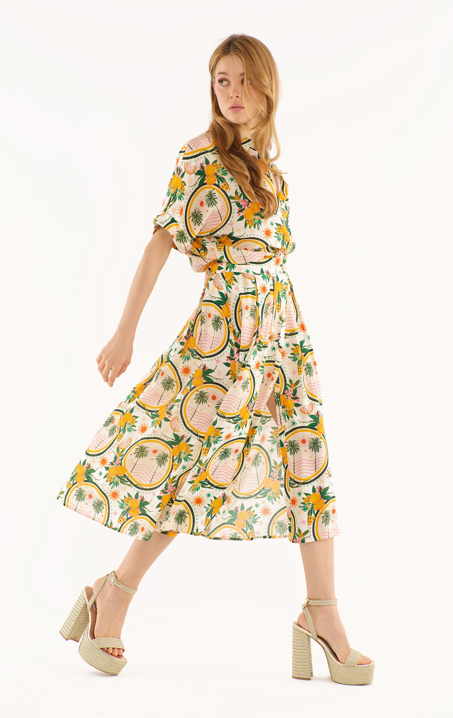 La jupe Bobbie est une jupe de longueur 7/8ème en lin rayonne, matière qui lui confère un volume léger et aérien, accentué par sa fente avant qui laisse joliment dévoiler les genoux. Son imprimé en all over raconte l’Italie du Sud avec un harmonieux mélange de palmiers et d’oranges dans des nuances très estivales de jaune oranger et de vert bouteille soutenu, le tout parsemé de touches roses. Elle s’ouvre sur le côté par un zip, flatte la silhouette et souligne la taille par une jolie ceinture plaquée.