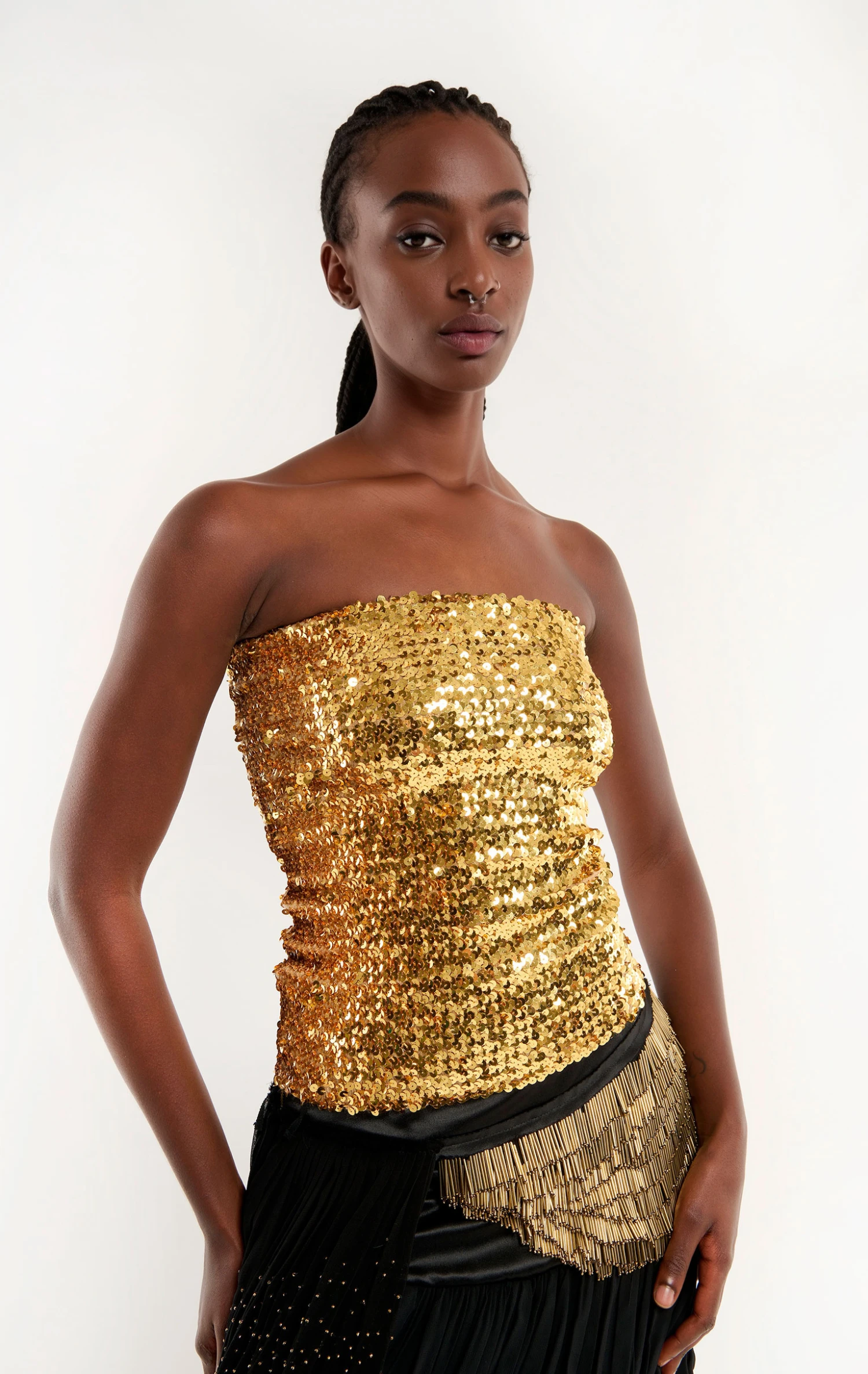 Grâce à sa structure tubulaire et à sa souplesse, vous avez la possibilité de la porter soit en jupe, soit en bustier. Elle apportera une touche disco à une tenue classique ou vous permettra de créer un total look en l’associant à une Iwa d’une teinte différente. Elle se décine en 3 couleurs, ici dans sa version dorée.