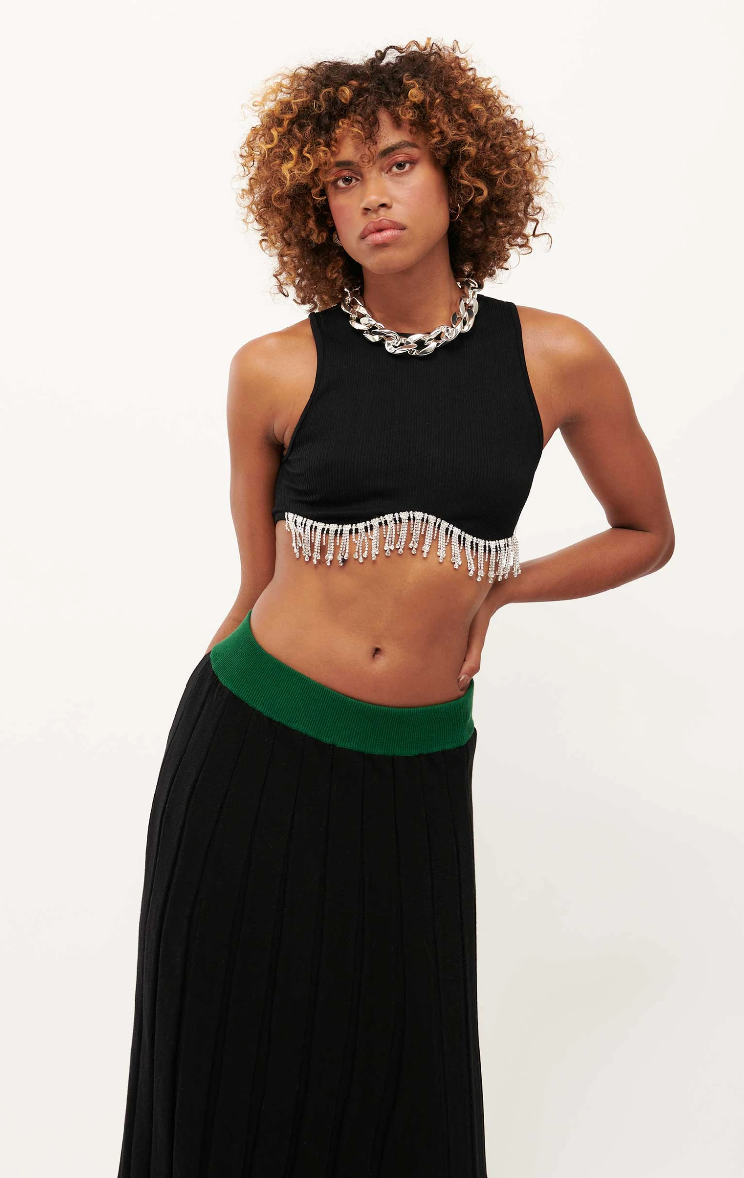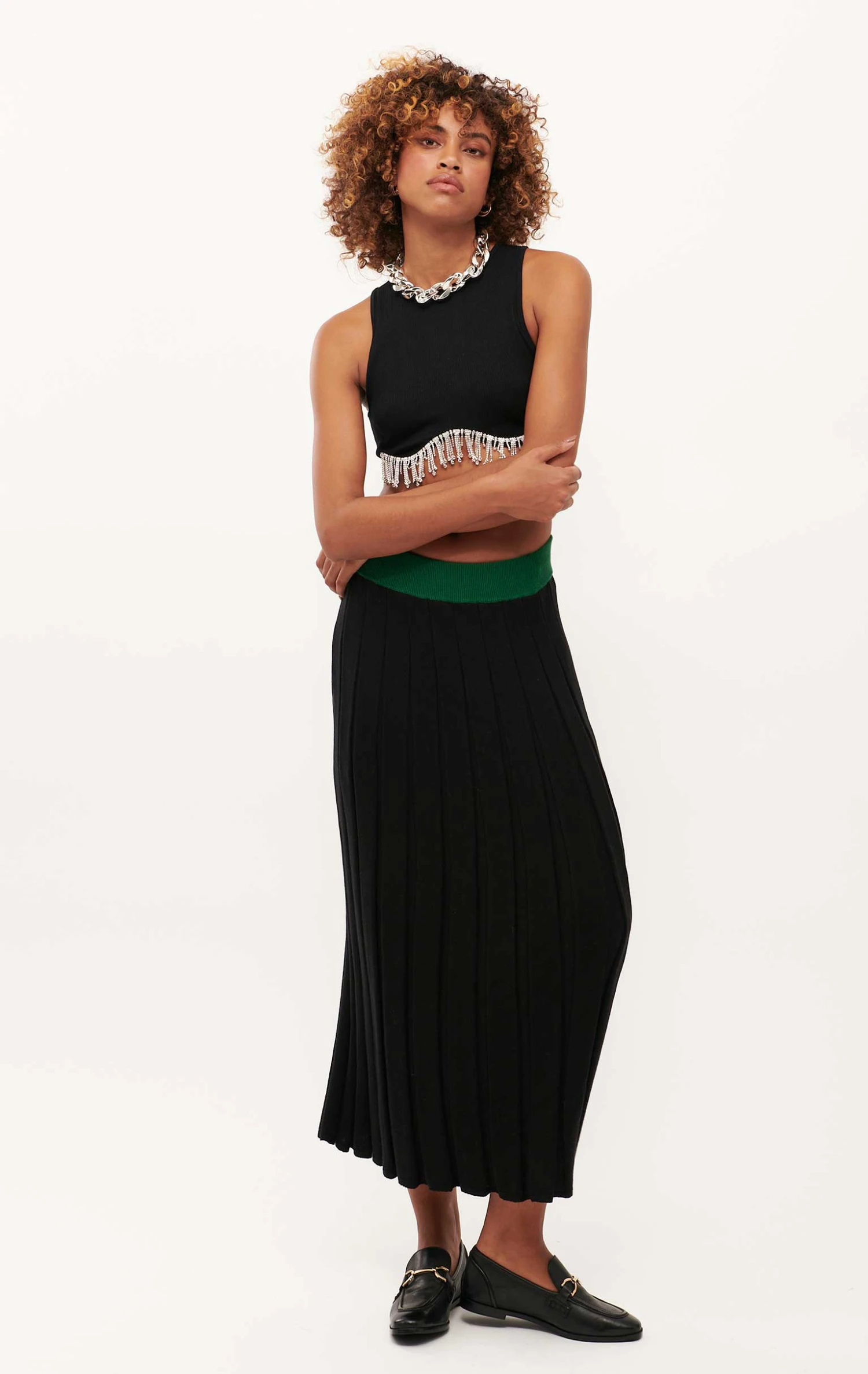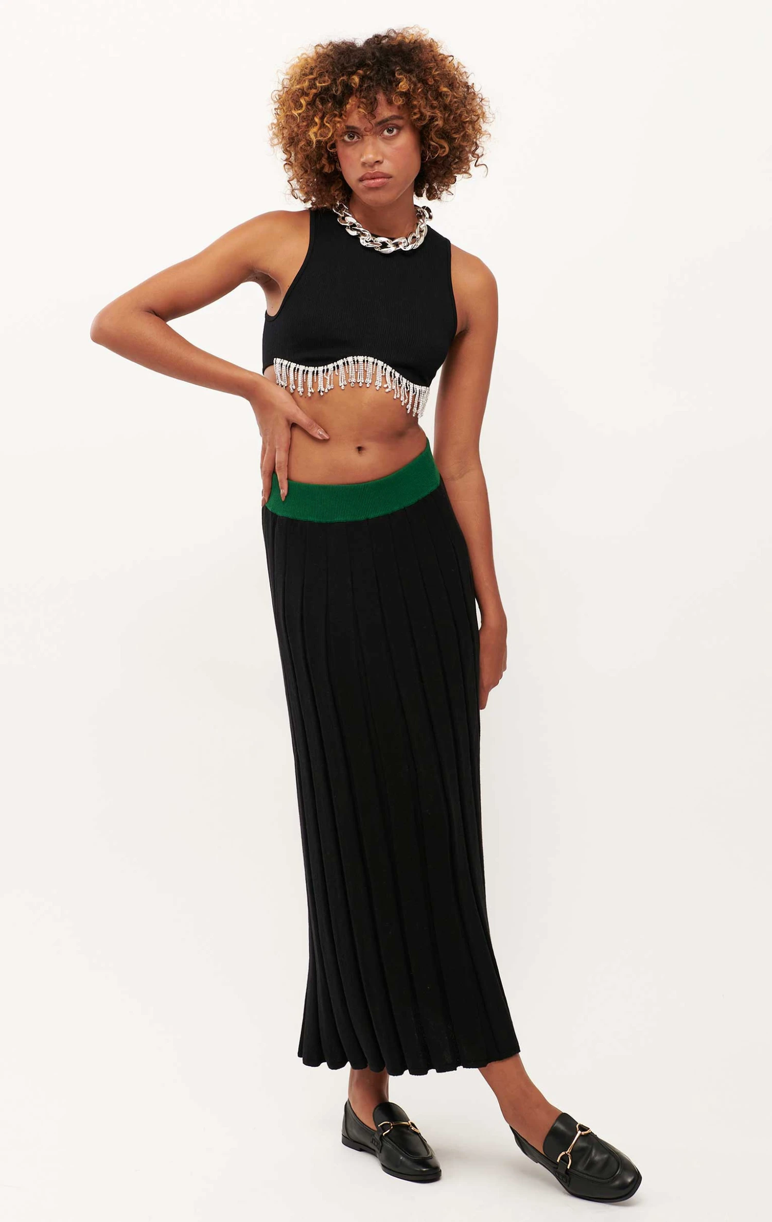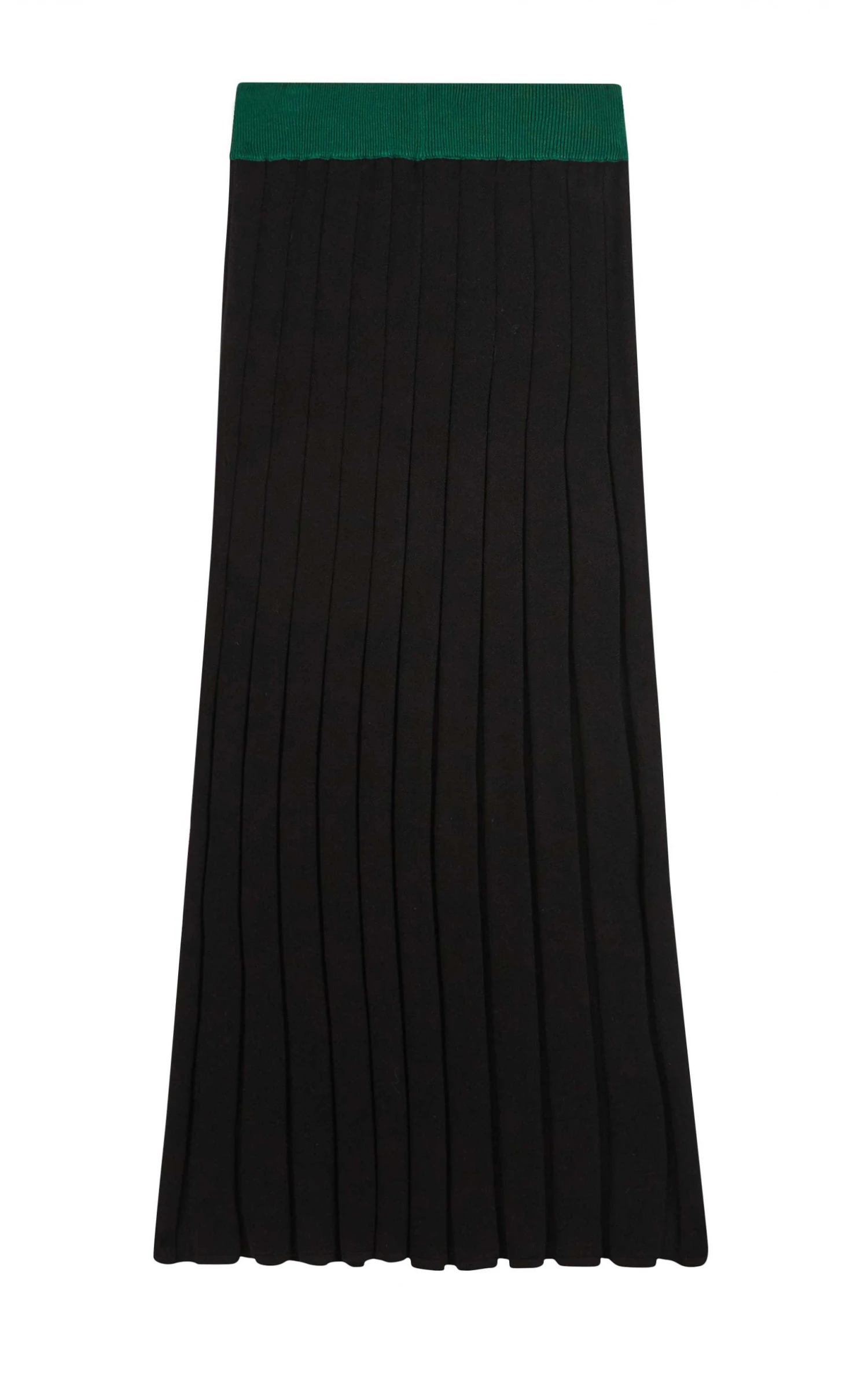 Jupe en maille, longueur chevilles, plissée bicolore noire avec ceinture verte.