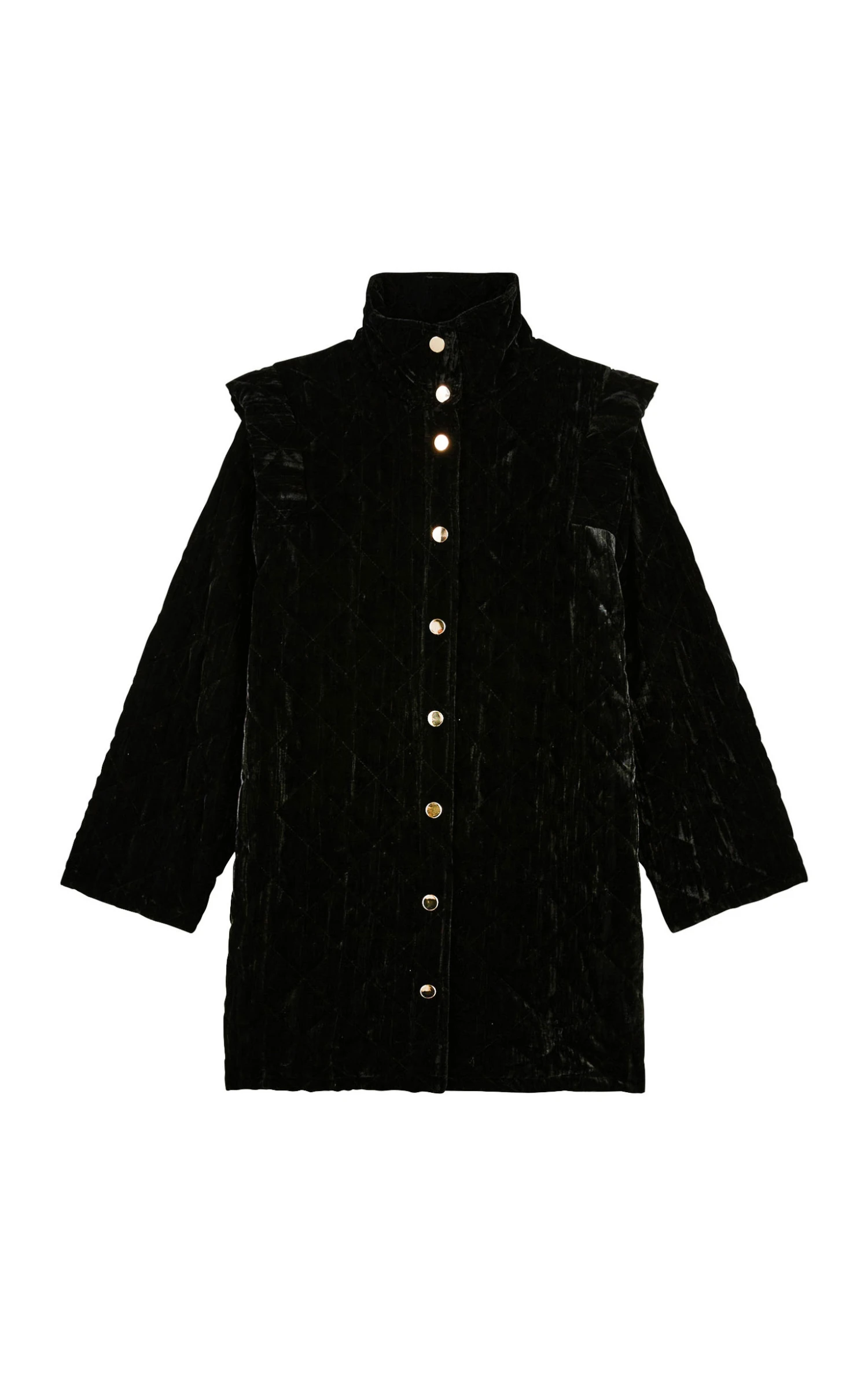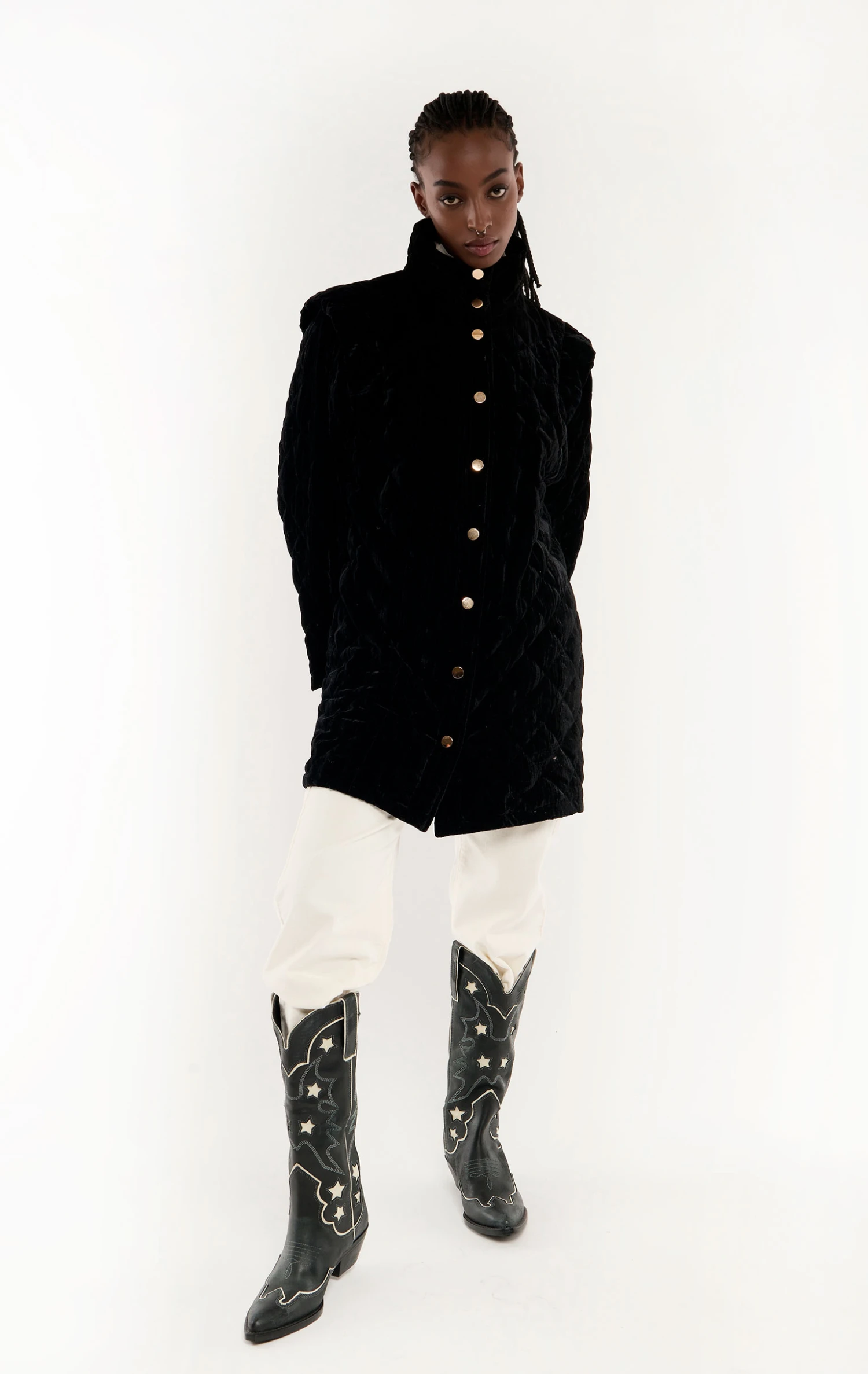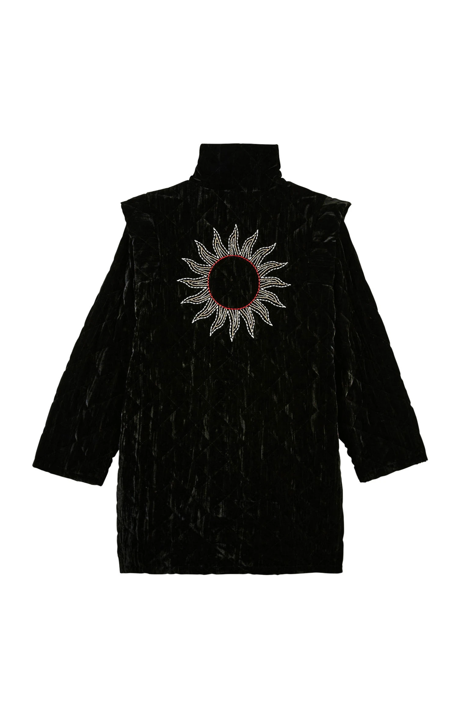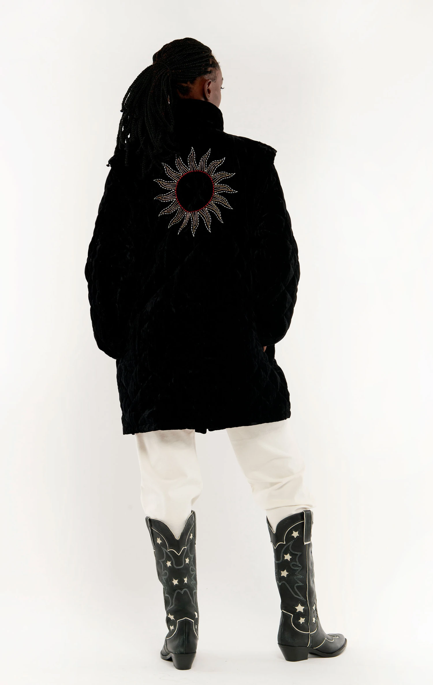Il arbore dans son dos un magnifique soleil entièrement brodé à la main et interprété en perles de rocaille dorées et argentées. Pour un confort optimal, sa longueur descend aux genoux et il se ferme, tout le long, par une patte de boutonnage à pressions dorées et son col montant vous maintient bien au chaud. Notre emblématique imprimé Jaipur jaune maïs s’est glissé dans la doublure pour parfaire cette magnifique pièce à manches à l’allure délicieusement rétro.