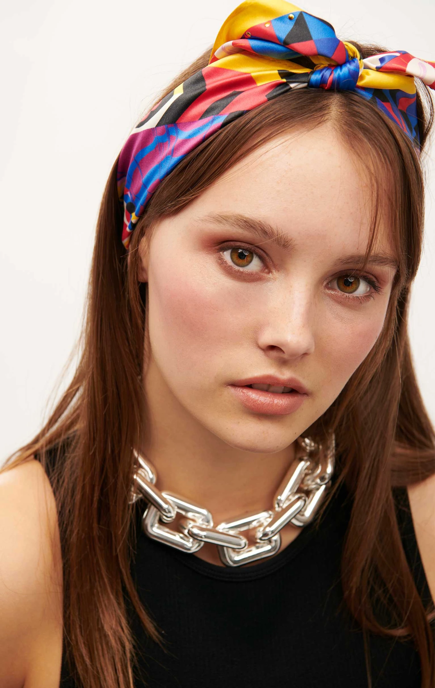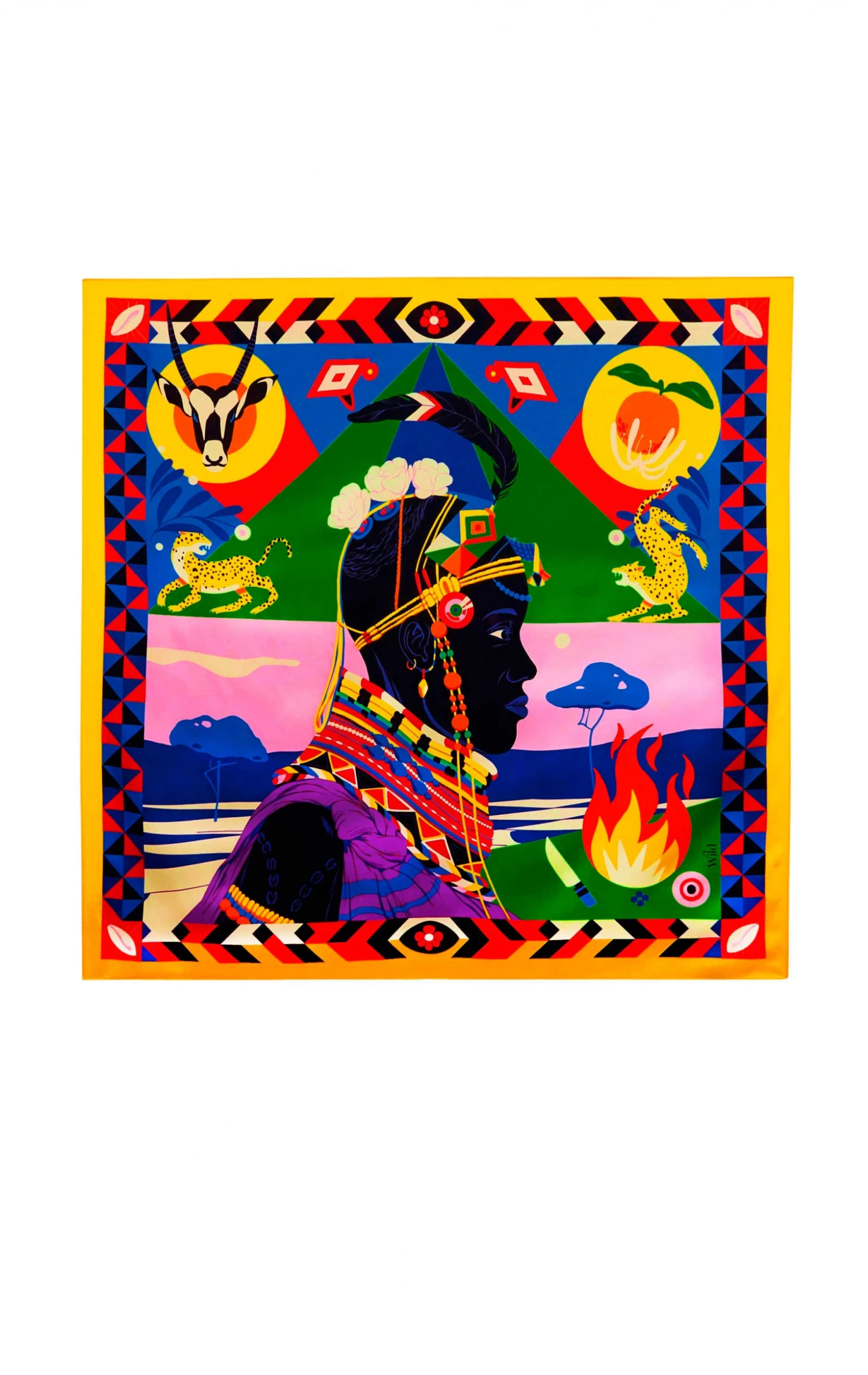 Nos foulards sont faits à la main et sont parés de dessins originaux destinés à sublimer votre garde-robe. Il vous est présenté ici un imprimé réalisé par un artiste indien Muhammed Sajidn, figurant un guerrier Massaï de profil, paré de bijoux, d’éléments tribaux presque guerriers, d’antilopes, dans un univers très géométrique, pop, et coloré. Il se décline dans des tonalités de bleu Klein, parme, violet, vert, rouge, noir, jaune. Peut se porter en foulard autour du cou, autour de votre poignet, ou encore autour de votre sac.