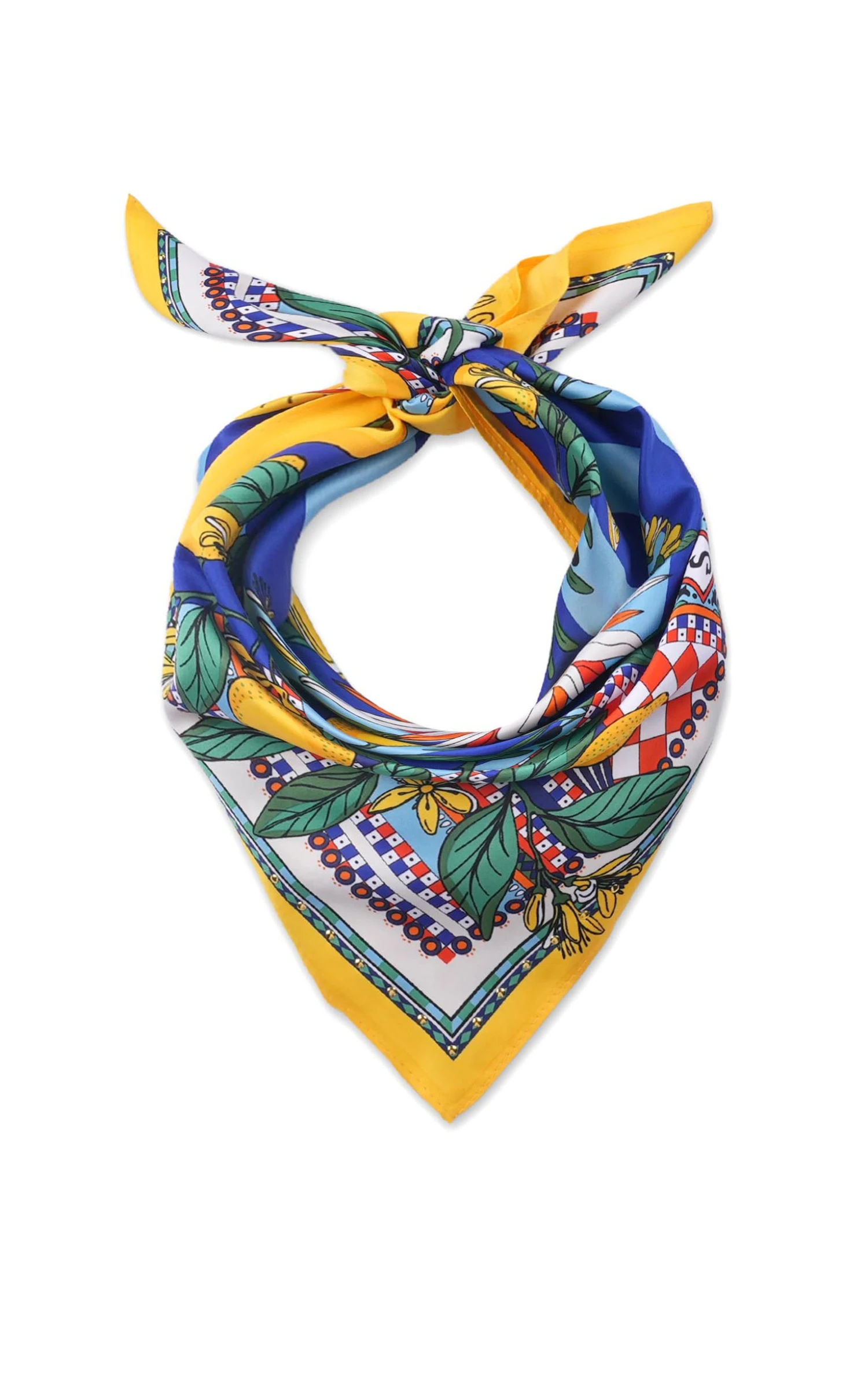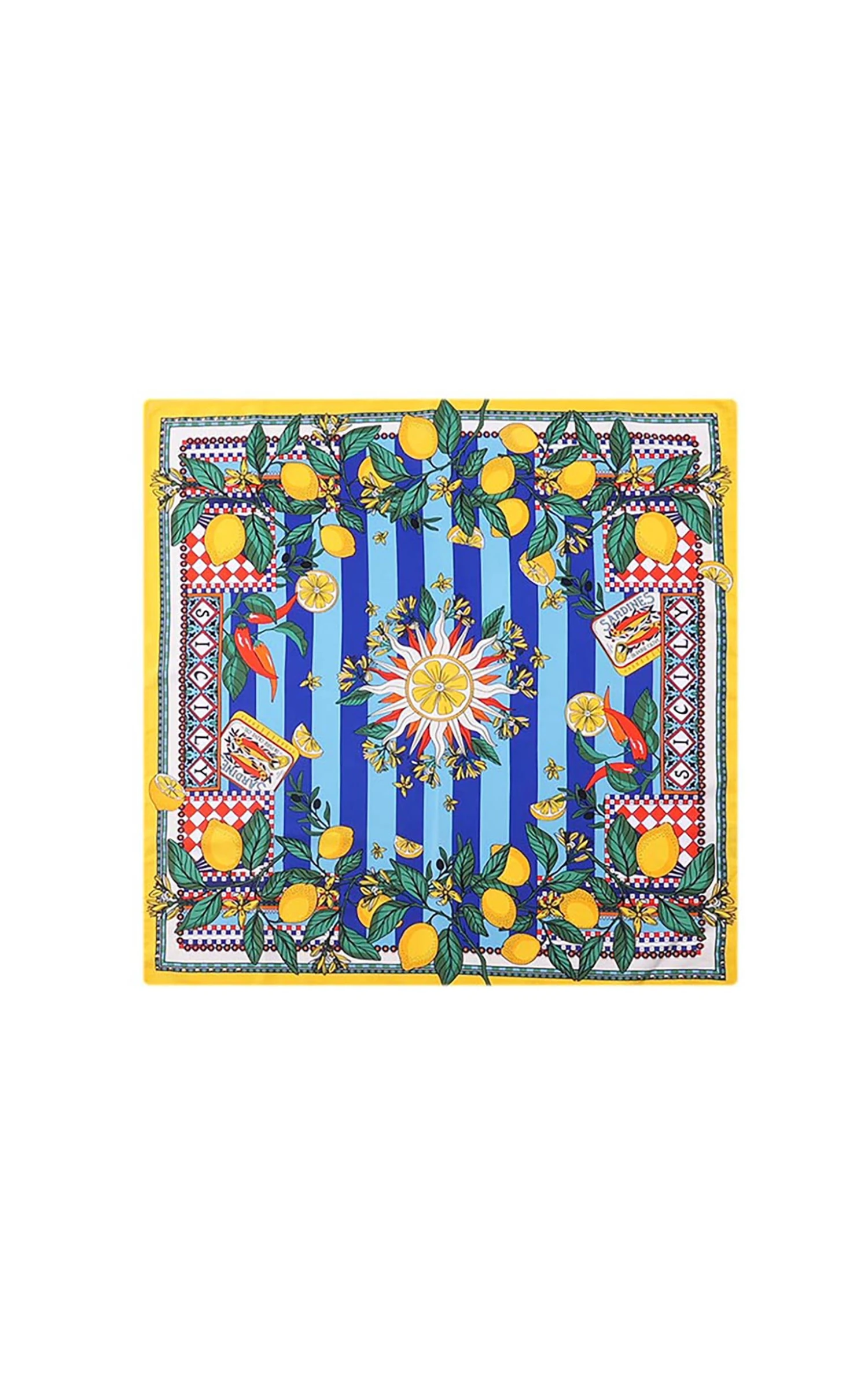 Vous est présenté ici l’imprimé Sicily, décliné en deux coloris, qui nous transporte avec une euphorie solaire dans le sud de l’Italie. Les éclatants citrons siciliens, accompagnés de boîtes de sardines, de piments rouge vif et de feuilles d’olivier, sont tous harmonieusement disposés sur un fond bleu ciel rayé de larges bandes bleu Klein.