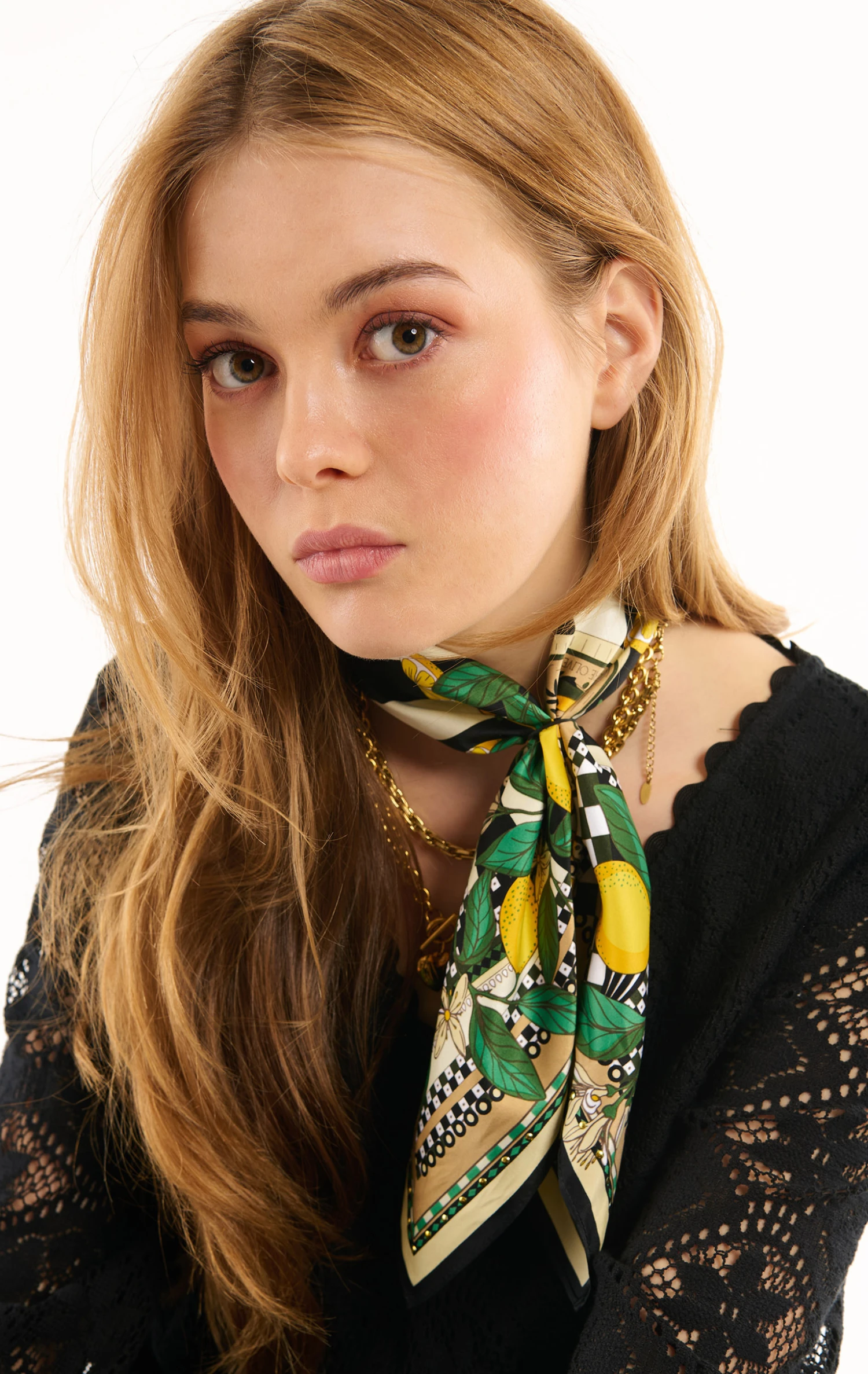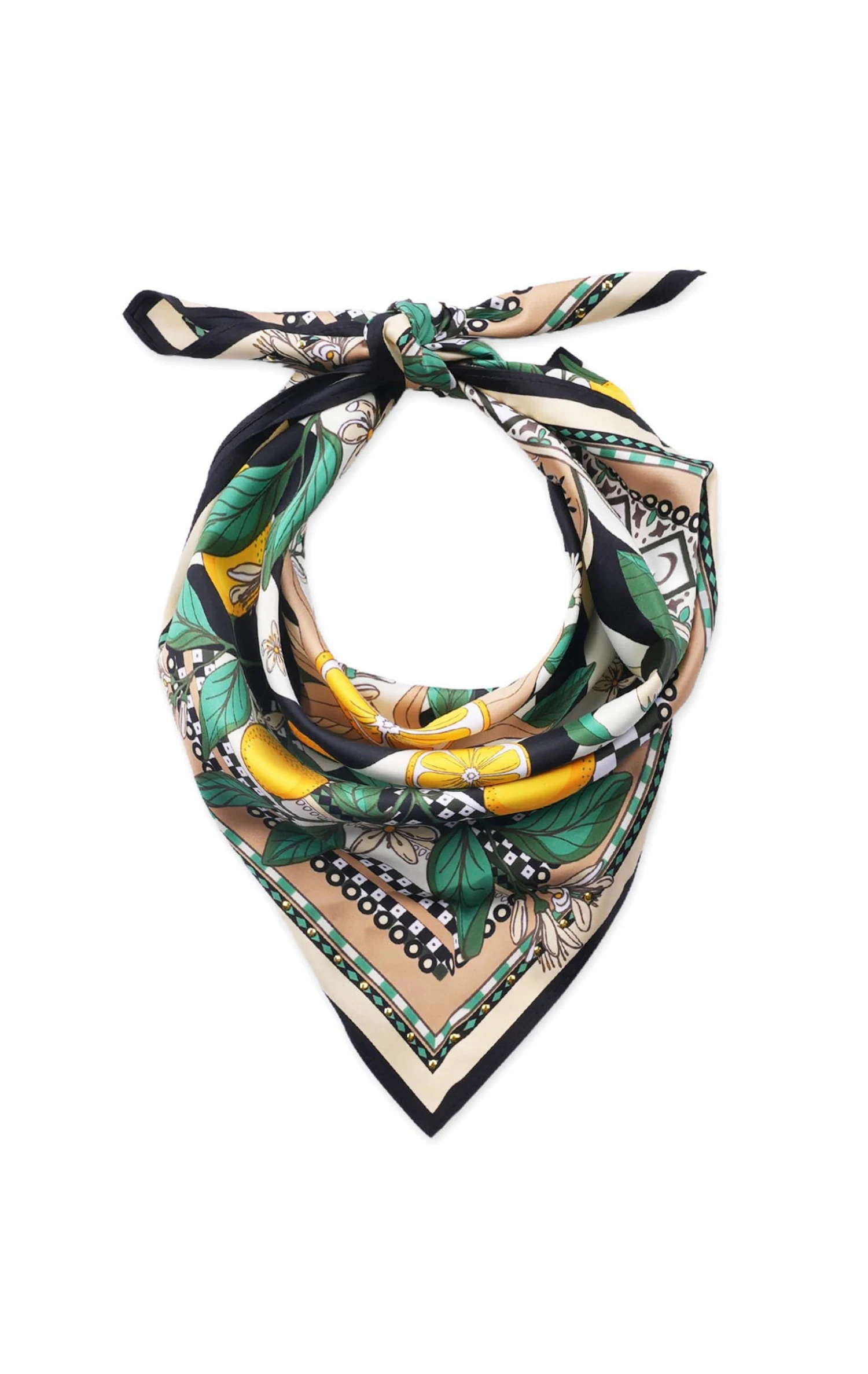 Vous est présenté ici l’imprimé Sicily, décliné en deux coloris, qui nous transporte avec une euphorie solaire dans le sud de l’Italie. Les éclatants citrons siciliens, accompagnés de boîtes de sardines, de piments rouge vif et de feuilles d’olivier, sont tous harmonieusement disposés sur un fond blanc rayé de larges bandes noires.