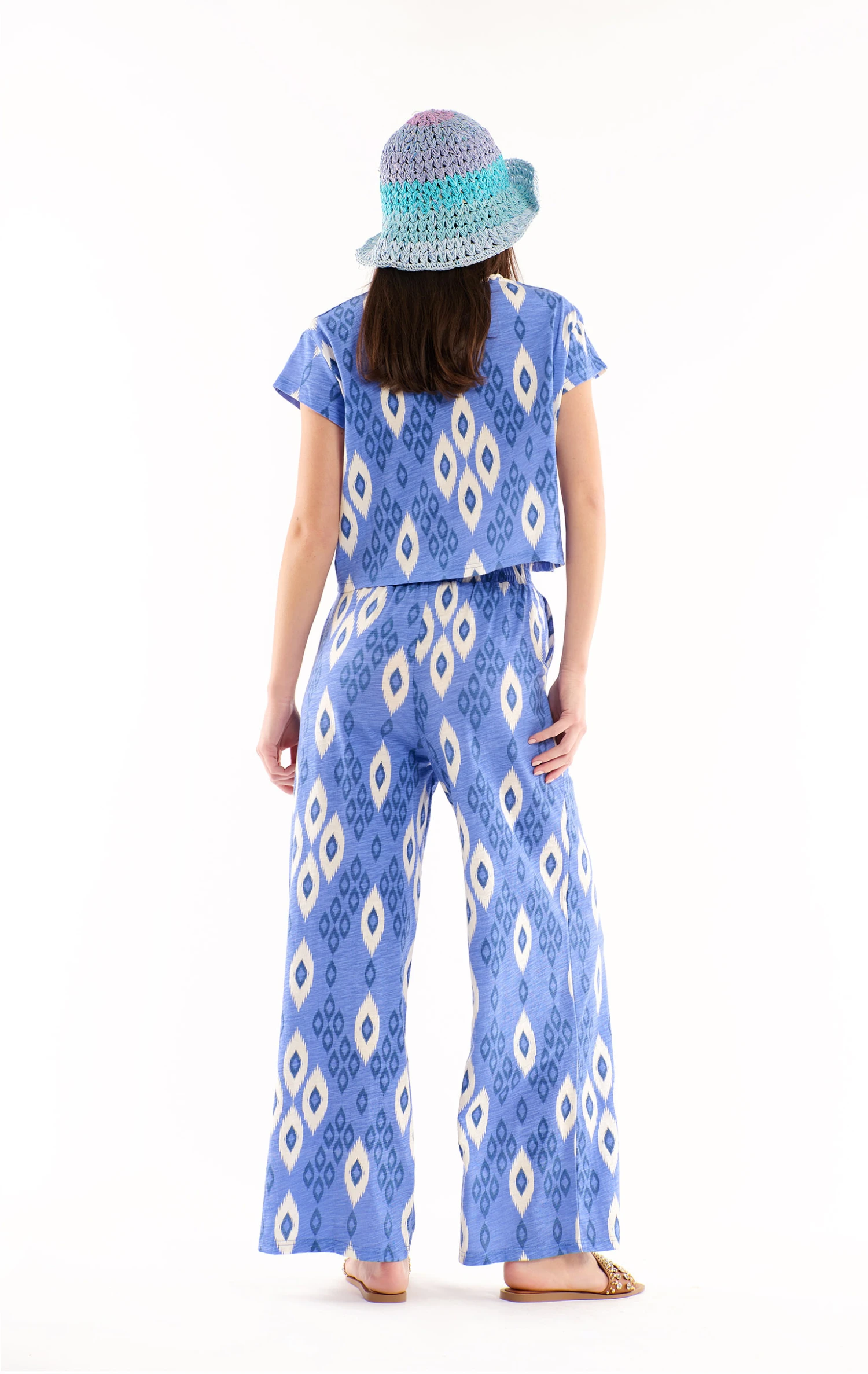 Dans ce nouveau thème jersey, l’été est synonyme de confort et de féminité et d’imprimés ensoleillés. Le pantalon Alessandro, confectionné dans un coton bleu cobalt ultra agréable dont les motifs solaires bleu pétrole et beige en all over lui donnent un côté baba cool chic qu’on adore. Ample, avec ses poches sur le côté et sa ceinture élastiquée, il est d’un confort ultime et s’assortit avec le top Amandine pour un été élégant, sans effort…