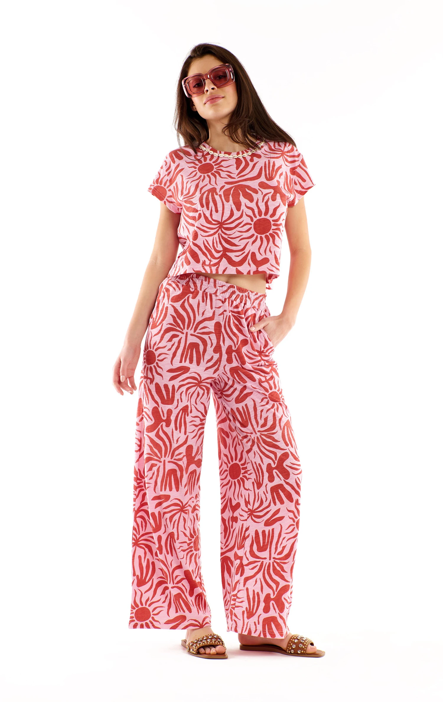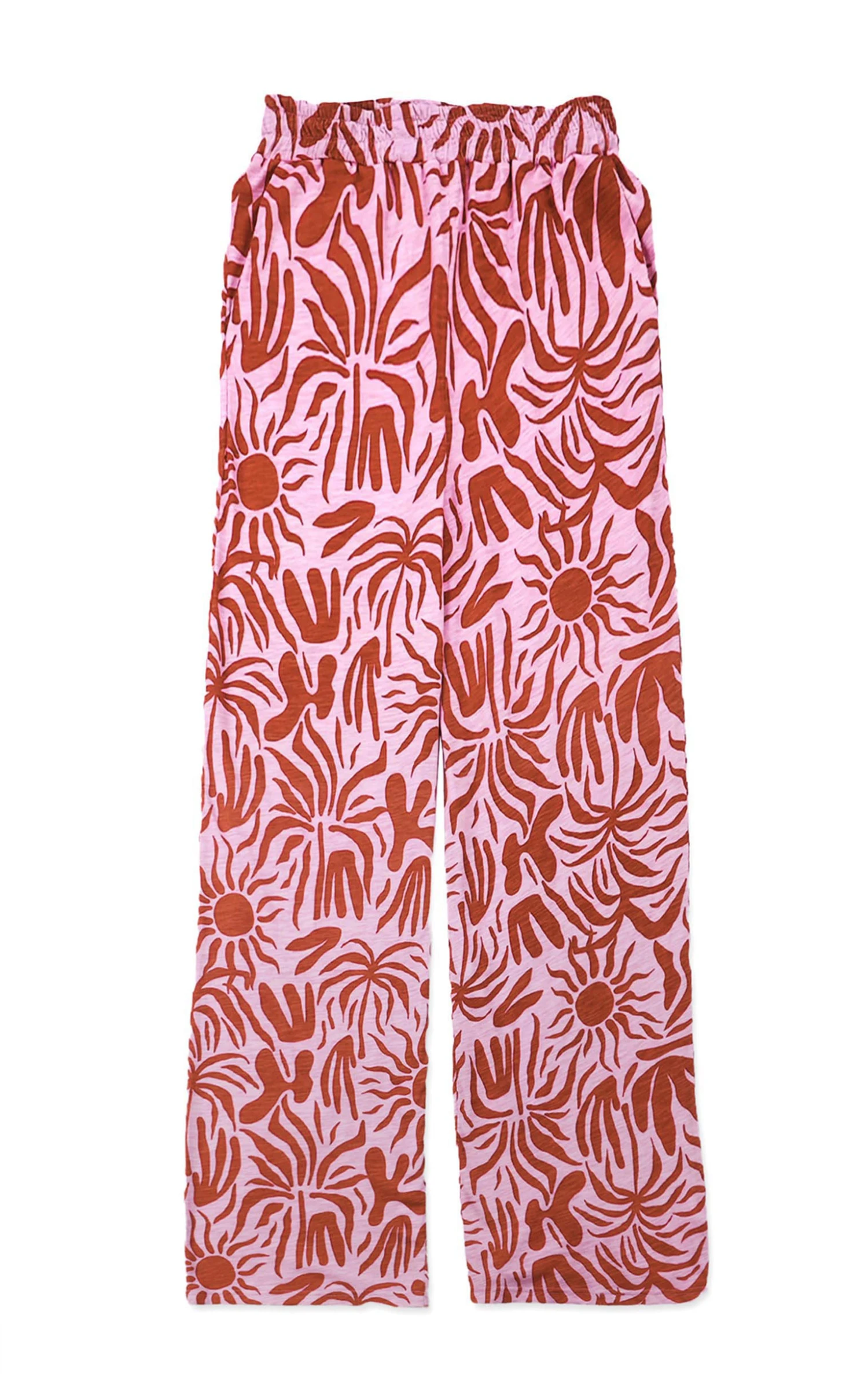 Dans ce nouveau thème jersey, l’été est synonyme de confort et de féminité et d’imprimés ensoleillés. Le pantalon Alessandro, confectionné dans un coton rose ultra agréable dont les motifs solaires et floraux couleur brique en all over lui donnent un côté baba cool chic qu’on adore. Ample, avec ses poches sur le côté et sa ceinture élastiquée, il est d’un confort ultime et s’assortit avec le top Amandine pour un été élégant, sans effort…