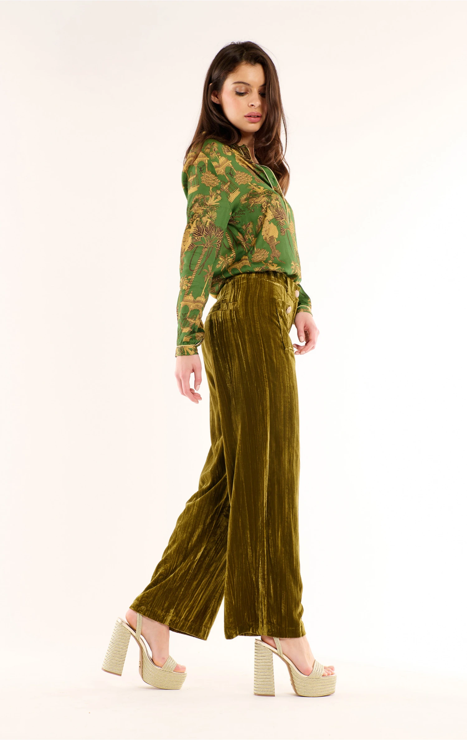 Son velours souple lui confère une élégance chic, tandis que l’absence de poches assure une belle fluidité sans compromettre la silhouette. Notre imprimé emblématique Jaipur s’est glissé sur la ceinture élastiquée et apporte ainsi une douce sophistication à l’ensemble. Associé à la veste assortie Kim, il se pare d’une élégance rétro exceptionnelle. Il se décline en 5 couleurs, ici dans un velours vert olive.