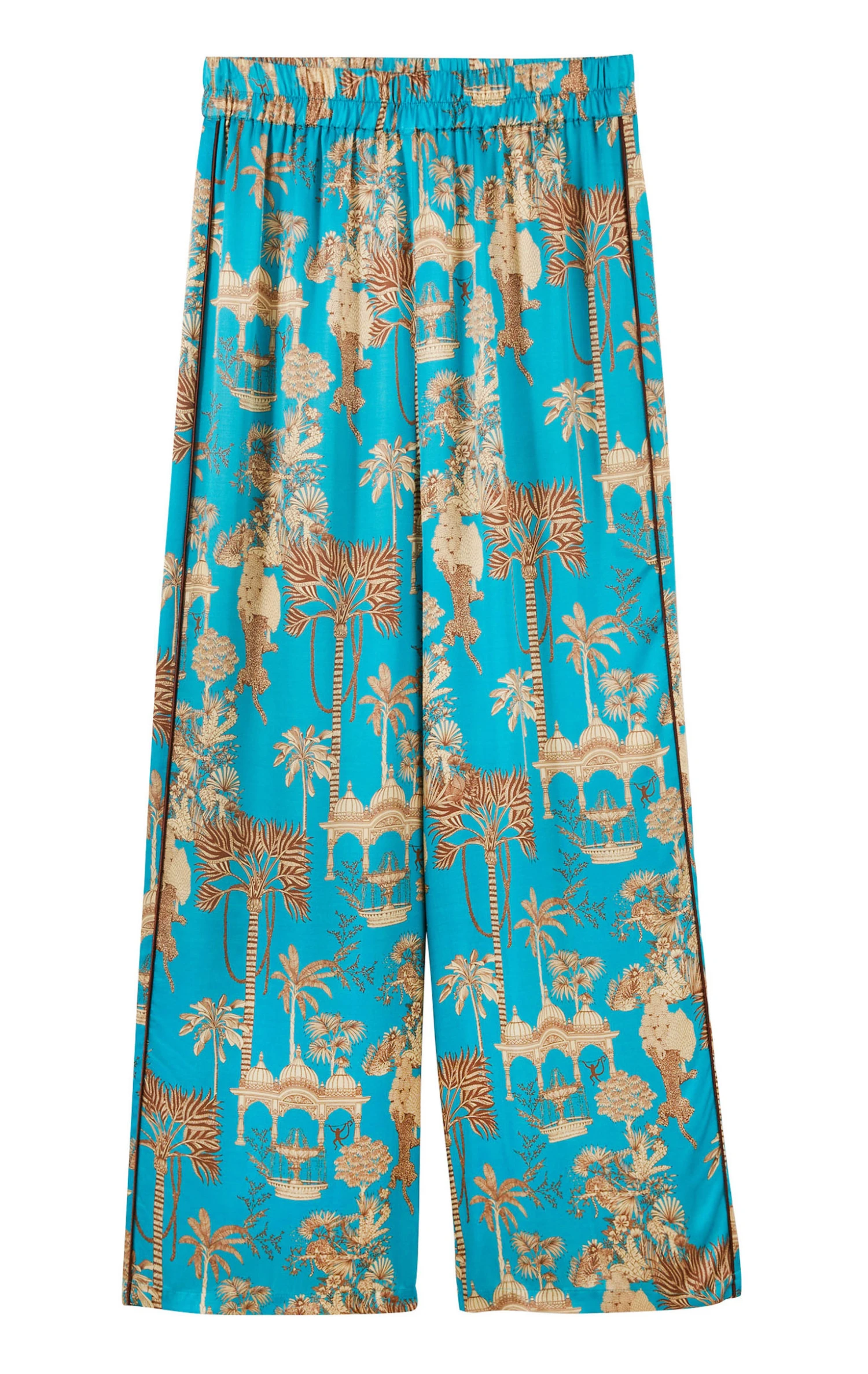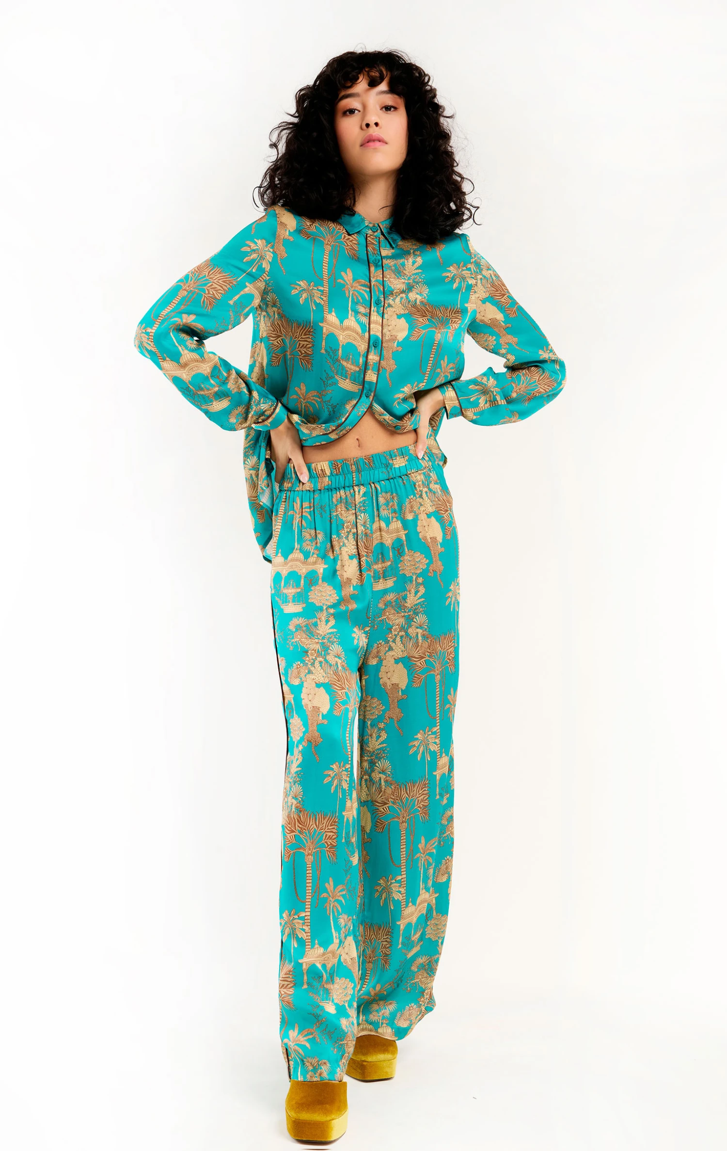 Les tons chauds et luxuriants s’harmonisent avec des nuances plus subtiles et raffinées sur notre imprimé Jaipur. Notre emblématique pantalon Rohan, à la fois chic et confortable grâce à sa couple ample élastiquée à la taille, offre une élégance décontractée avec son imprimé rétro des années 60 et son piping le long de la jambe. Pile poil dans la tendance pyjama de ville, il se mixe avec la chemise Mani pour un total look. Disponible en 5 couleurs, ce modèle, ici dans un turquoise profond aux motifs vanille et café, est la pièce incontournable de votre vestiaire hivernal.