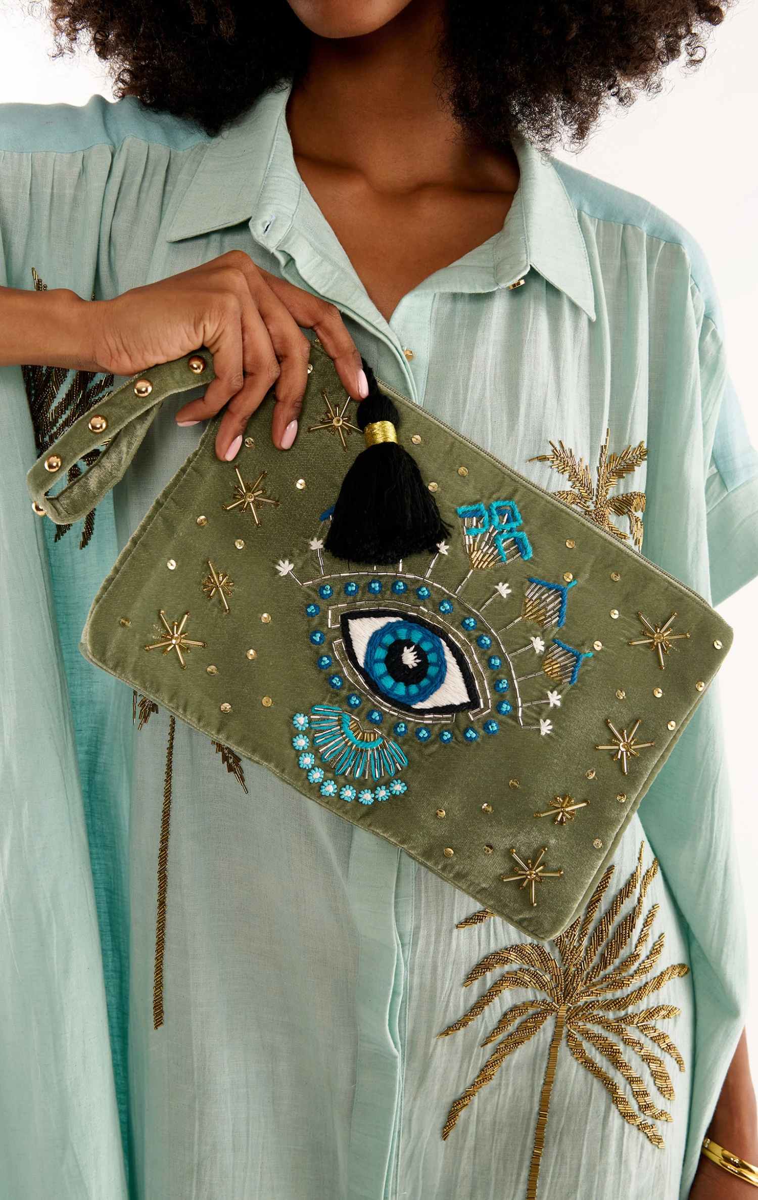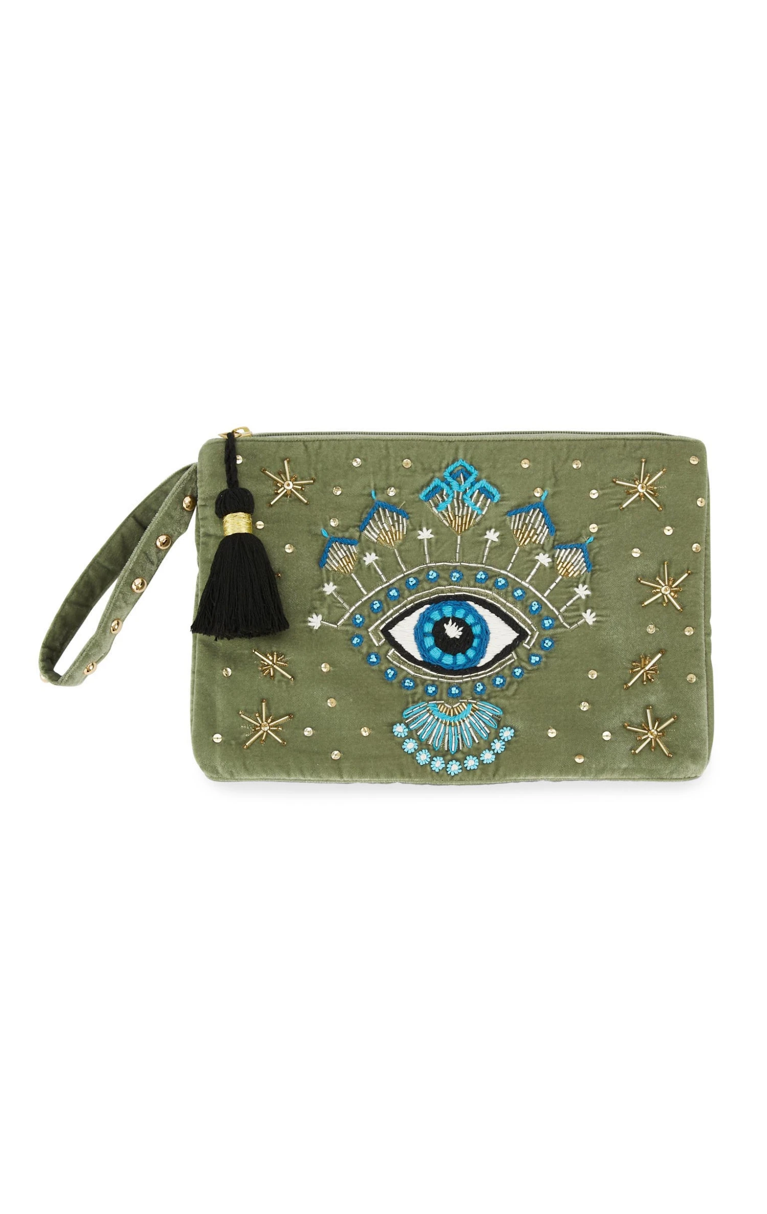 La version kaki est intégralement confectionnée d’un velours uni kaki sur lequel une magnifique broderie de notre iconique œil protecteur se révèle dans un bleu cyan lumineux. De part et d’autre de la broderie, une constellation d’étoiles stylisées illumine la pochette et le pompon noir dont se pare le puller ajoute la touche de chic essentiel à ce superbe accessoire.