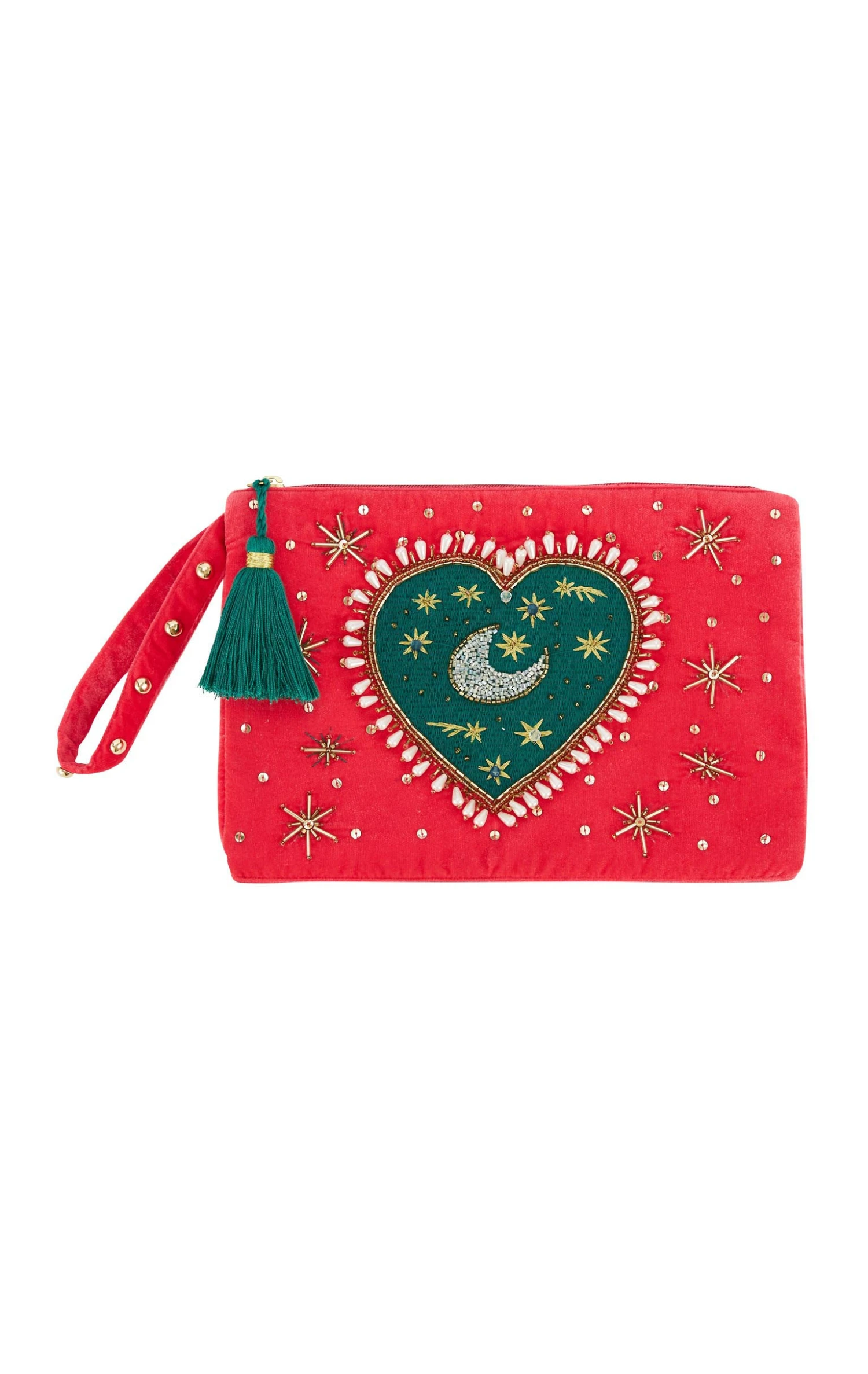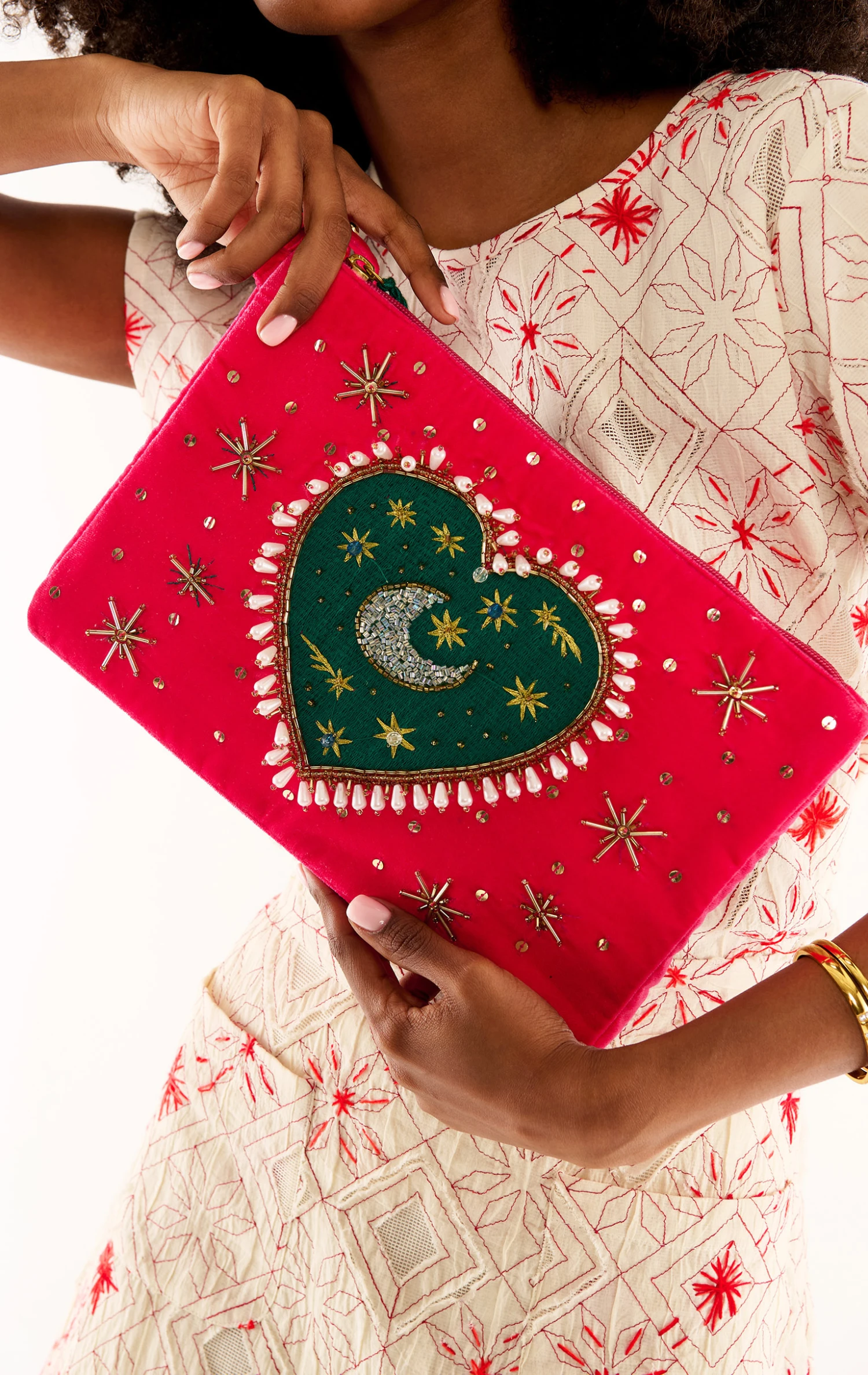 La version rose est intégralement confectionnée d’un velours uni rose intense sur lequel une magnifique broderie d’un cœur baroque se révèle dans un joli vert bouteille réhaussé de perles blanc nacré, rappelant les perles de culture. De part et d’autre de la broderie, une constellation d’étoiles stylisées illumine la pochette et le pompon dont se pare le puller ajoute la touche de chic essentiel à ce superbe accessoire.