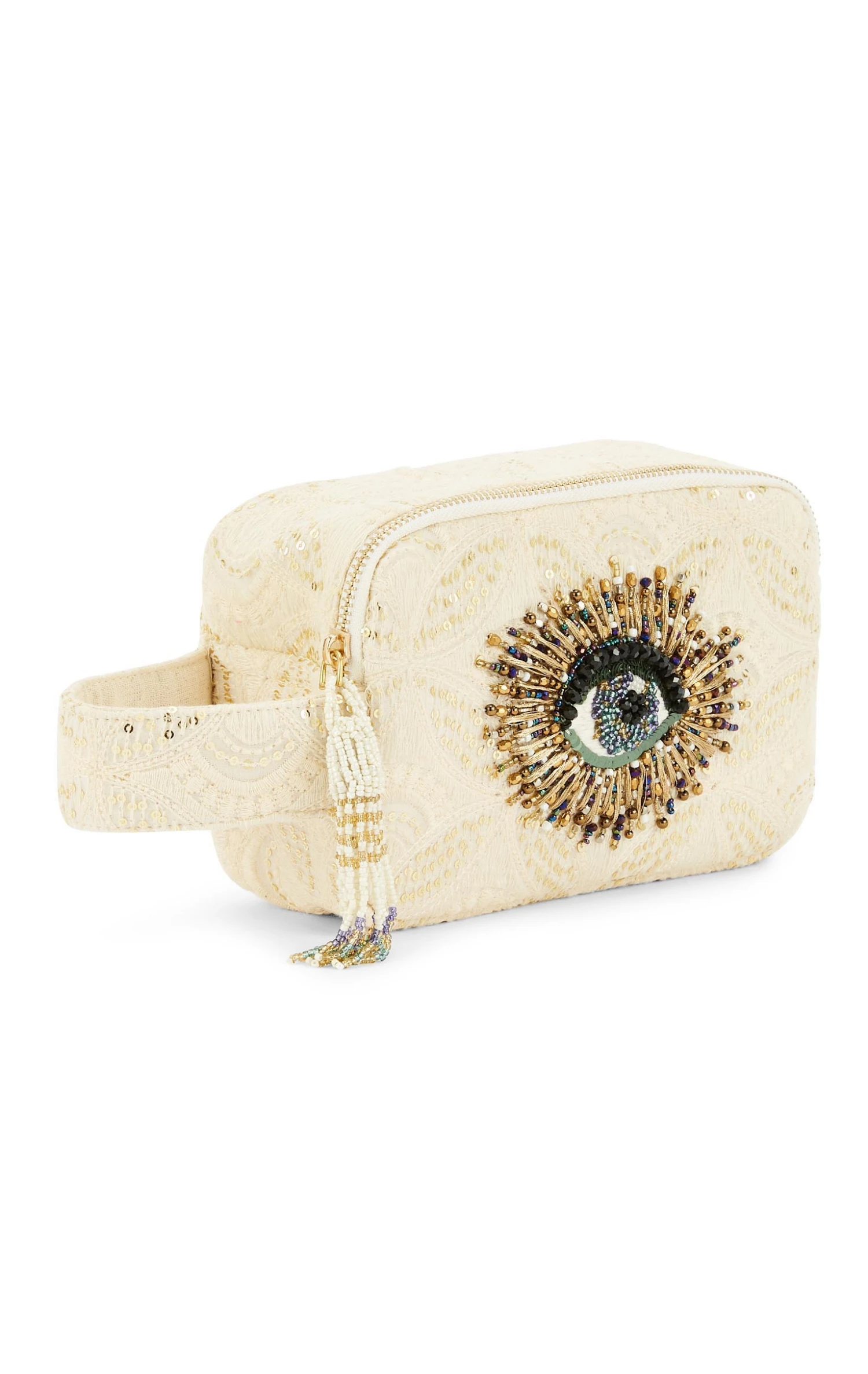 La trousse Lucian, aux allures de vanity chic, reprend les codes de notre thème Comète et se pare de ses motifs de constellation entièrement brodés. Son puller réhaussé d’un très joli pompon en perles de rocaille parfait cette pièce précieuse et unique.