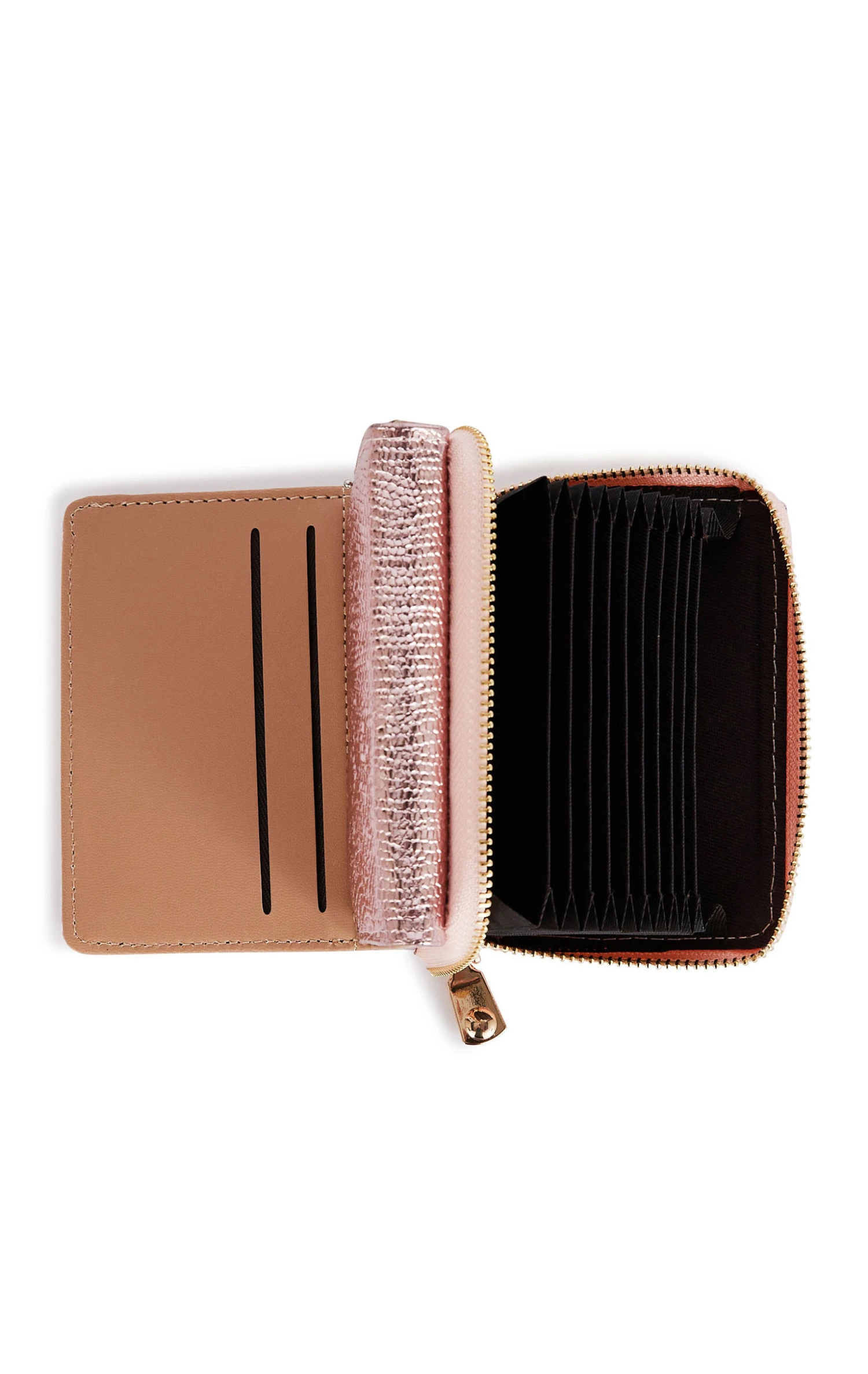 De forme rectangulaire, il se compose d’une partie porte cartes et d’une partie porte monnaie. Très pratique grâce à son zip et à son bouton pression,il est confectionné, à l’instar de notre banane Tilda, dans un faux cuir métallique à la texture subtilement lézard. Décliné en 5 couleurs, il est ici dans la version rose cuivré.