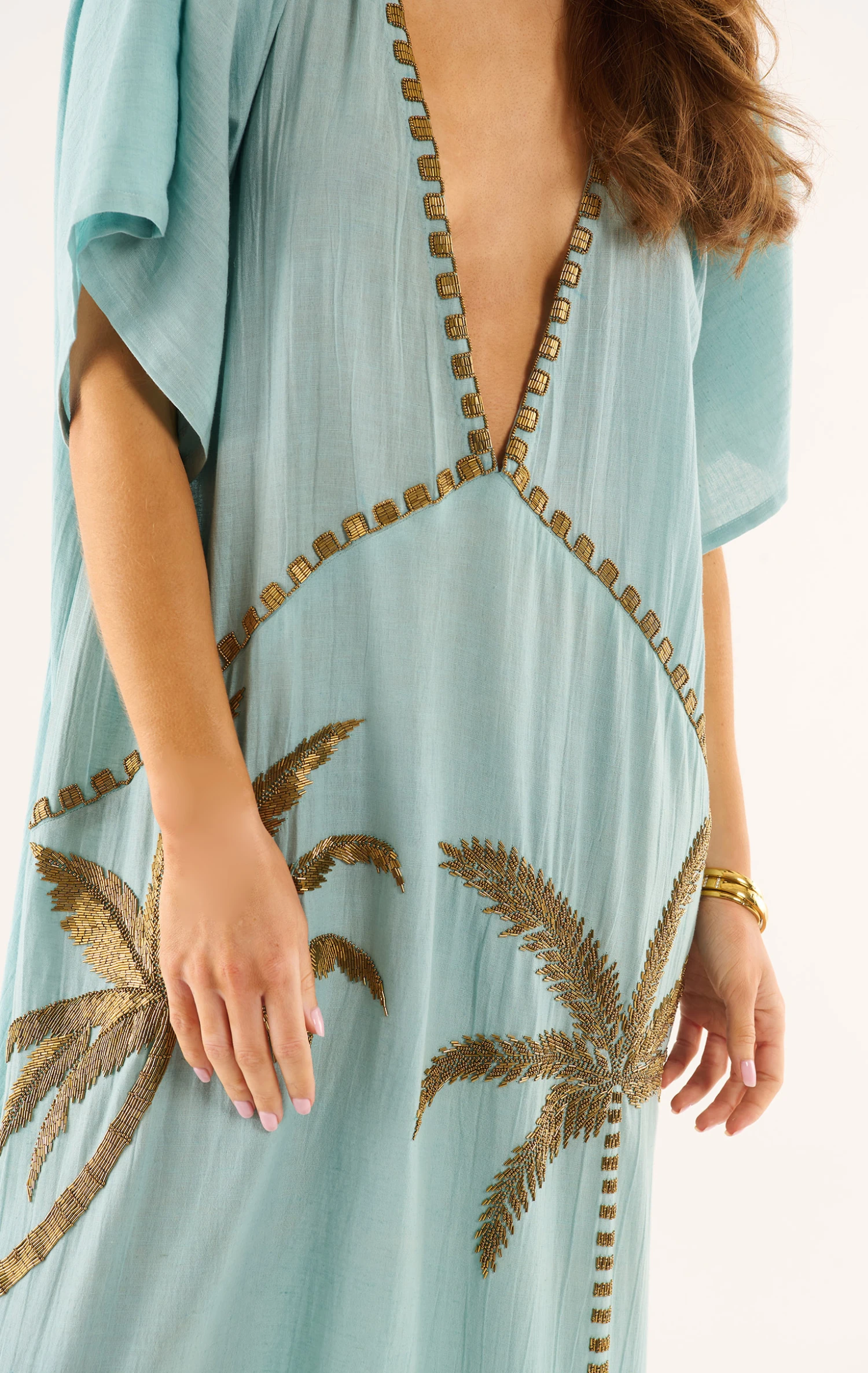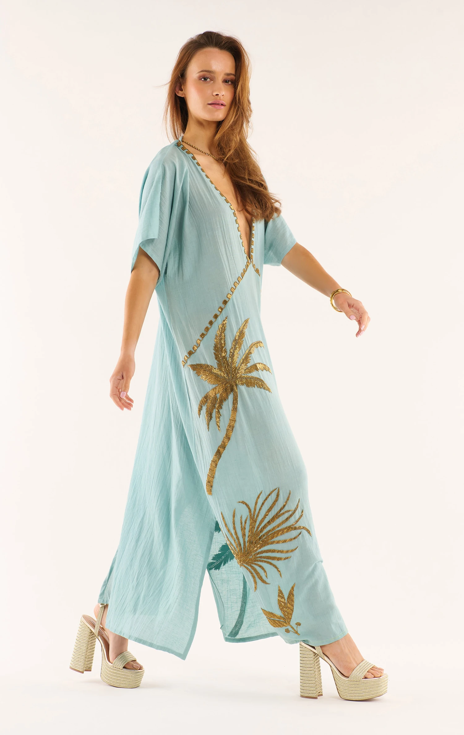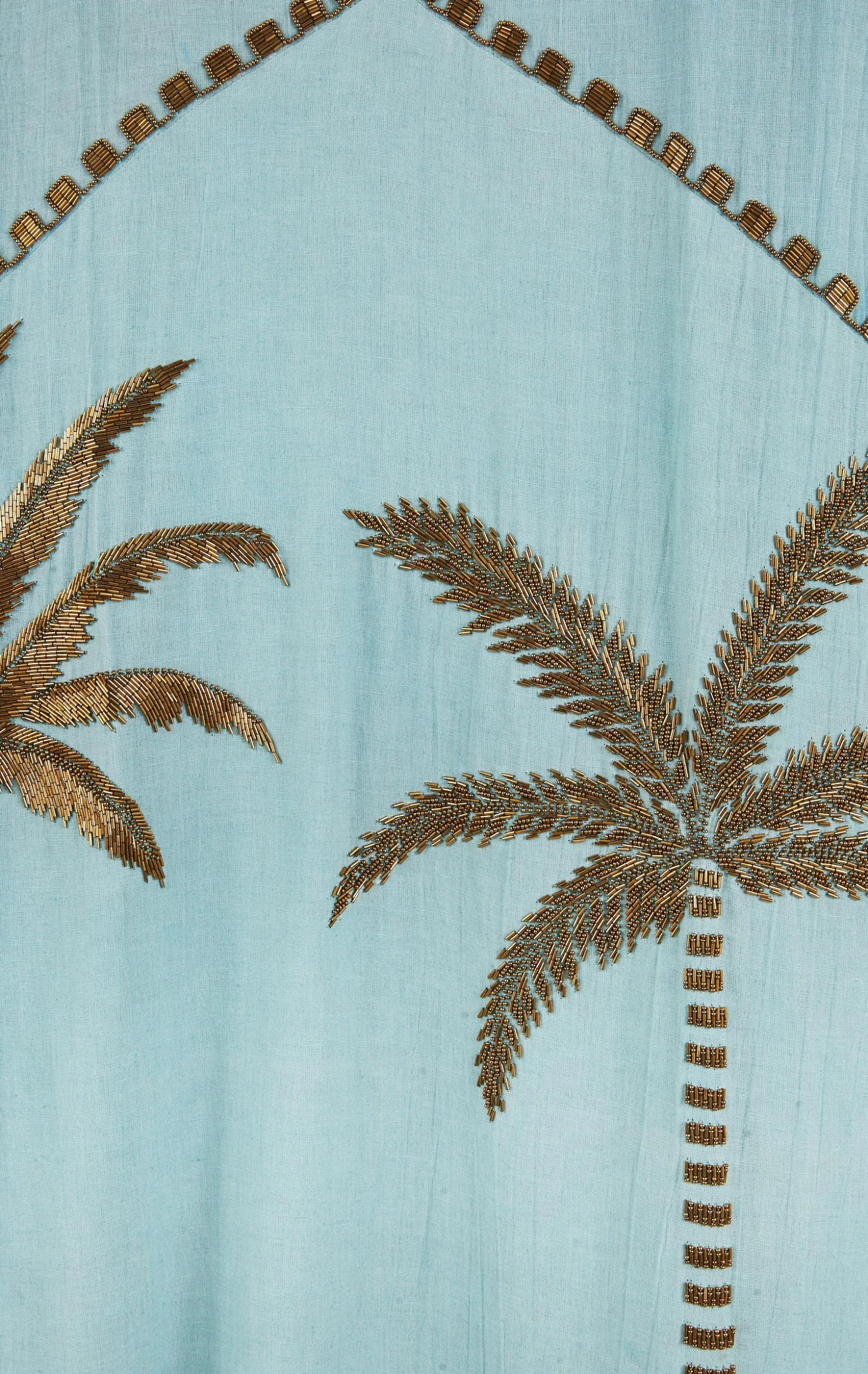 De forme caftan – djellabah réinterprétée « bijou », la robe Annie se distingue par son incroyable volume et sa confection en gaze de coton. Son devant est magnifiquement orné de perles de rocaille dorées et gun, illustrant des motifs de palmiers exceptionnels, témoignant d’un travail artisanal remarquable. Ouverte sur chaque côté, elle descend jusqu’aux chevilles, renforçant ainsi le volume précieux de la djellabah. Ultra féminine, elle arbore un décolleté en V profond et des manches courtes.
