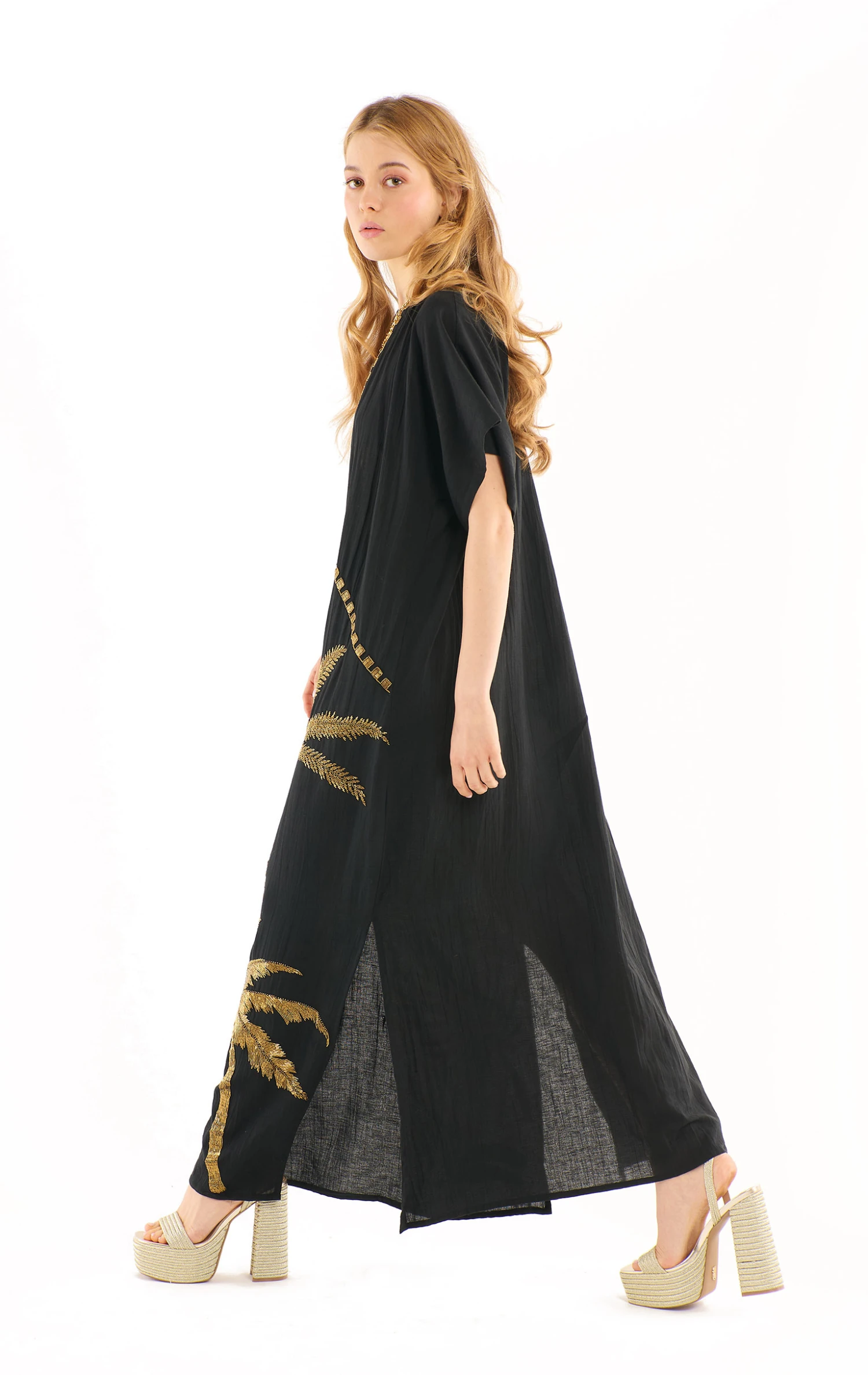 De forme caftan – djellabah réinterprétée « bijou », la robe Annie se distingue par son incroyable volume et sa confection en gaze de coton. Son devant est magnifiquement orné de perles de rocaille dorées et gun, illustrant des motifs de palmiers exceptionnels, témoignant d’un travail artisanal remarquable. Ouverte sur chaque côté, elle descend jusqu’aux chevilles, renforçant ainsi le volume précieux de la djellabah. Ultra féminine, elle arbore un décolleté en V profond et des manches courtes.