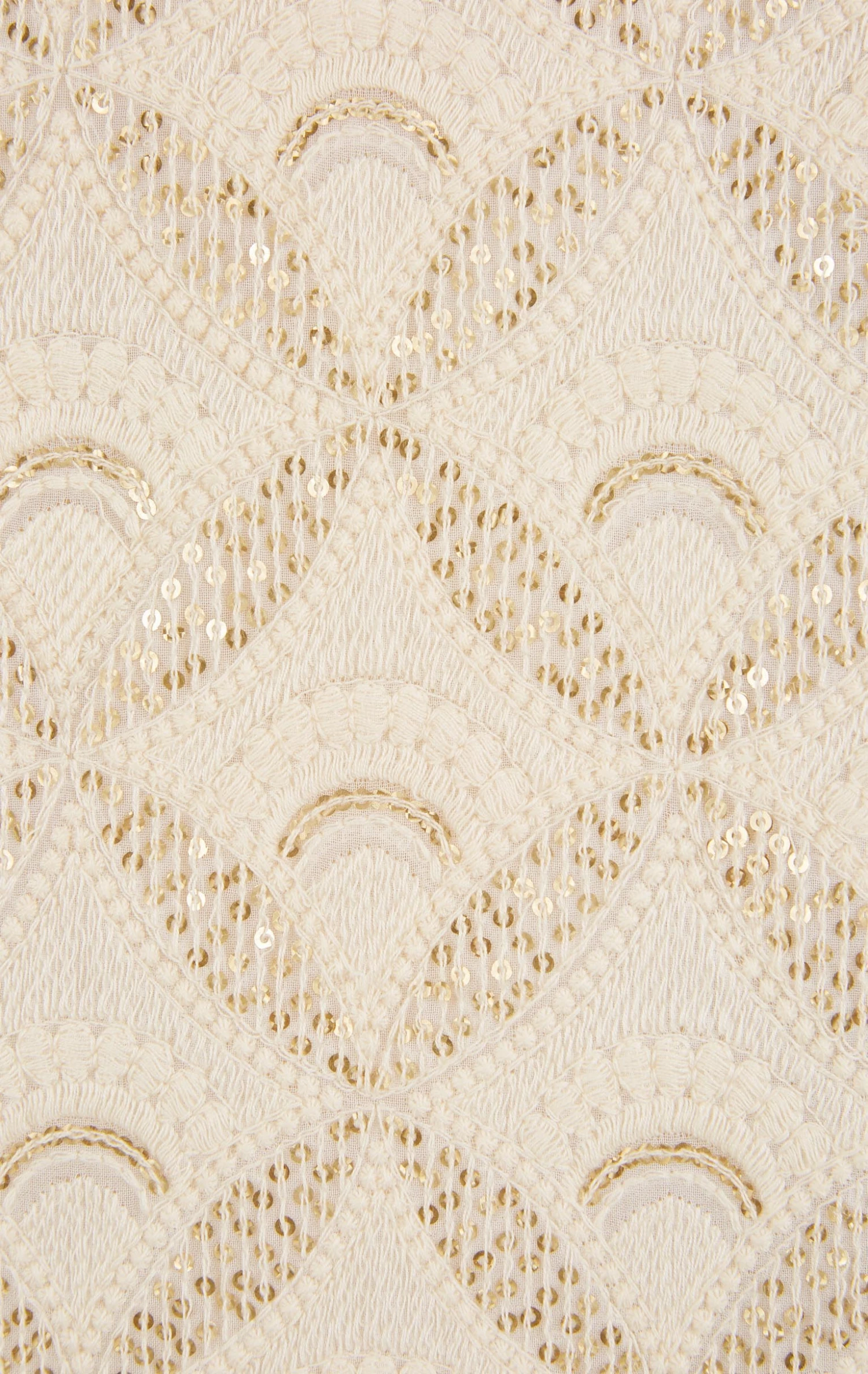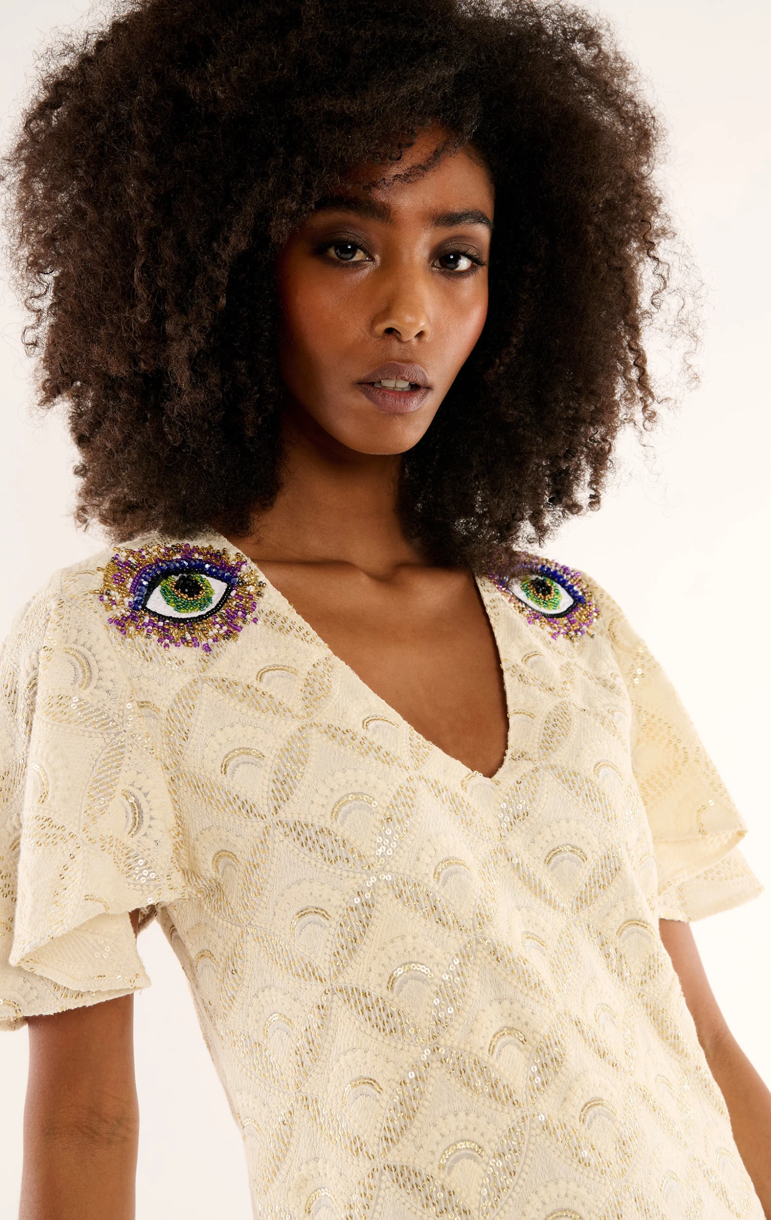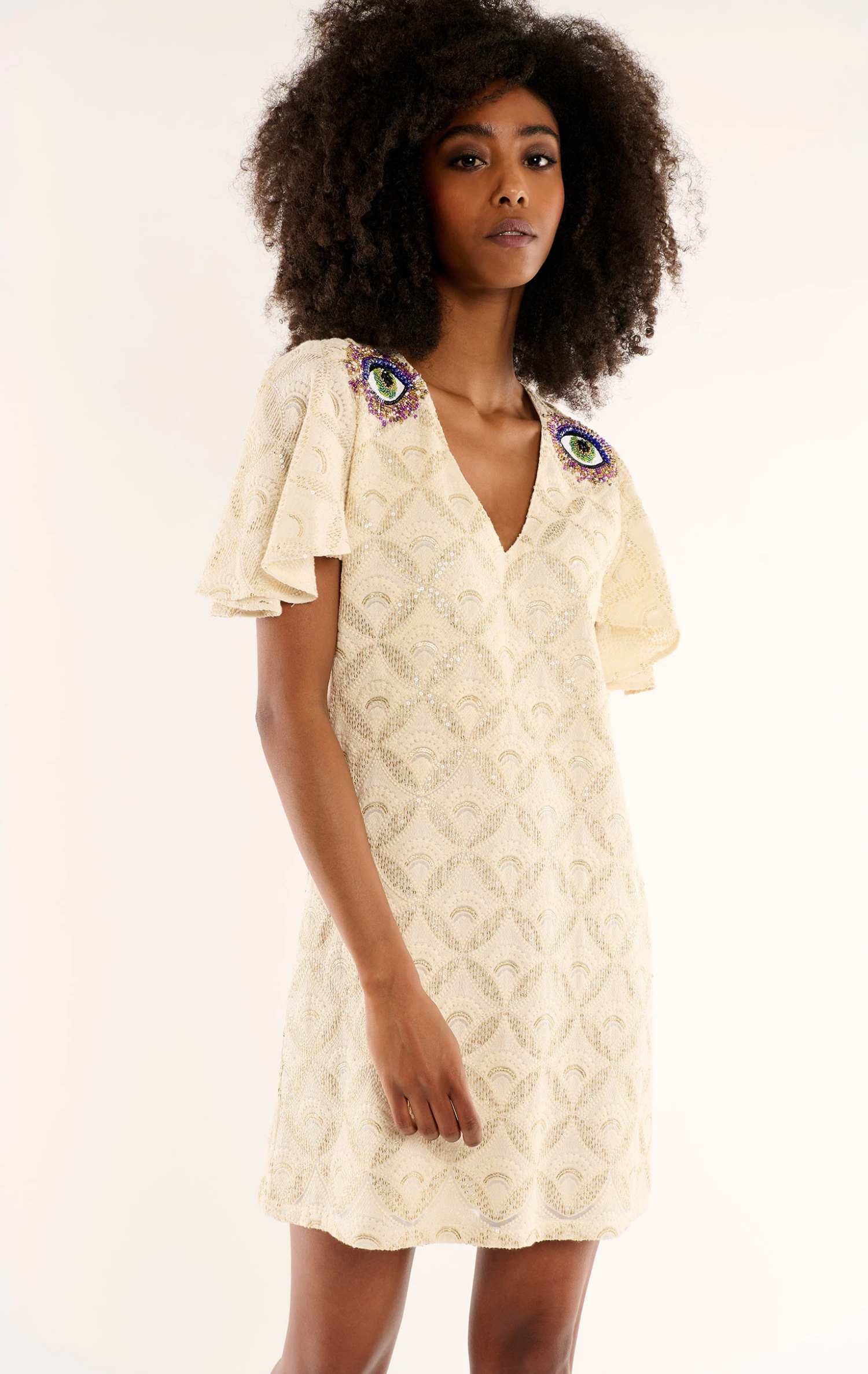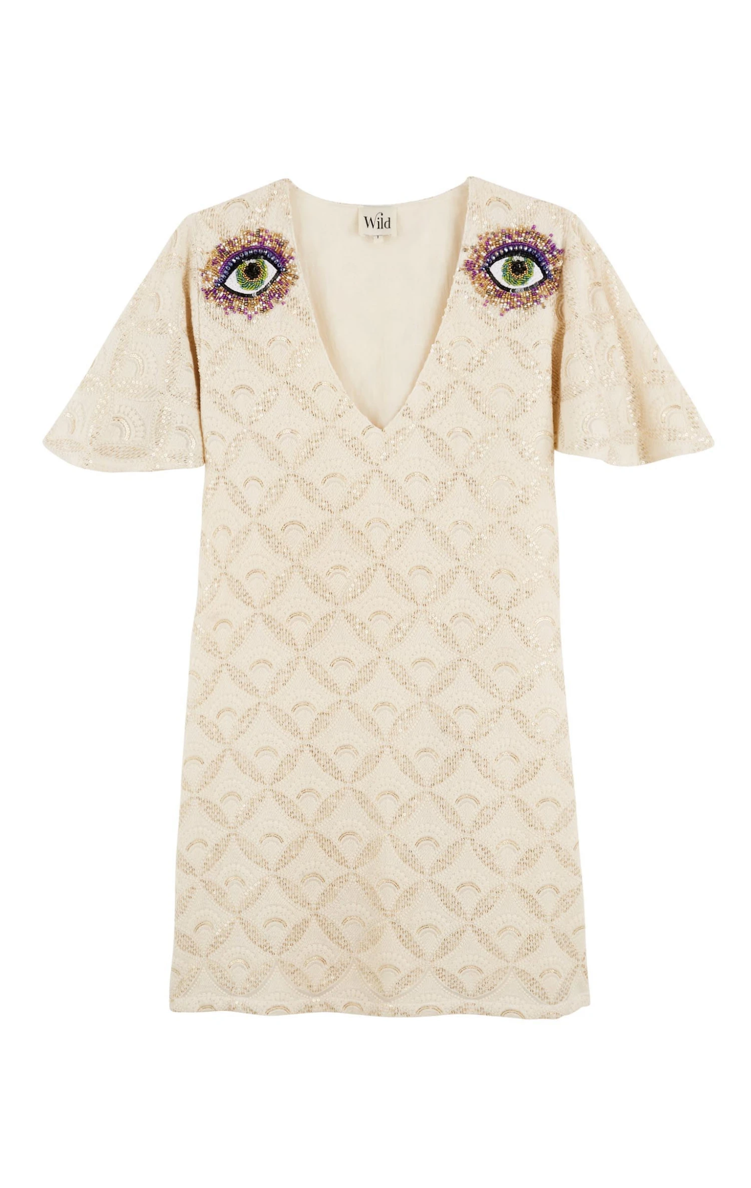 La robe Barbara est une ravissante pièce en viscose de coton entièrement rebrodée de formes florales graphiques et de lumineux sequins. Le caractère bohème du thème est souligné par les deux yeux brodés de perles vertes, violettes et noires qu’elle arbore de part et d’autre des épaules. Son col en V et ses manches « papillon » courtes et évasées lui donnent une allure résolument féminine. Sa doublure en voile de coton permet de conserver sa fluidité, tout en assurant une douceur parfaite au porté. Sa coupe est droite, elle s’arrête au-dessus du genou et se décline en trois couleurs, blanc cassé, noir et bleu.